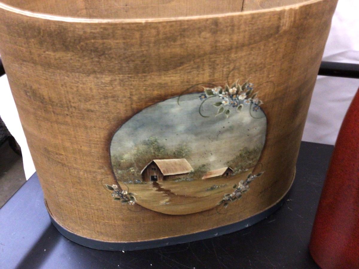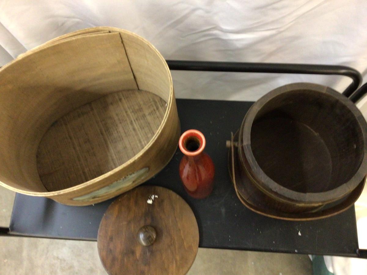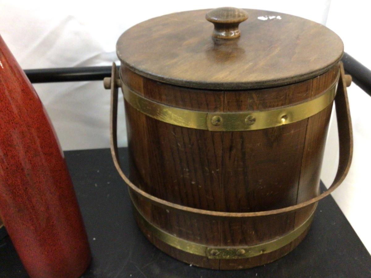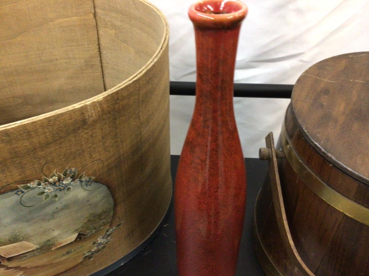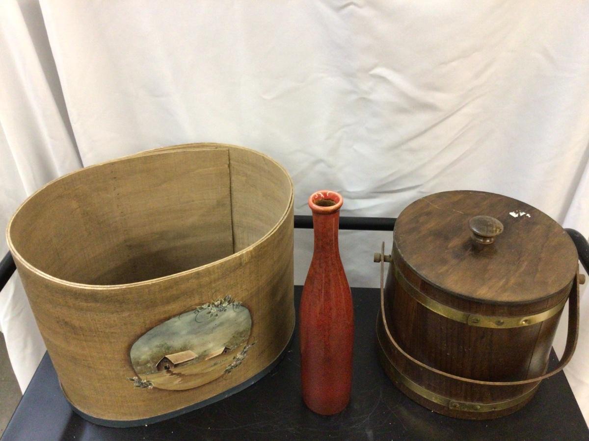 You get a wood shaker oval box no lid, wood ice bucket and red modern decorative vase.