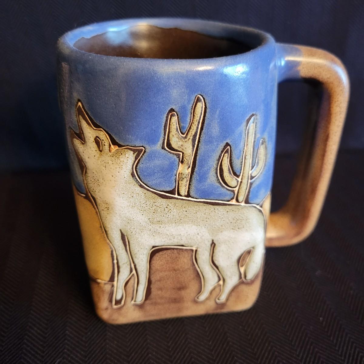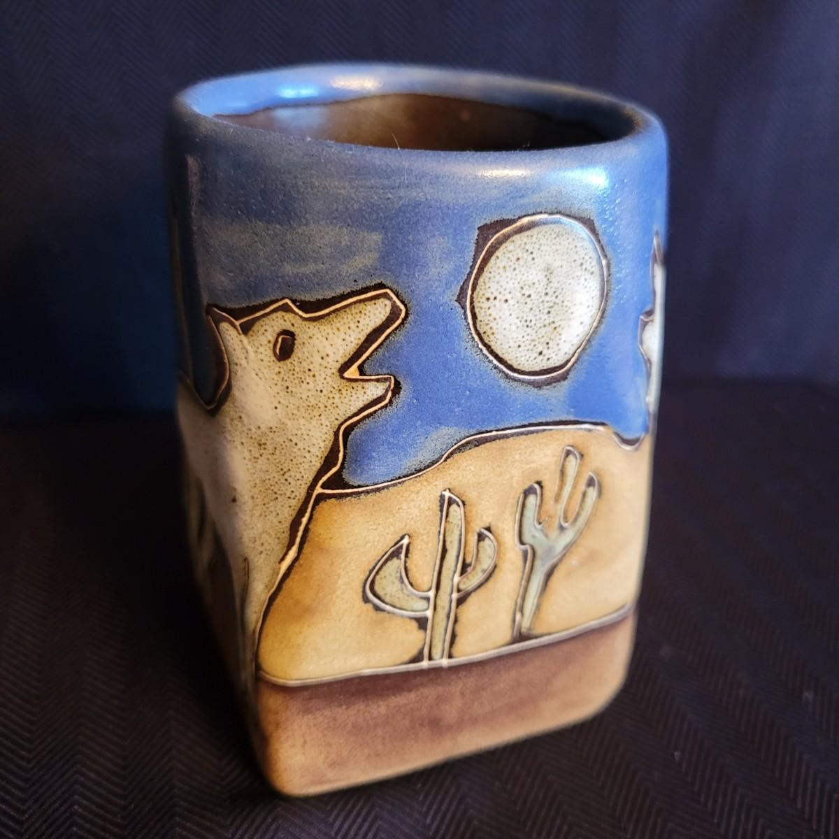 An assortment of three decorative tiles and signed coffee cup. The largest tile measures approximately 6" x 7.5"H. Shipping available