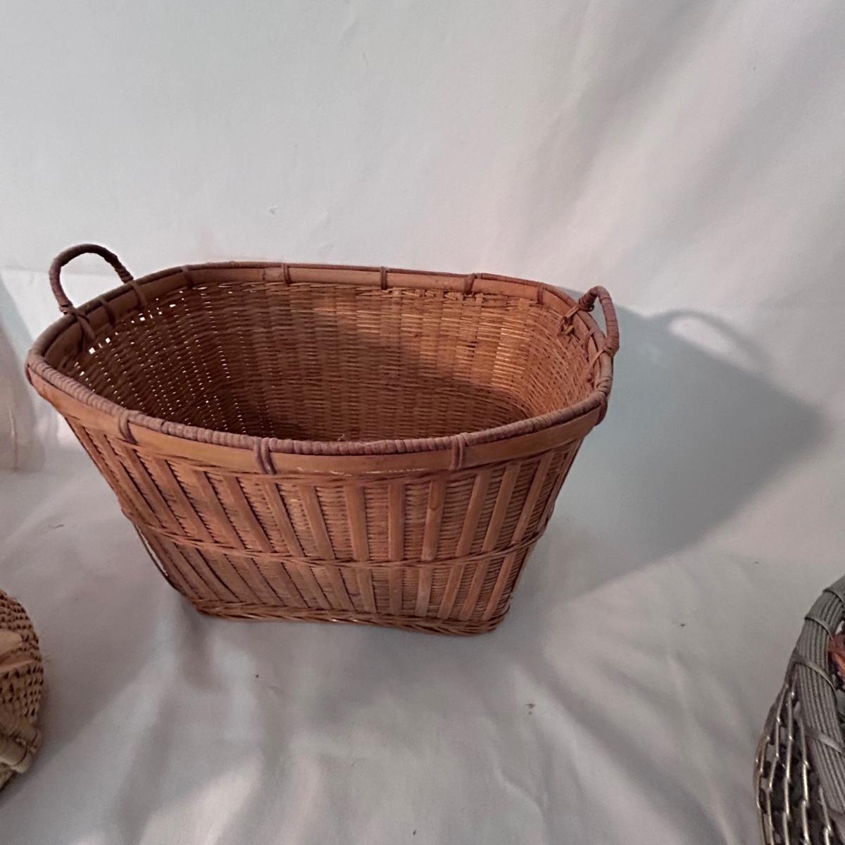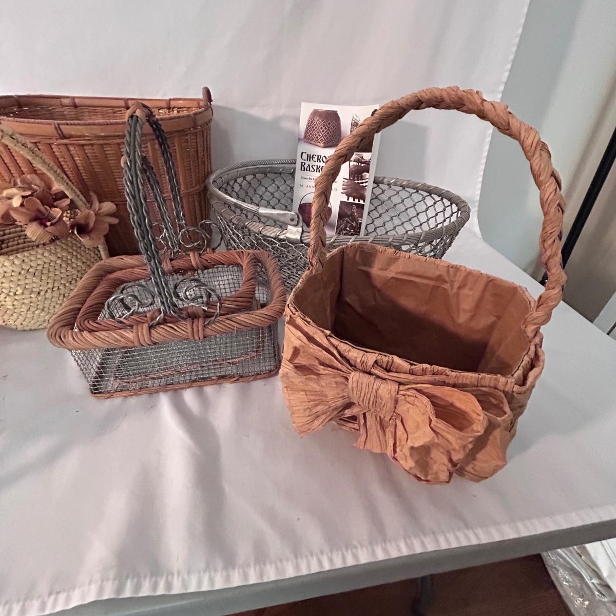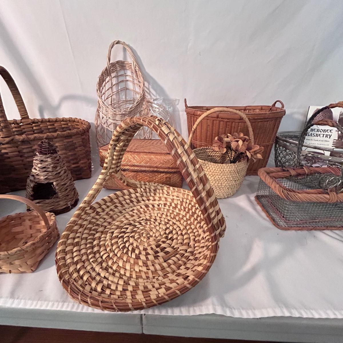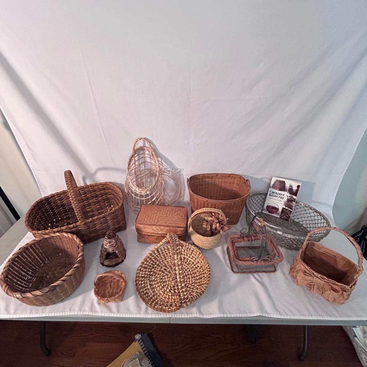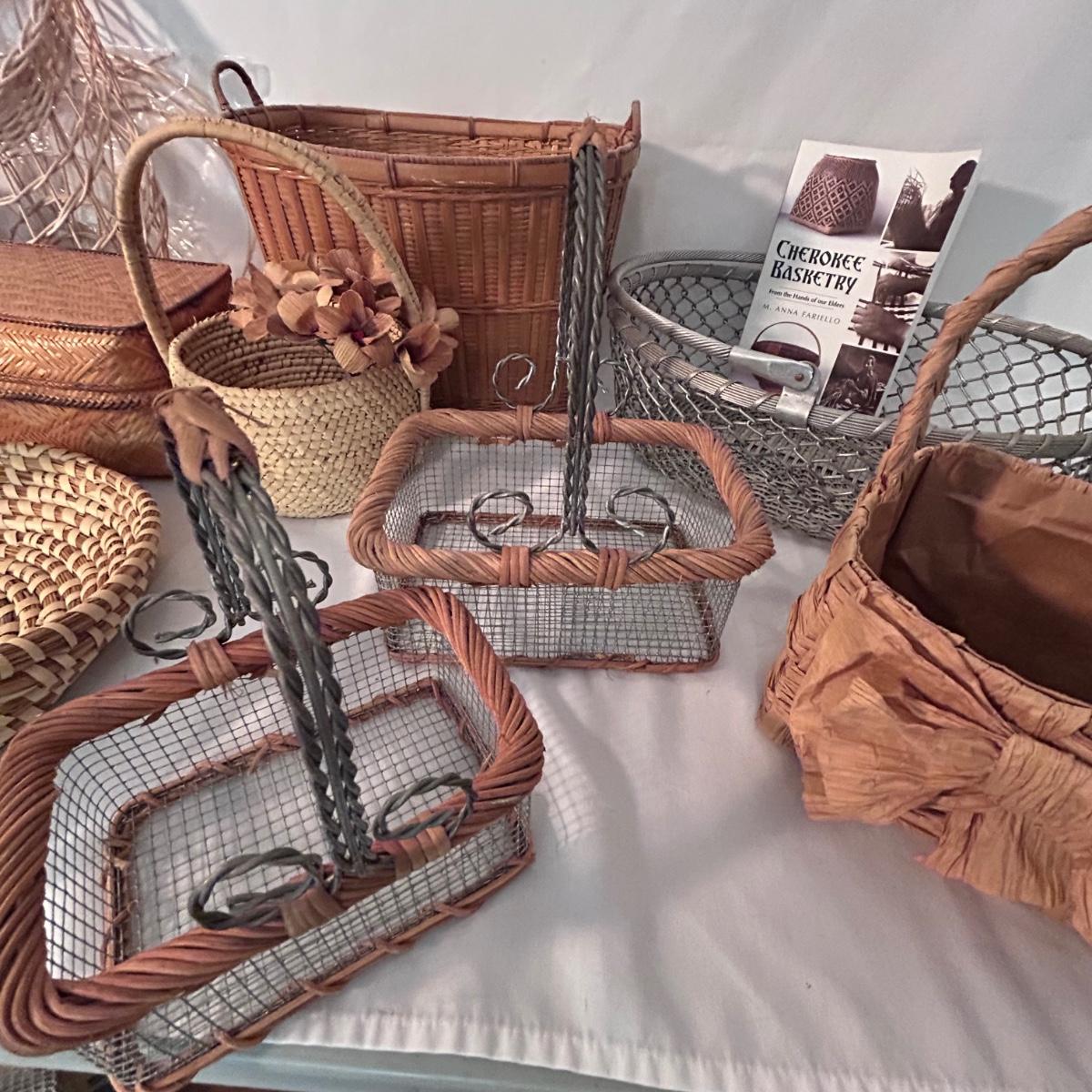 Nice varying collection of woven baskets with a few metal baskets also. The largest handled basked measures 16”x12”x14”. Any fraying or damage noted in photos. Thirteen total baskets with a Cherokee Basketry book also included. Shipping available.