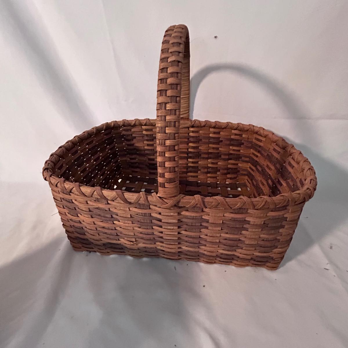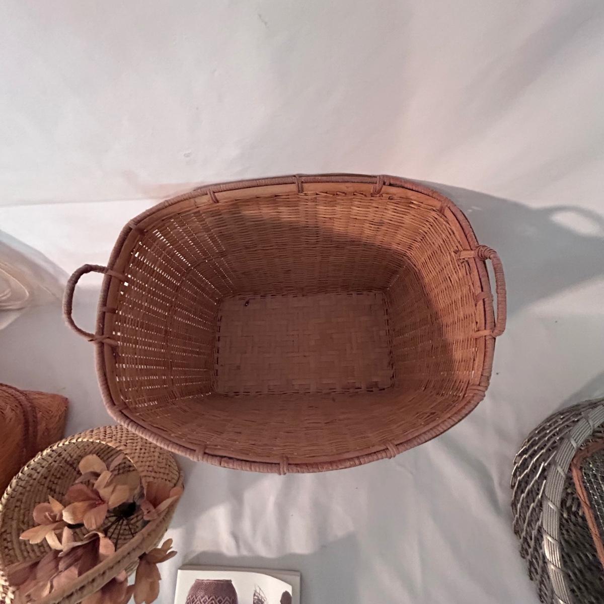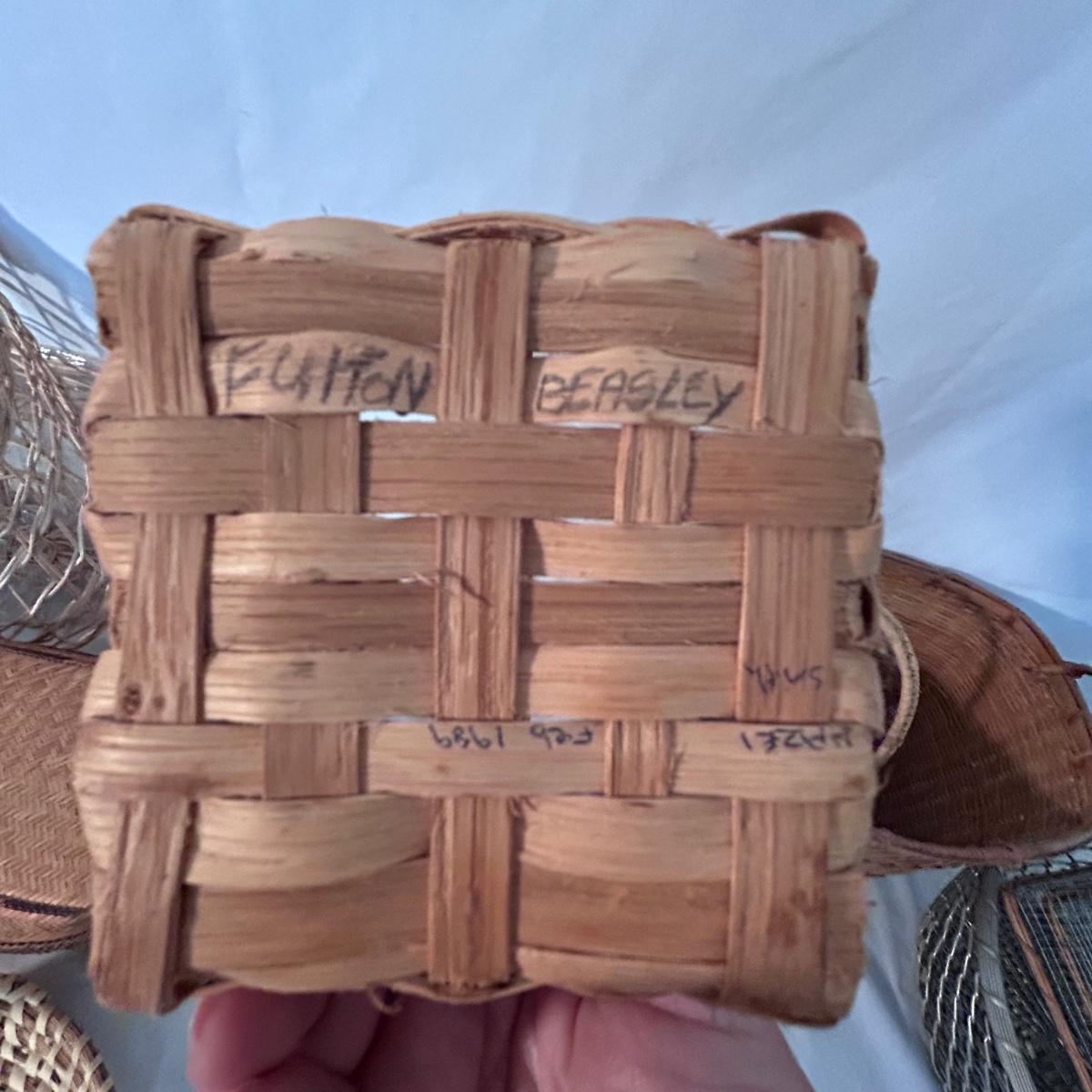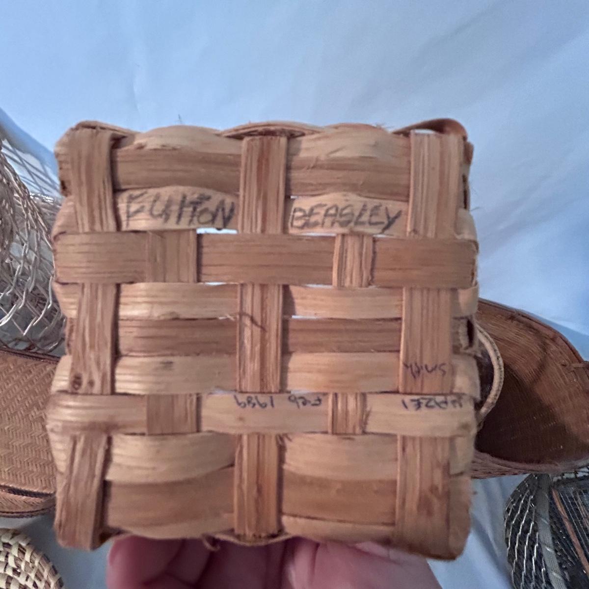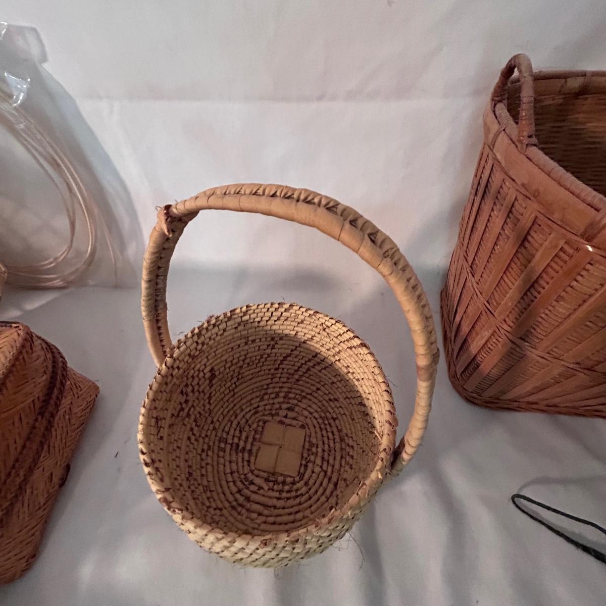 Nice varying collection of woven baskets with a few metal baskets also. The largest handled basked measures 16”x12”x14”. Any fraying or damage noted in photos. Thirteen total baskets with a Cherokee Basketry book also included. Shipping available.