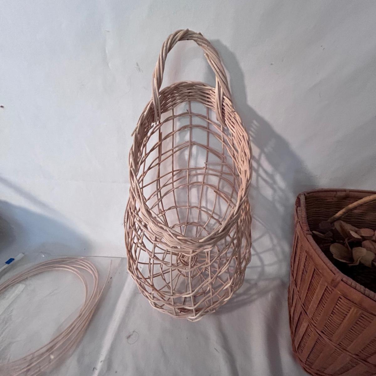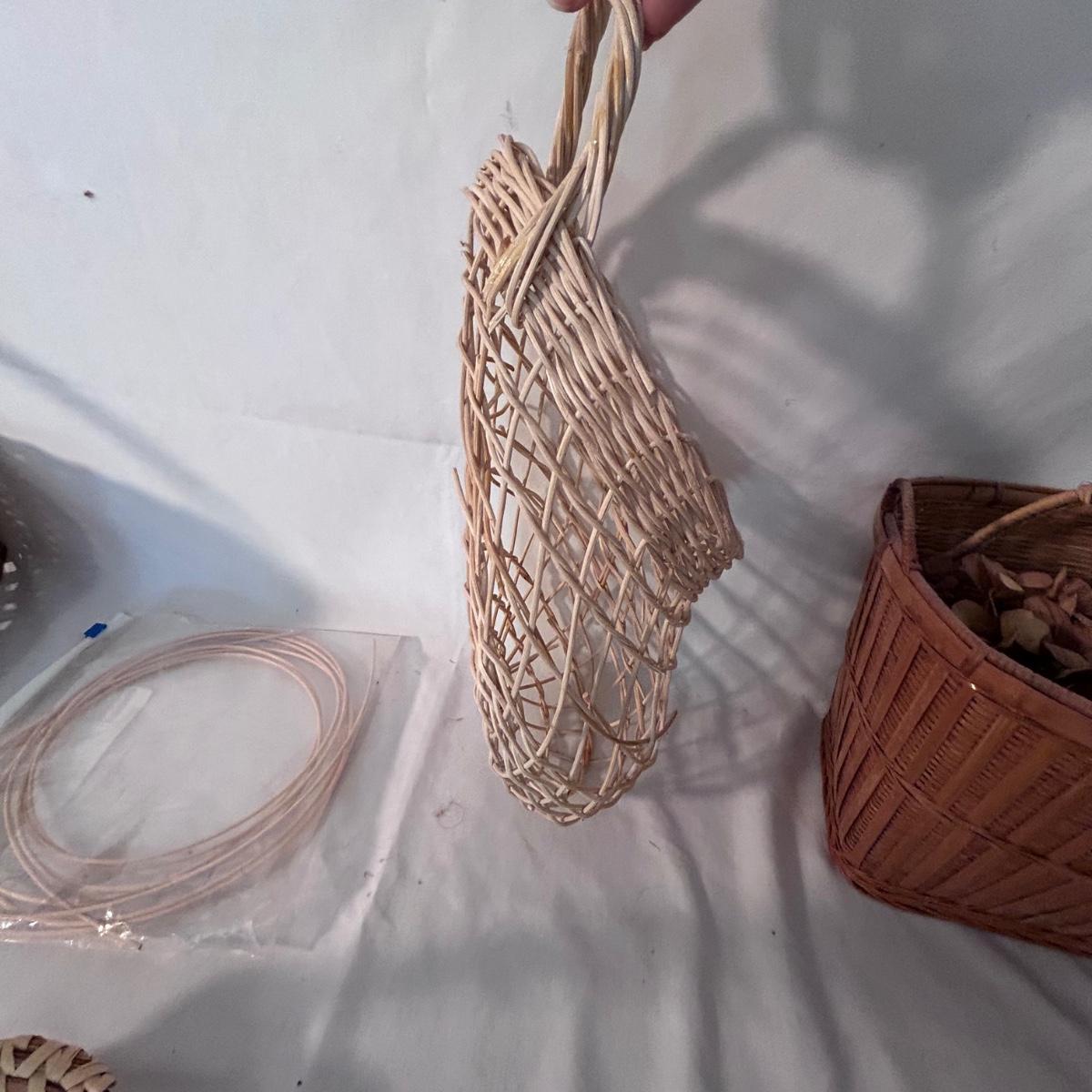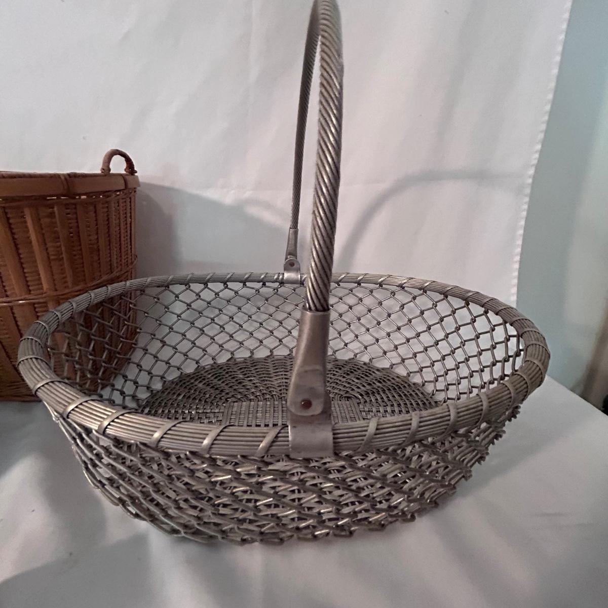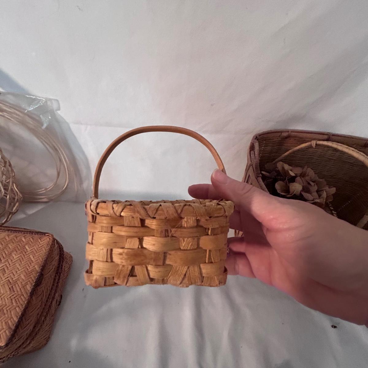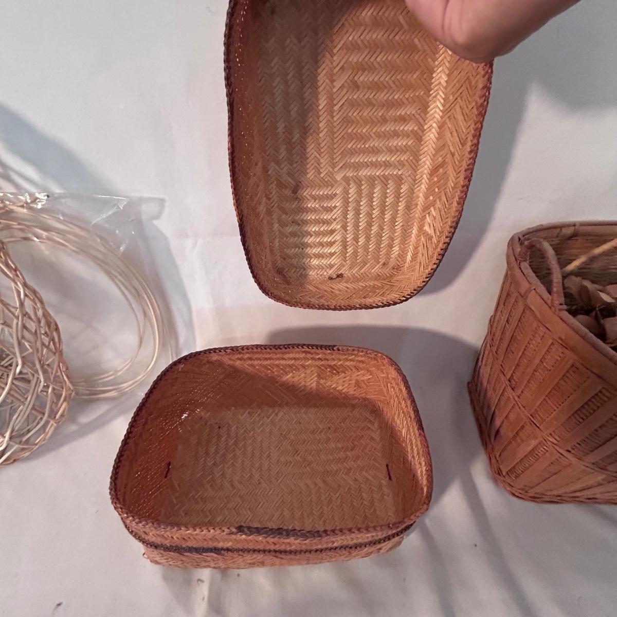 Nice varying collection of woven baskets with a few metal baskets also. The largest handled basked measures 16”x12”x14”. Any fraying or damage noted in photos. Thirteen total baskets with a Cherokee Basketry book also included. Shipping available.