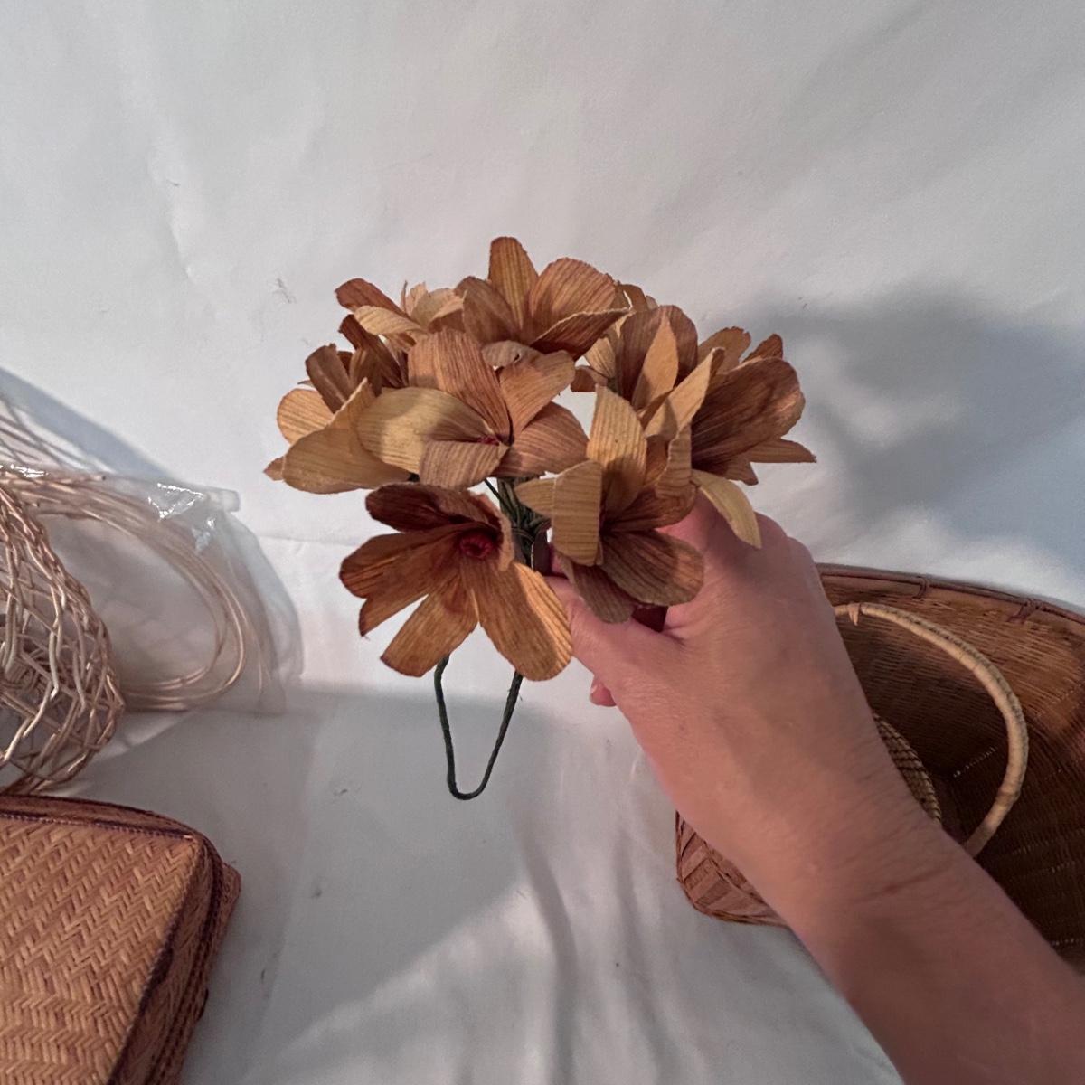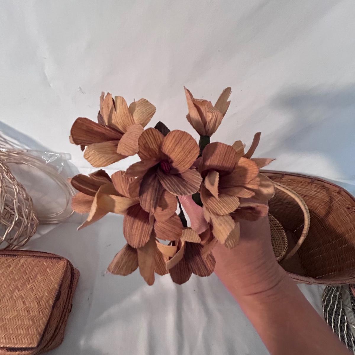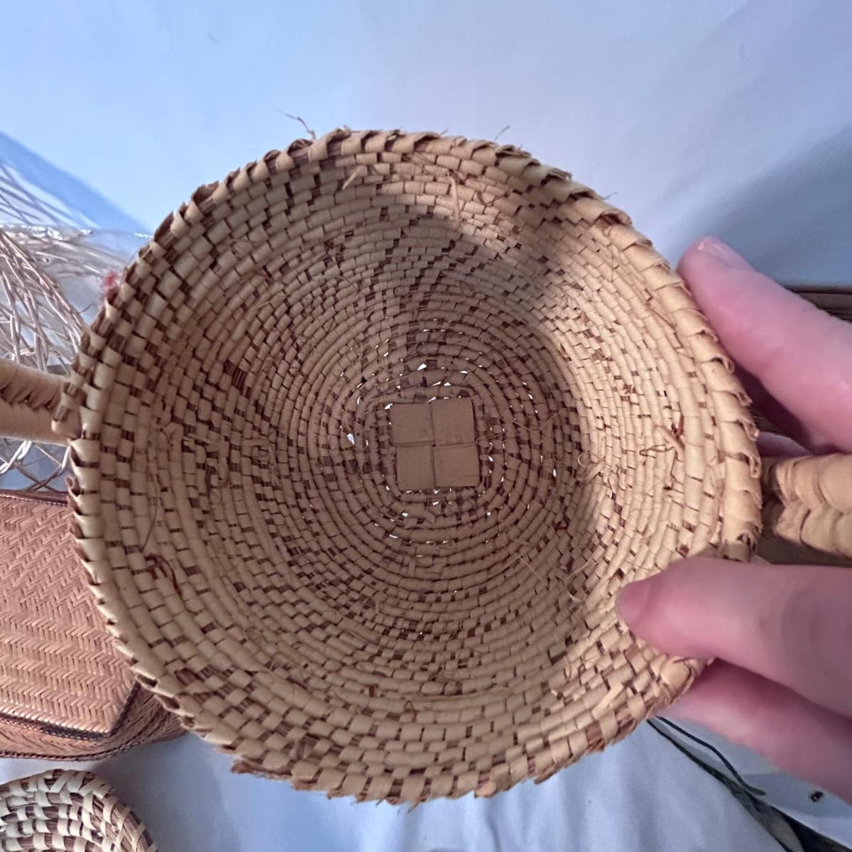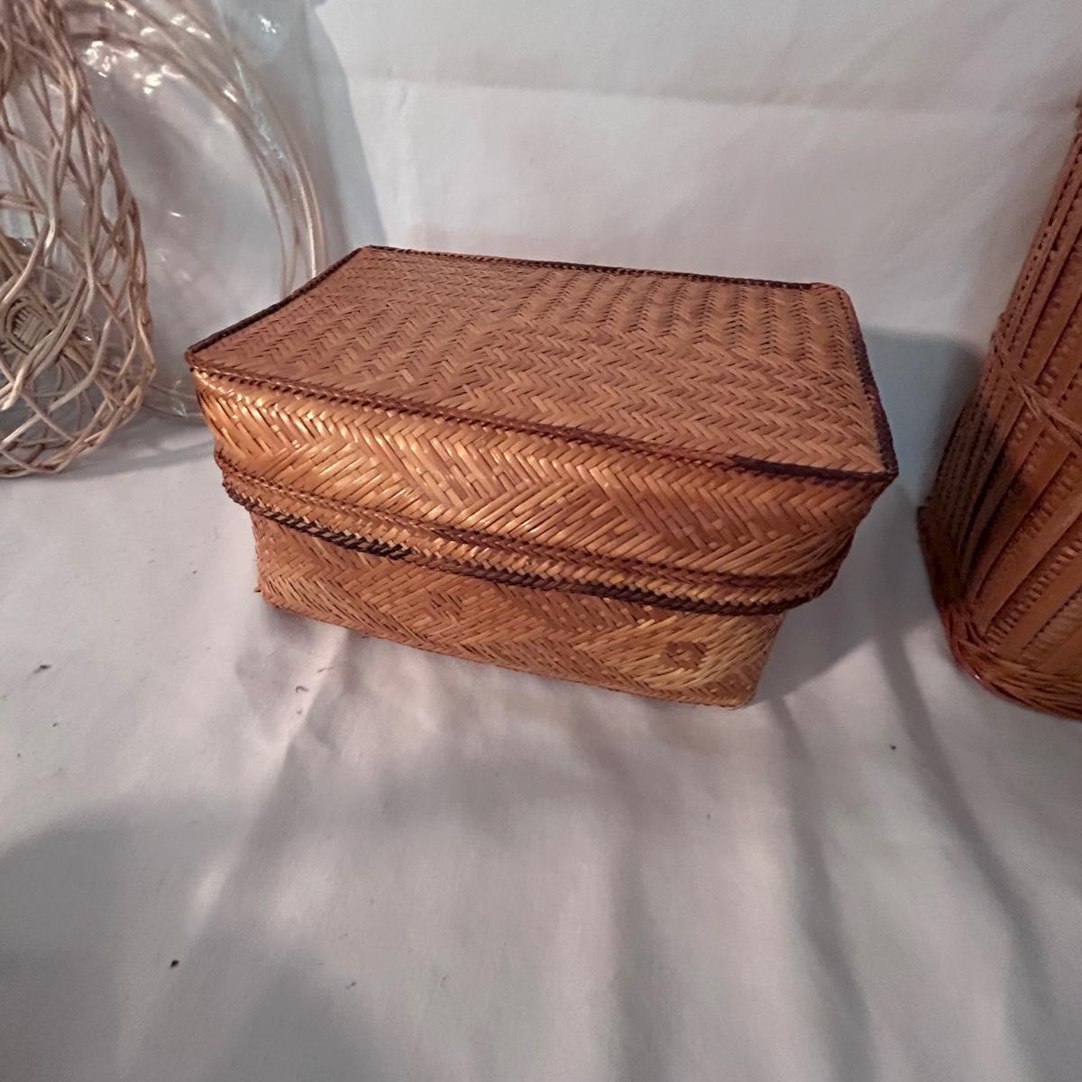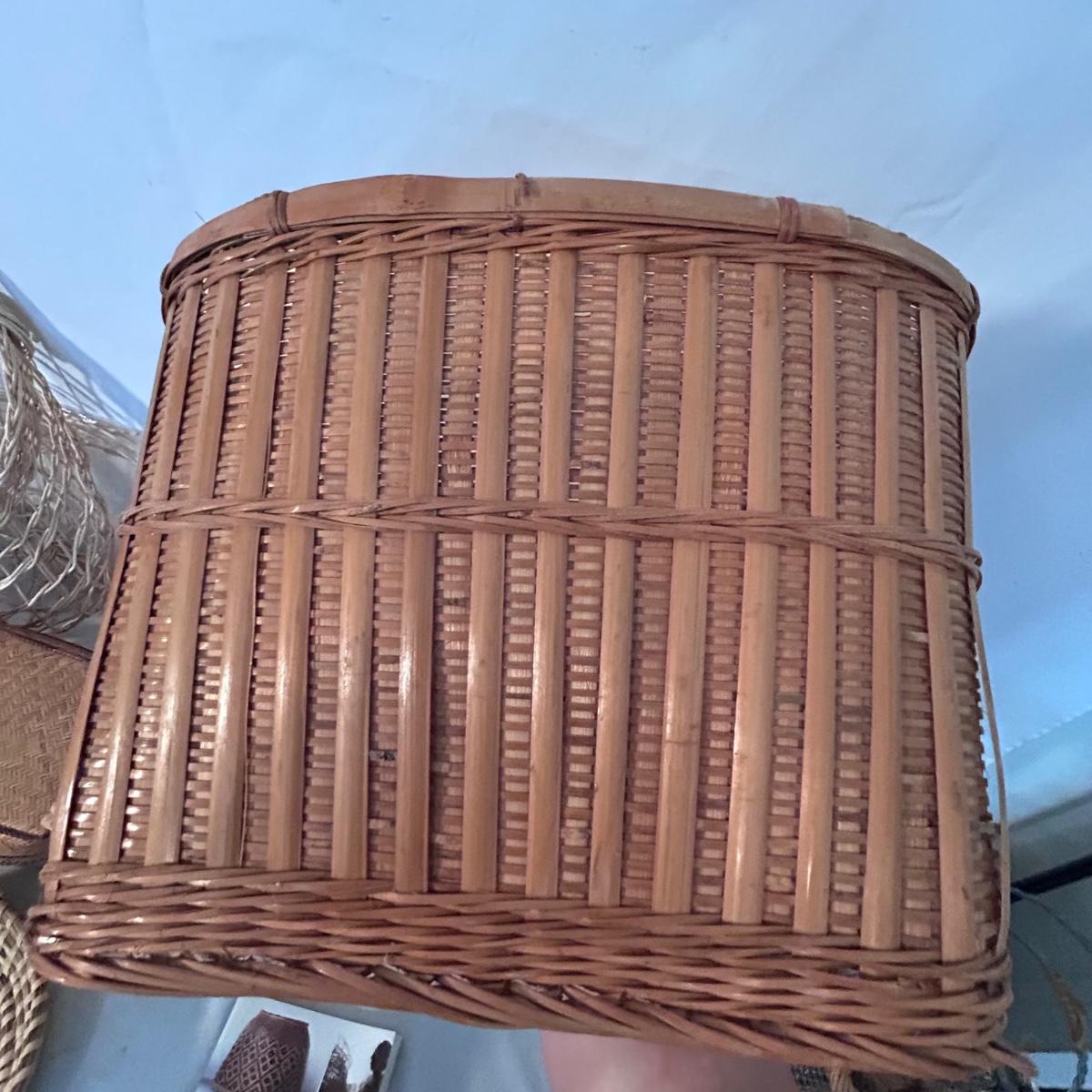 Nice varying collection of woven baskets with a few metal baskets also. The largest handled basked measures 16”x12”x14”. Any fraying or damage noted in photos. Thirteen total baskets with a Cherokee Basketry book also included. Shipping available.
