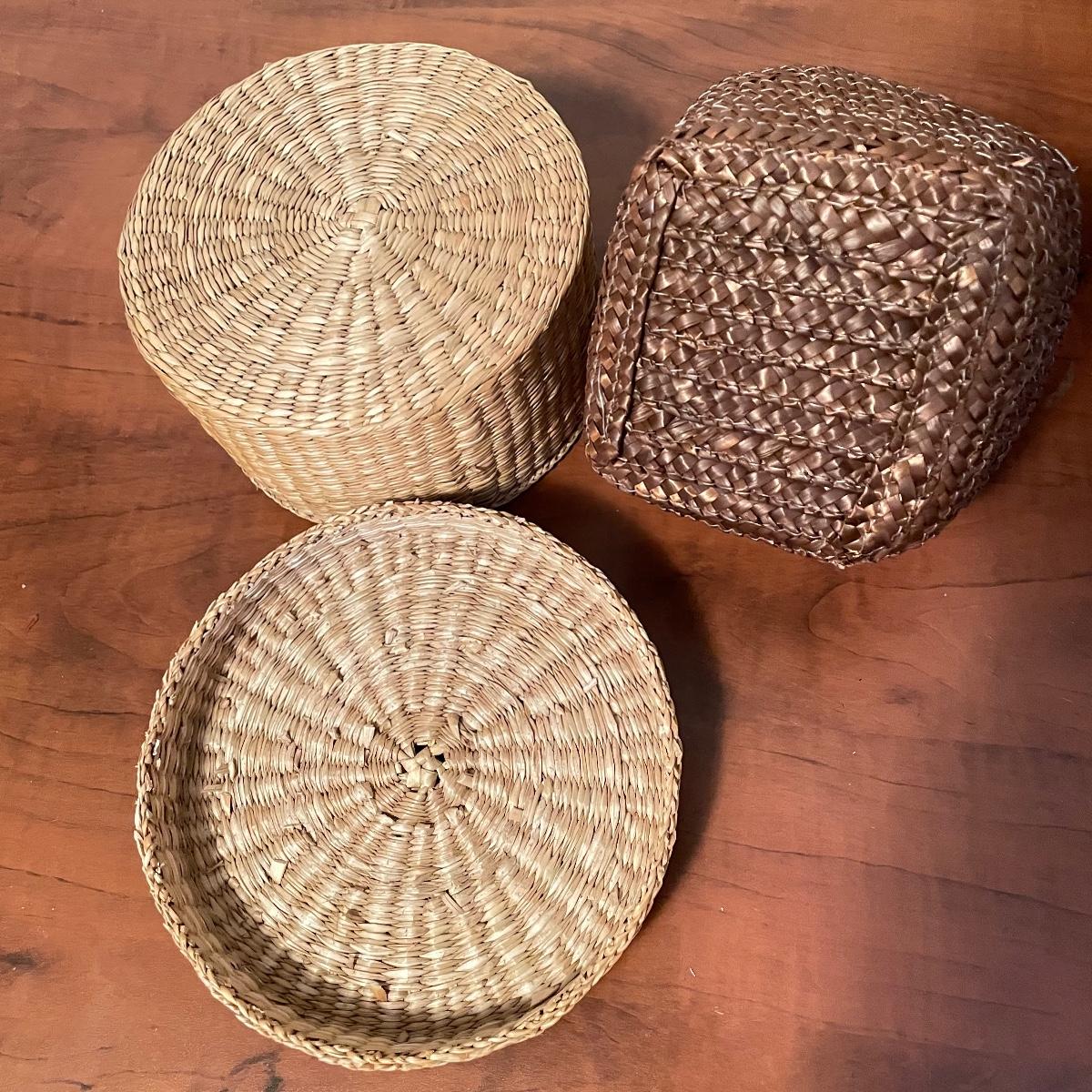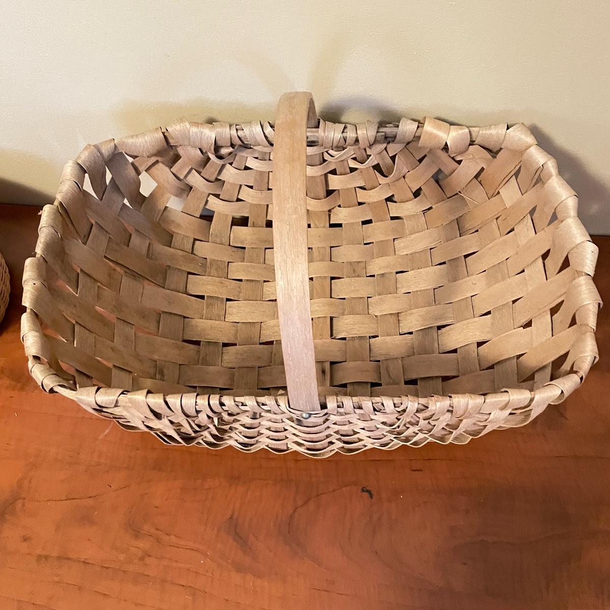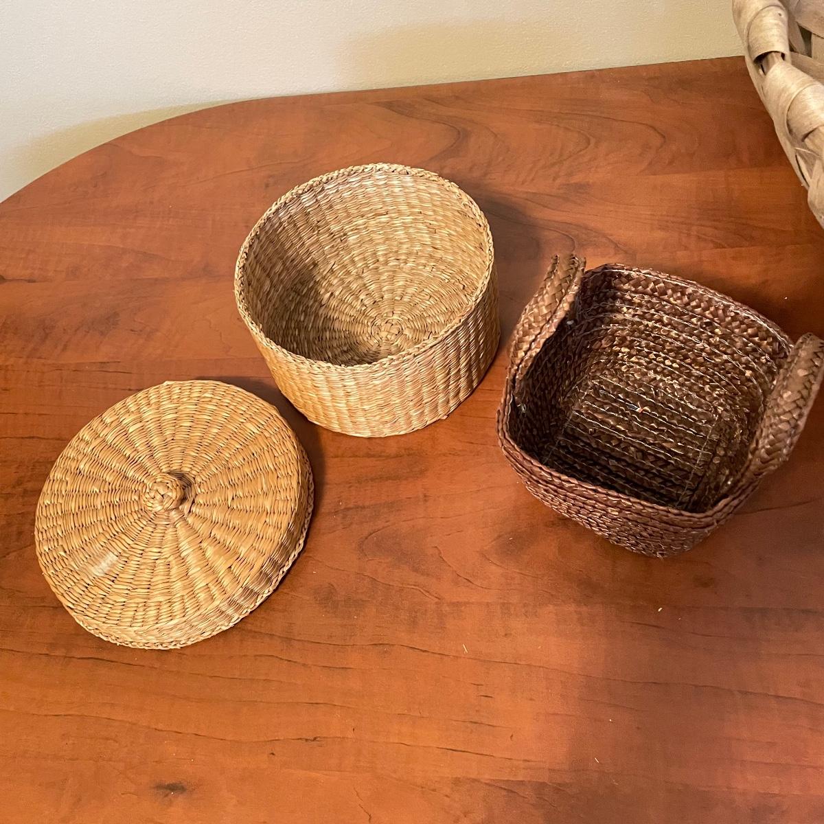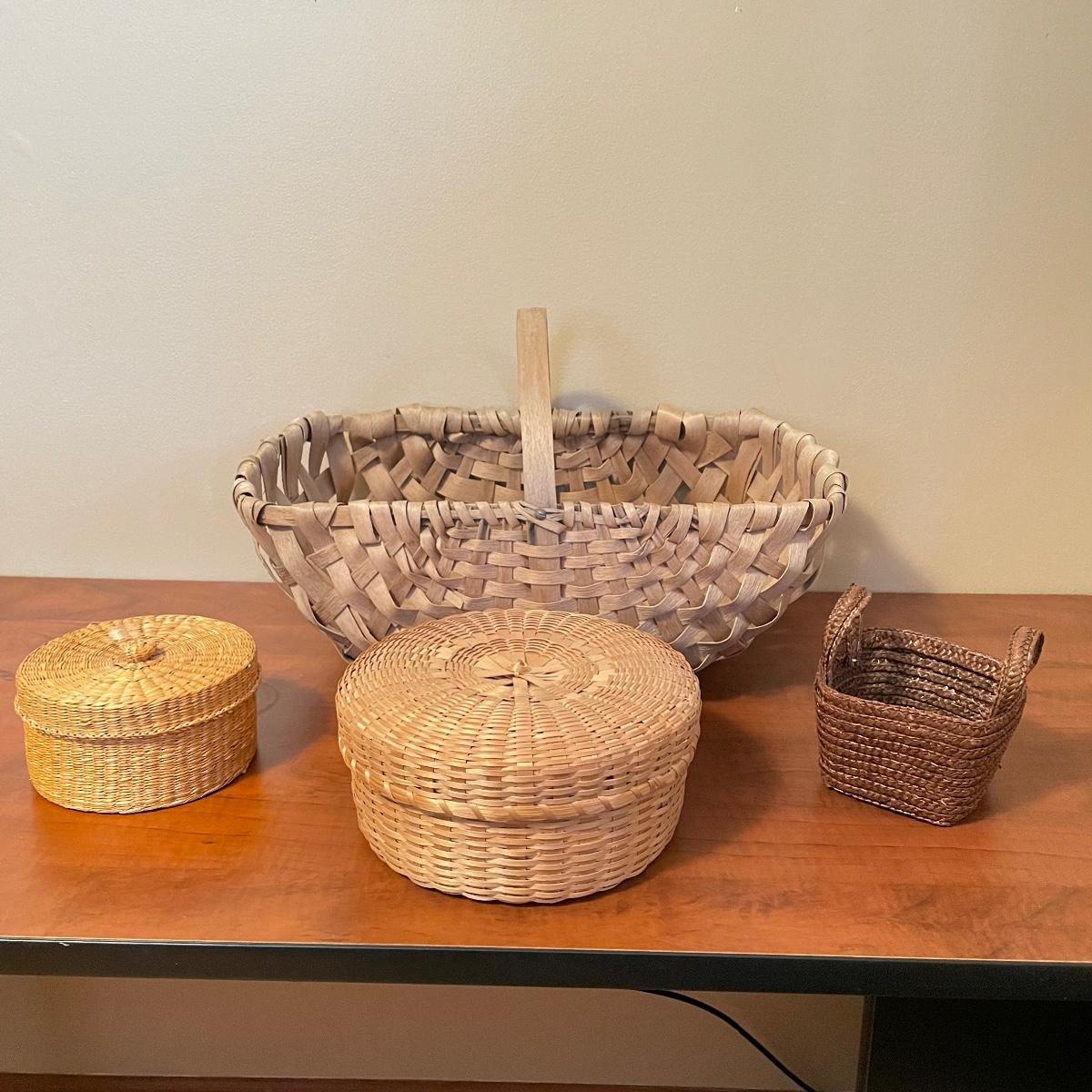 Four beautiful baskets. The grayish-tan basket has a nice handle screwed into the woven basket, the handle is sturdy and winds around to the bottom of the basket. This basket is about 21” x 12.5” x 9” with the handle reaching 12.5” tall. Two smaller lidded baskets and the smallest darker basket is 5.5”square x 3.75” tall. See images. Local pick up only.
