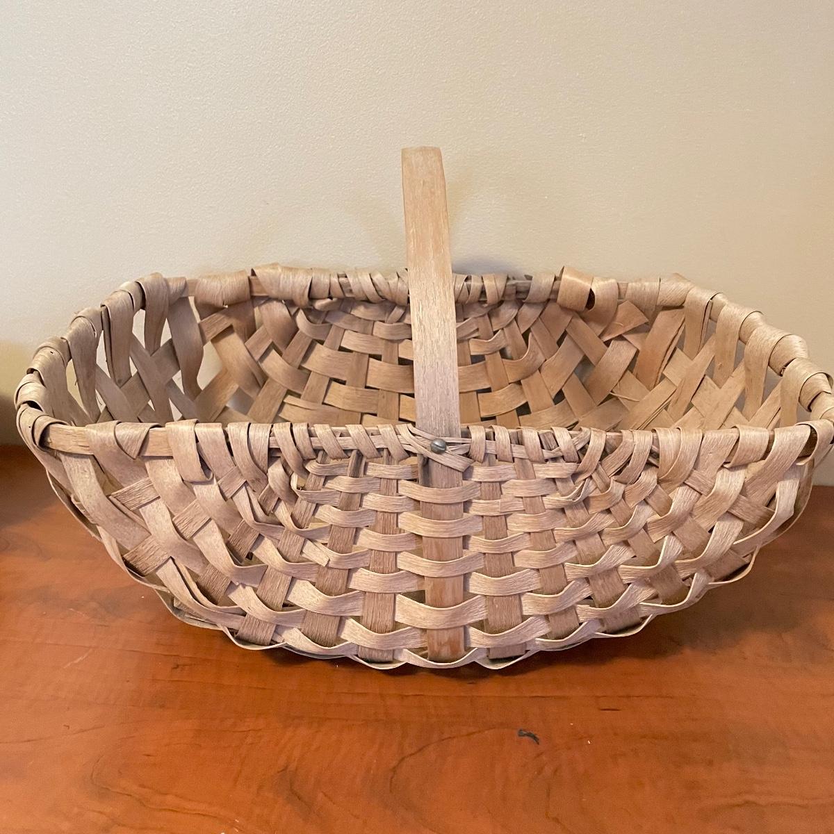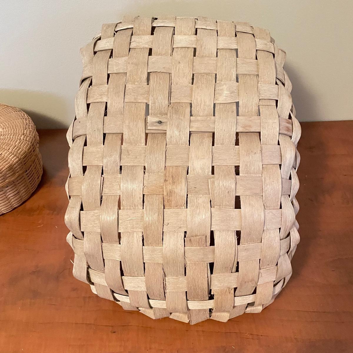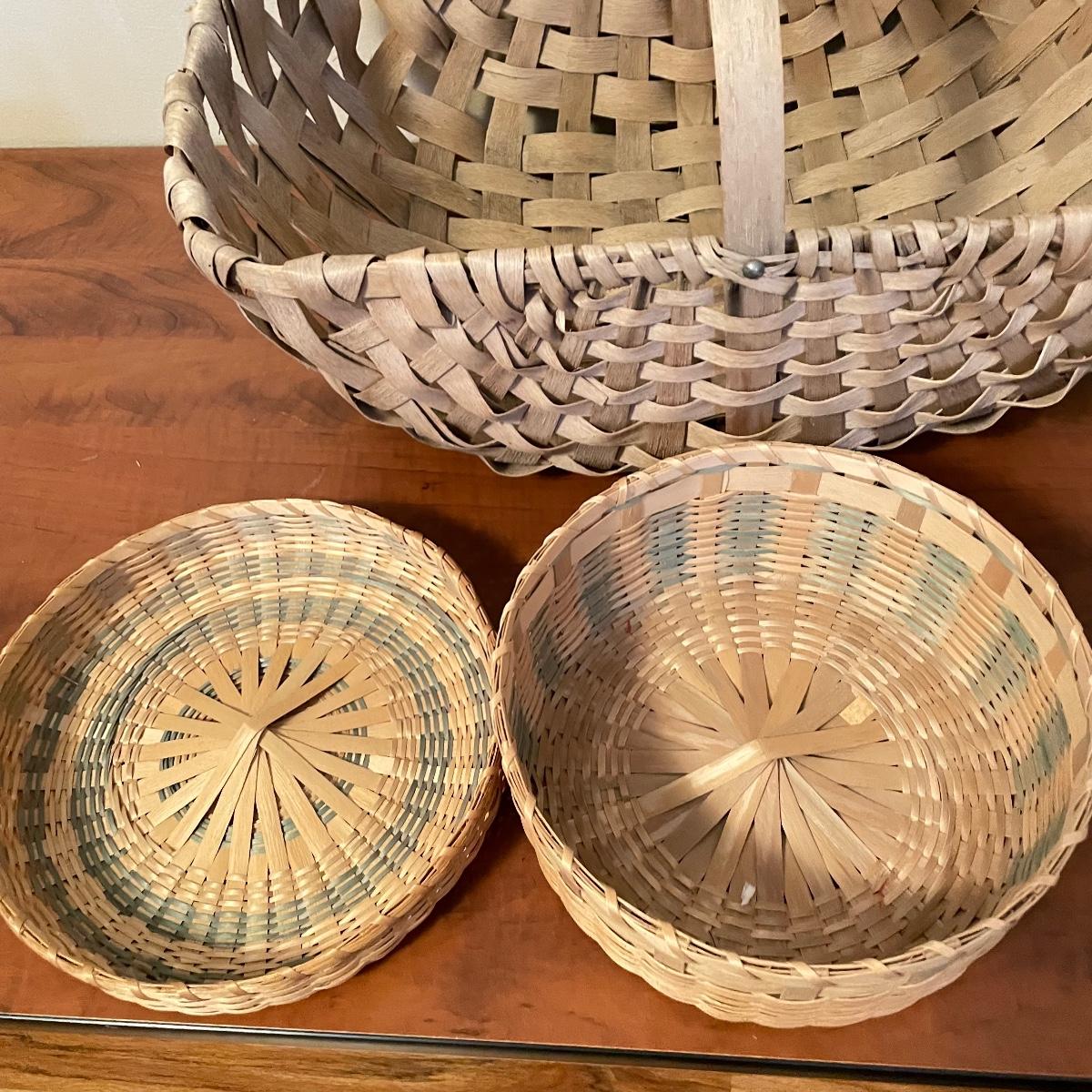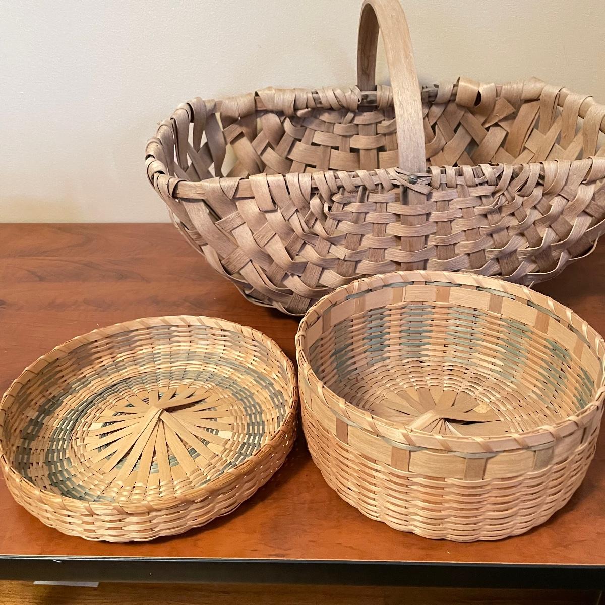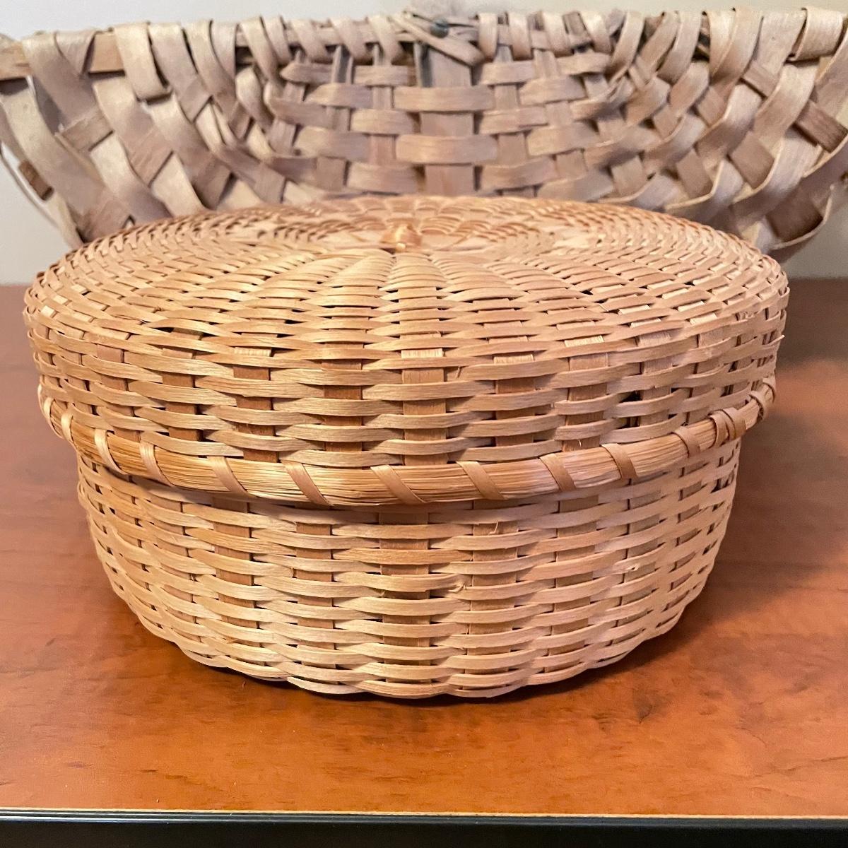 Four beautiful baskets. The grayish-tan basket has a nice handle screwed into the woven basket, the handle is sturdy and winds around to the bottom of the basket. This basket is about 21” x 12.5” x 9” with the handle reaching 12.5” tall. Two smaller lidded baskets and the smallest darker basket is 5.5”square x 3.75” tall. See images. Local pick up only.