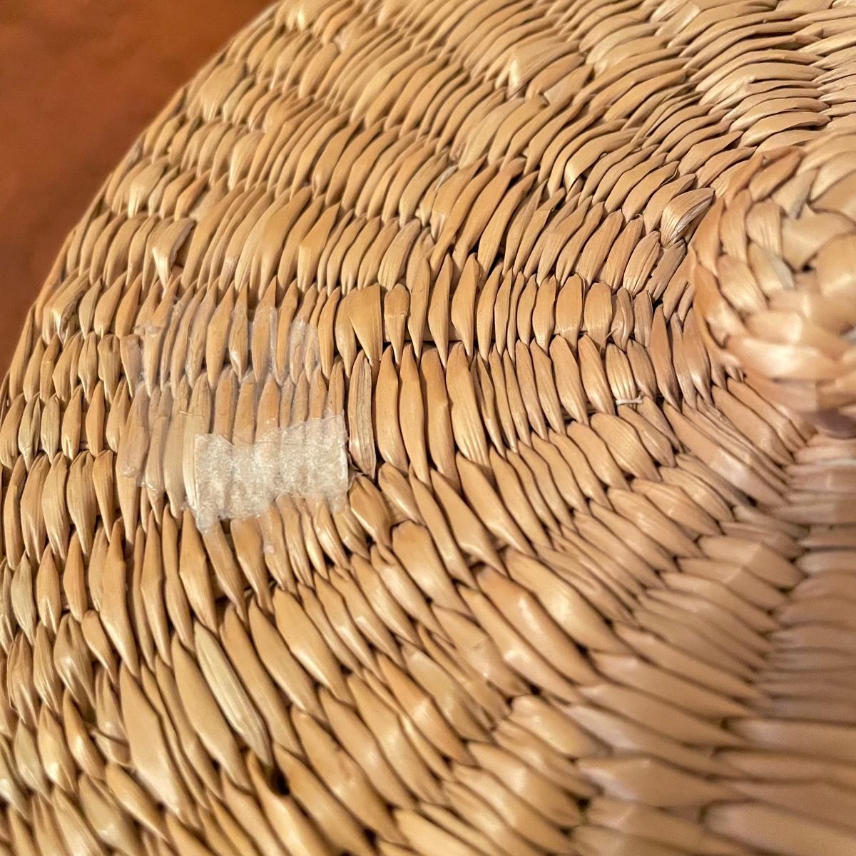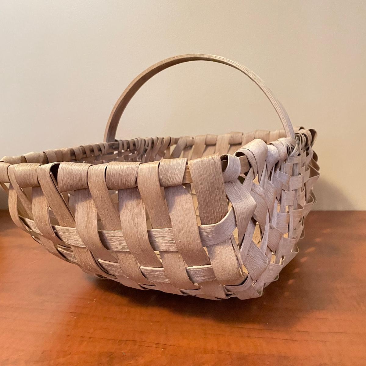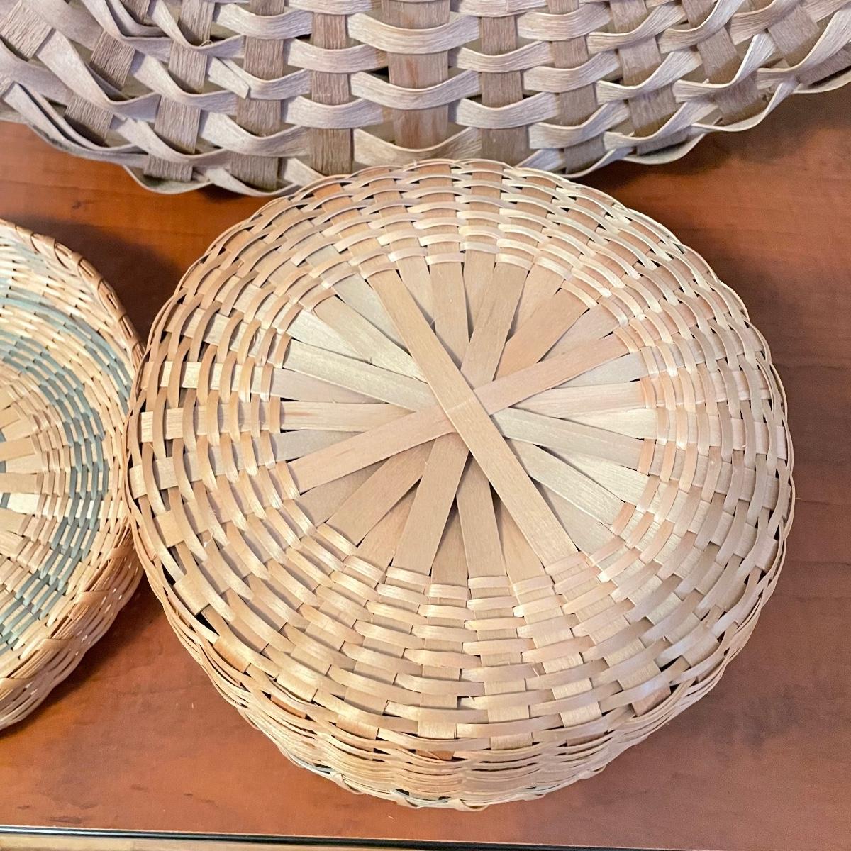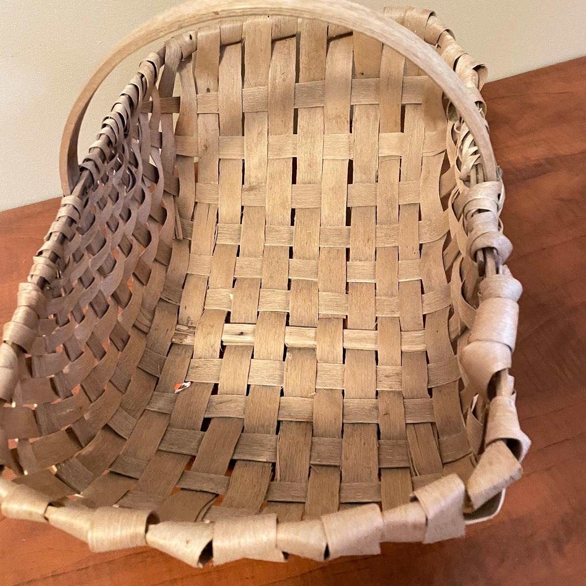 Four beautiful baskets. The grayish-tan basket has a nice handle screwed into the woven basket, the handle is sturdy and winds around to the bottom of the basket. This basket is about 21” x 12.5” x 9” with the handle reaching 12.5” tall. Two smaller lidded baskets and the smallest darker basket is 5.5”square x 3.75” tall. See images. Local pick up only.
