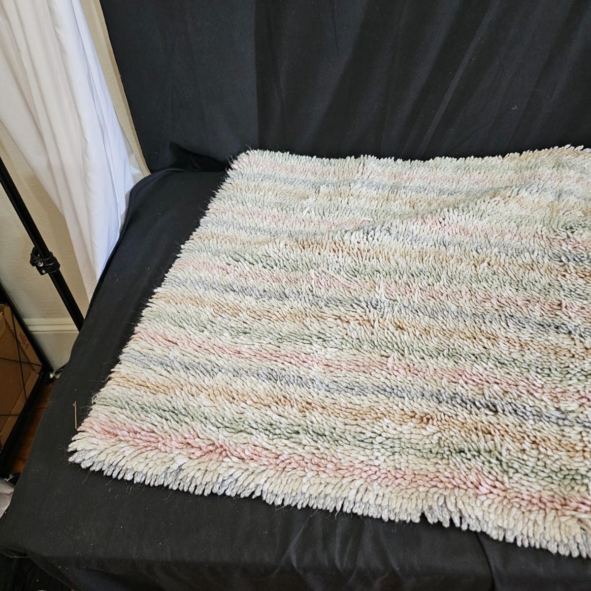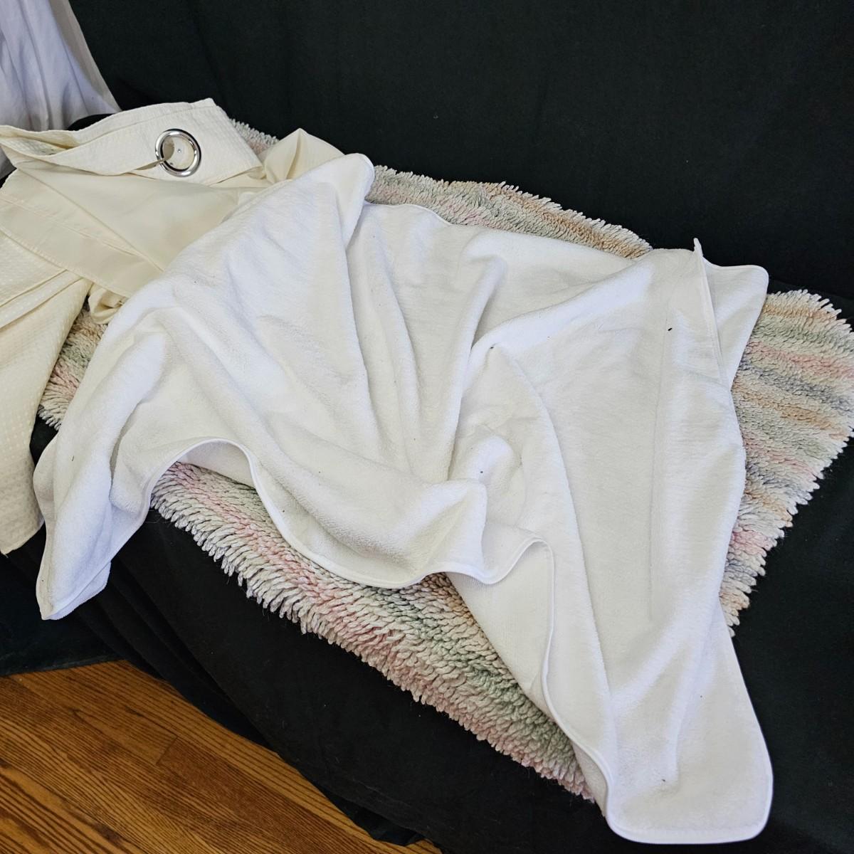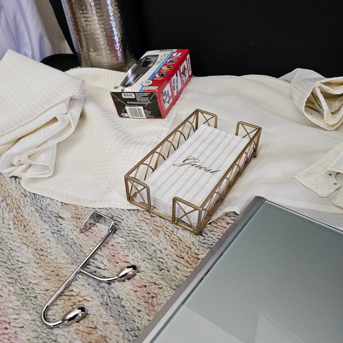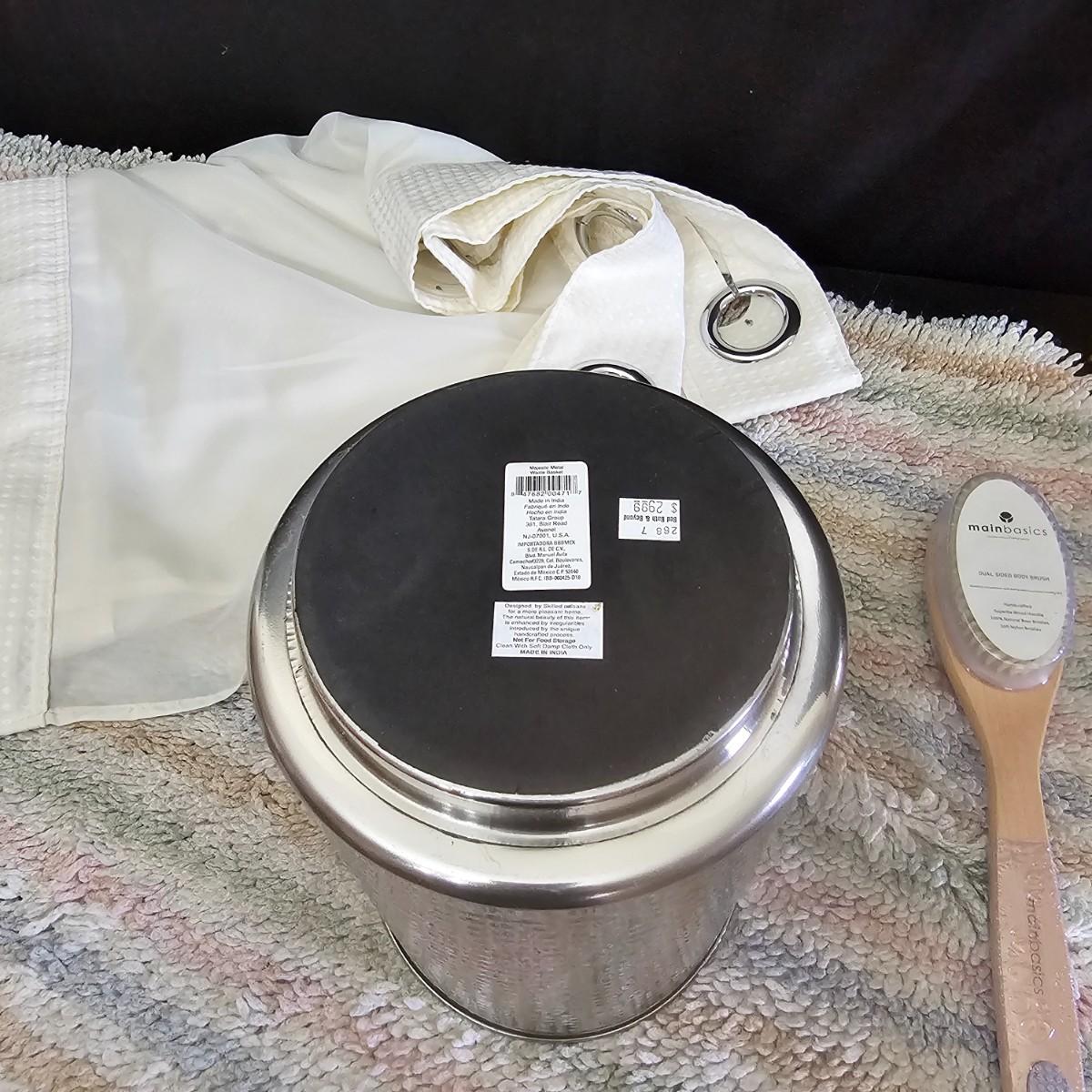 A rug, bath towel, shower curtain and more items for the bath. Large hole shower curtain measures 72" x 72"H. Electronic scale is battery powered, tested working. Aluminum trash can is 8"D x 11"H and the semi shag rug is 30" x 50", has non slip rubber back. See photos for details. Shipping available
