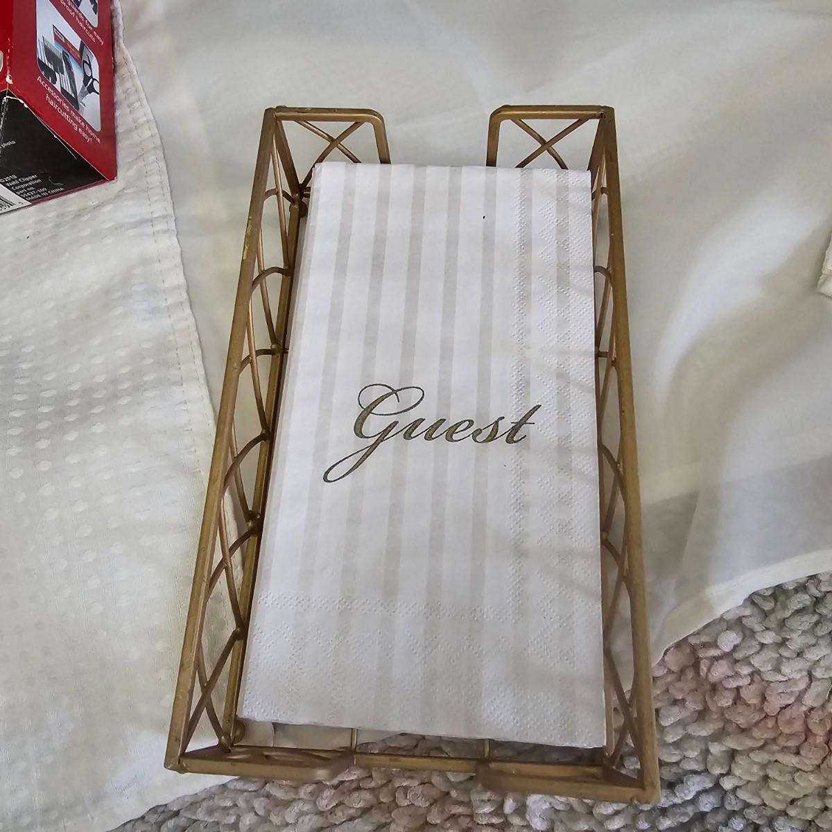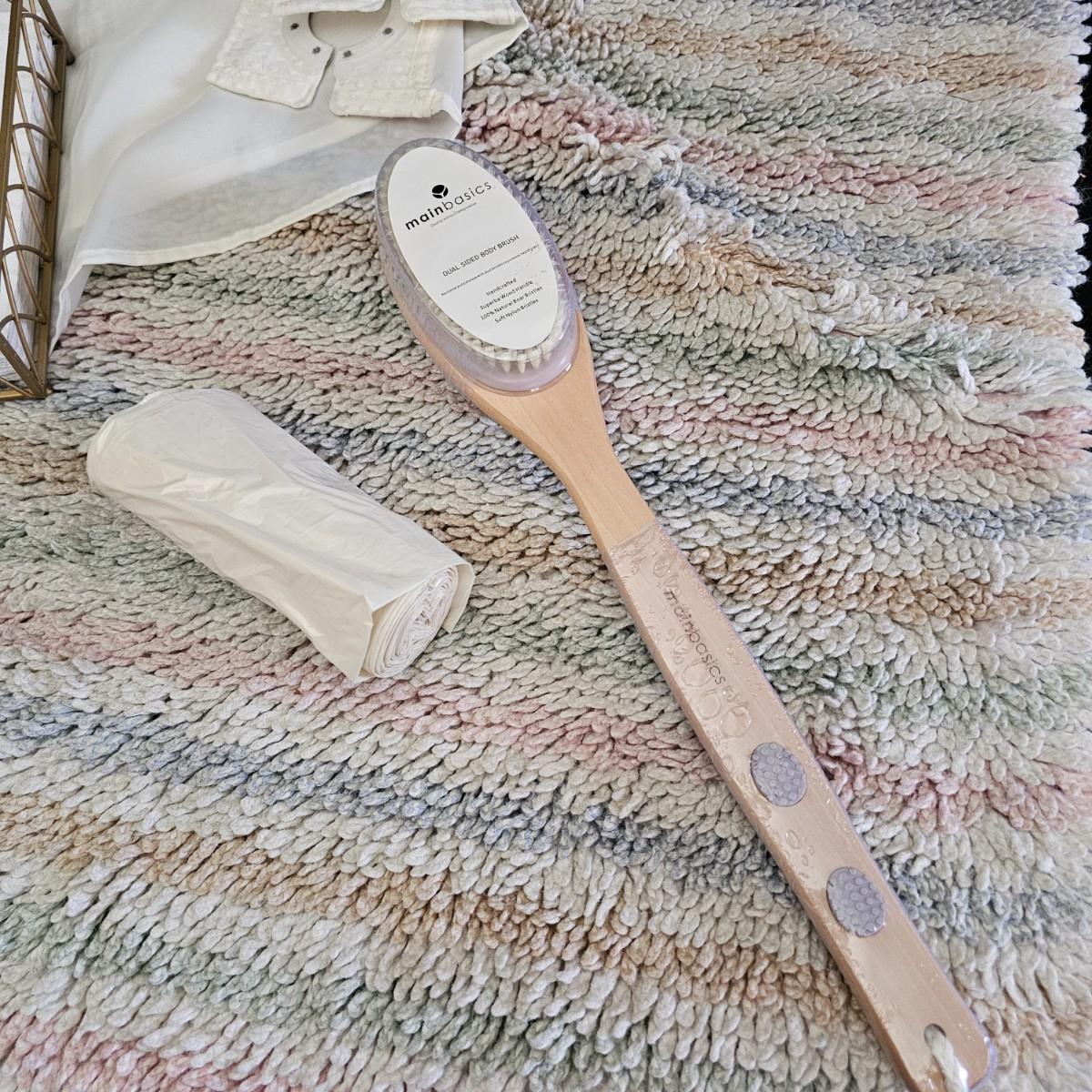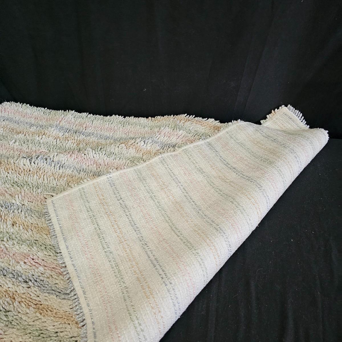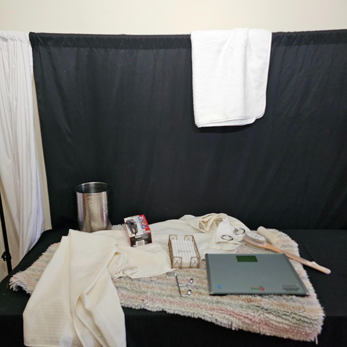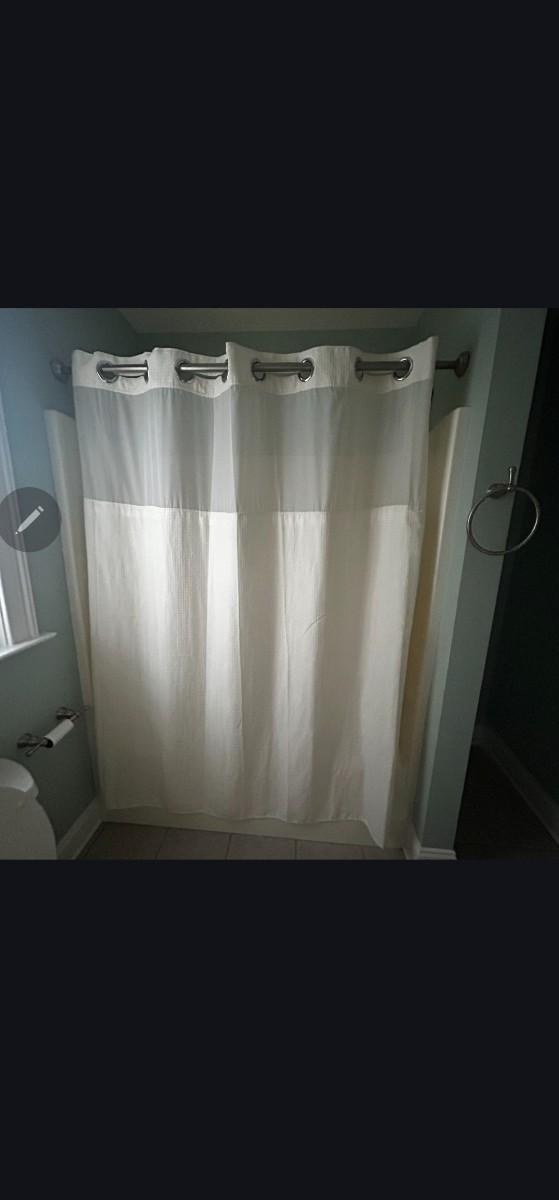 A rug, bath towel, shower curtain and more items for the bath. Large hole shower curtain measures 72" x 72"H. Electronic scale is battery powered, tested working. Aluminum trash can is 8"D x 11"H and the semi shag rug is 30" x 50", has non slip rubber back. See photos for details. Shipping available