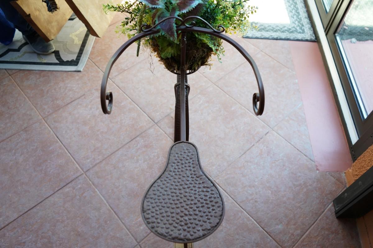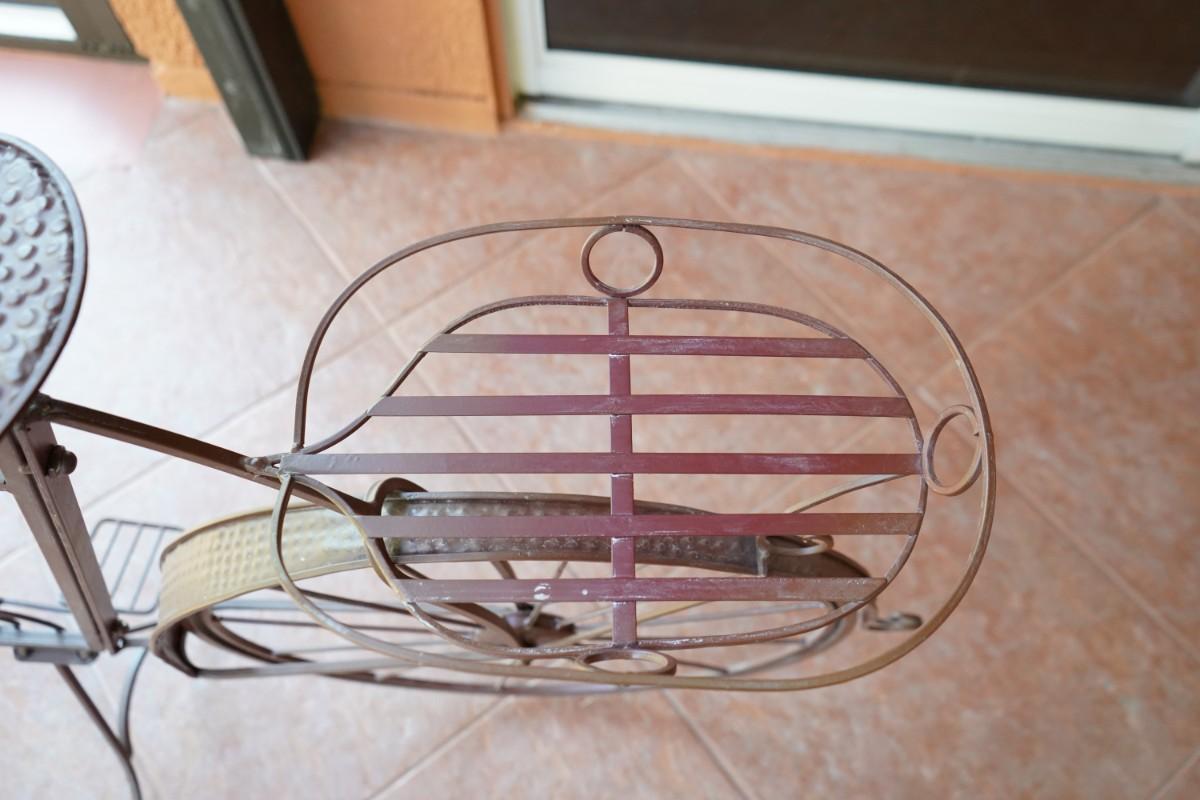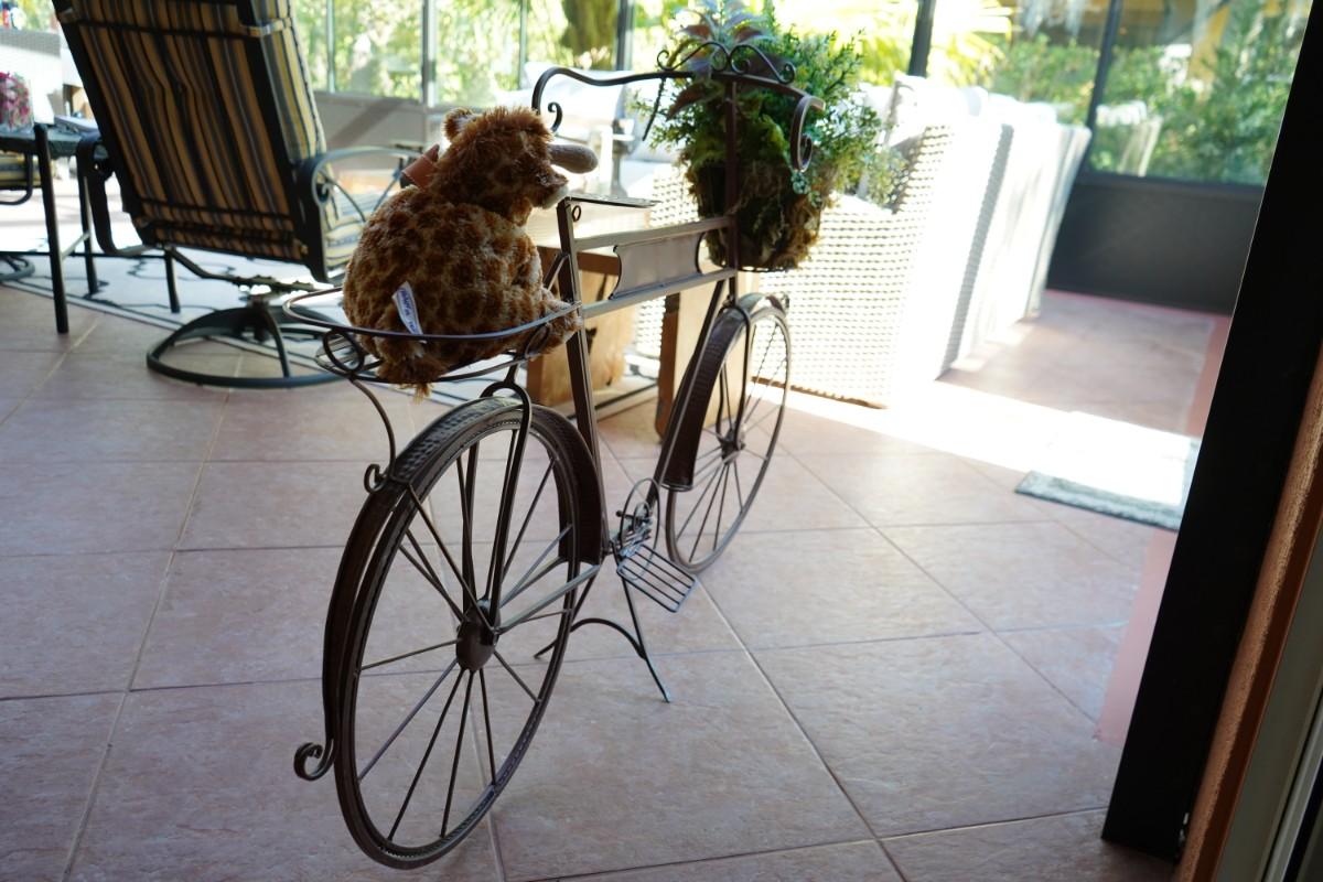 Decorative bicycle plant stand includes artificial plant in front basket and giraffe on back. Measures 55 x 14.75 x 39.