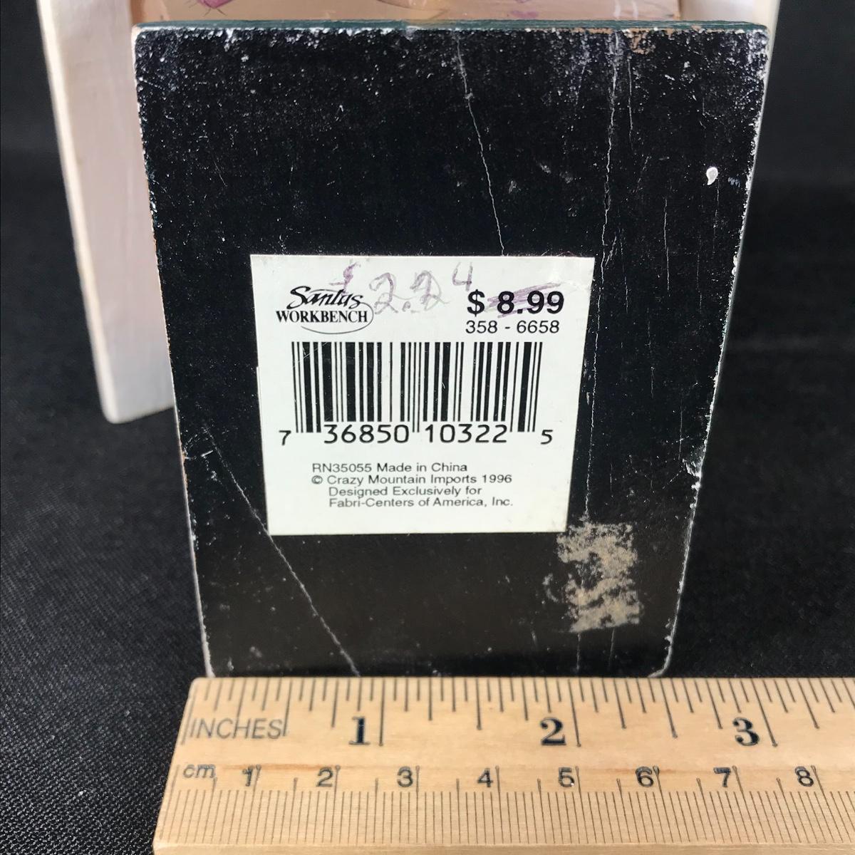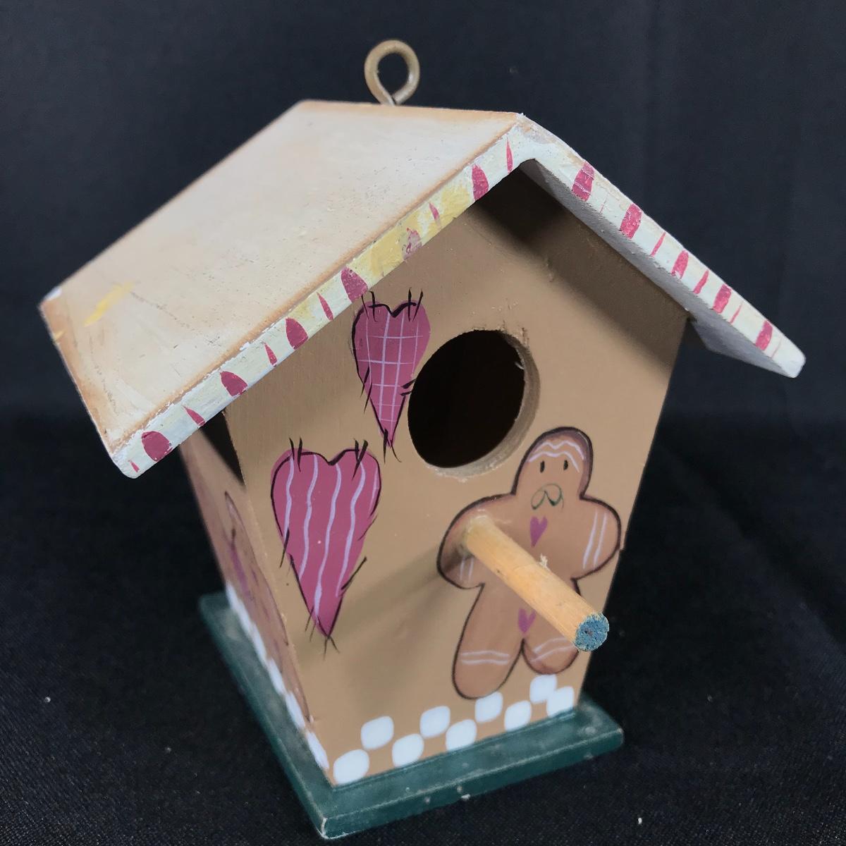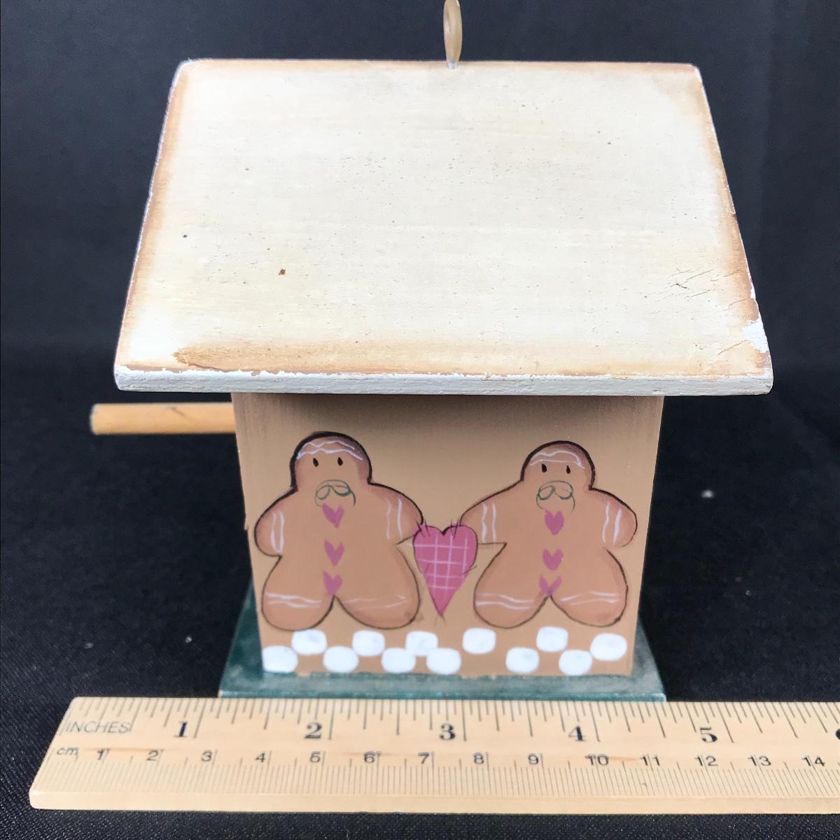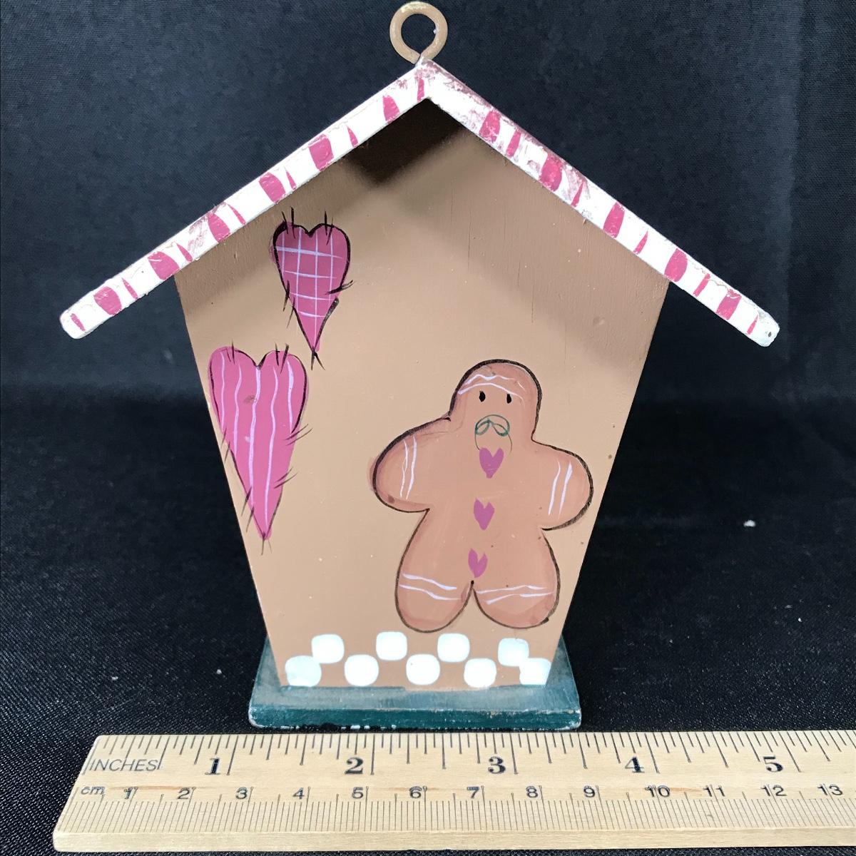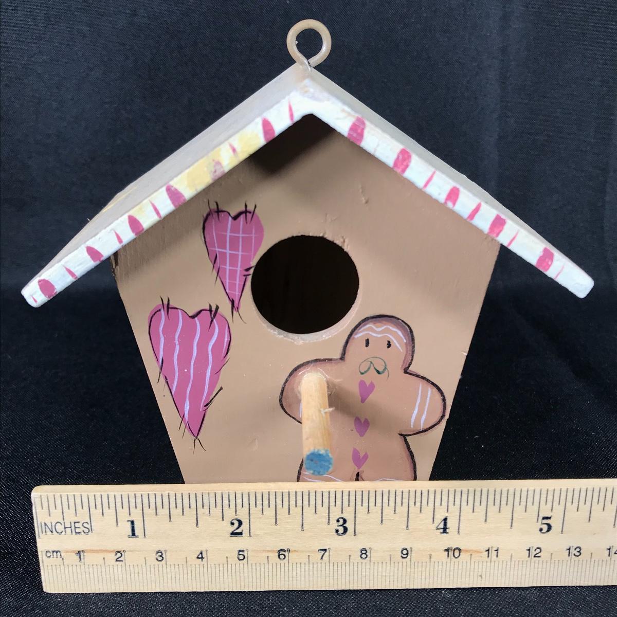 It’s a small wooden decorative birdhouse with hearts, and gingerbread man painted on. It stands approximately 4.75” high; see pictures.