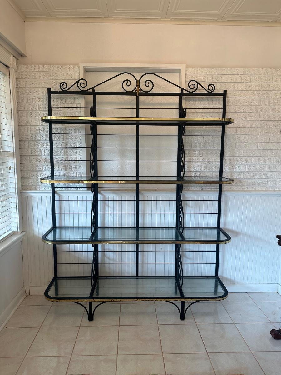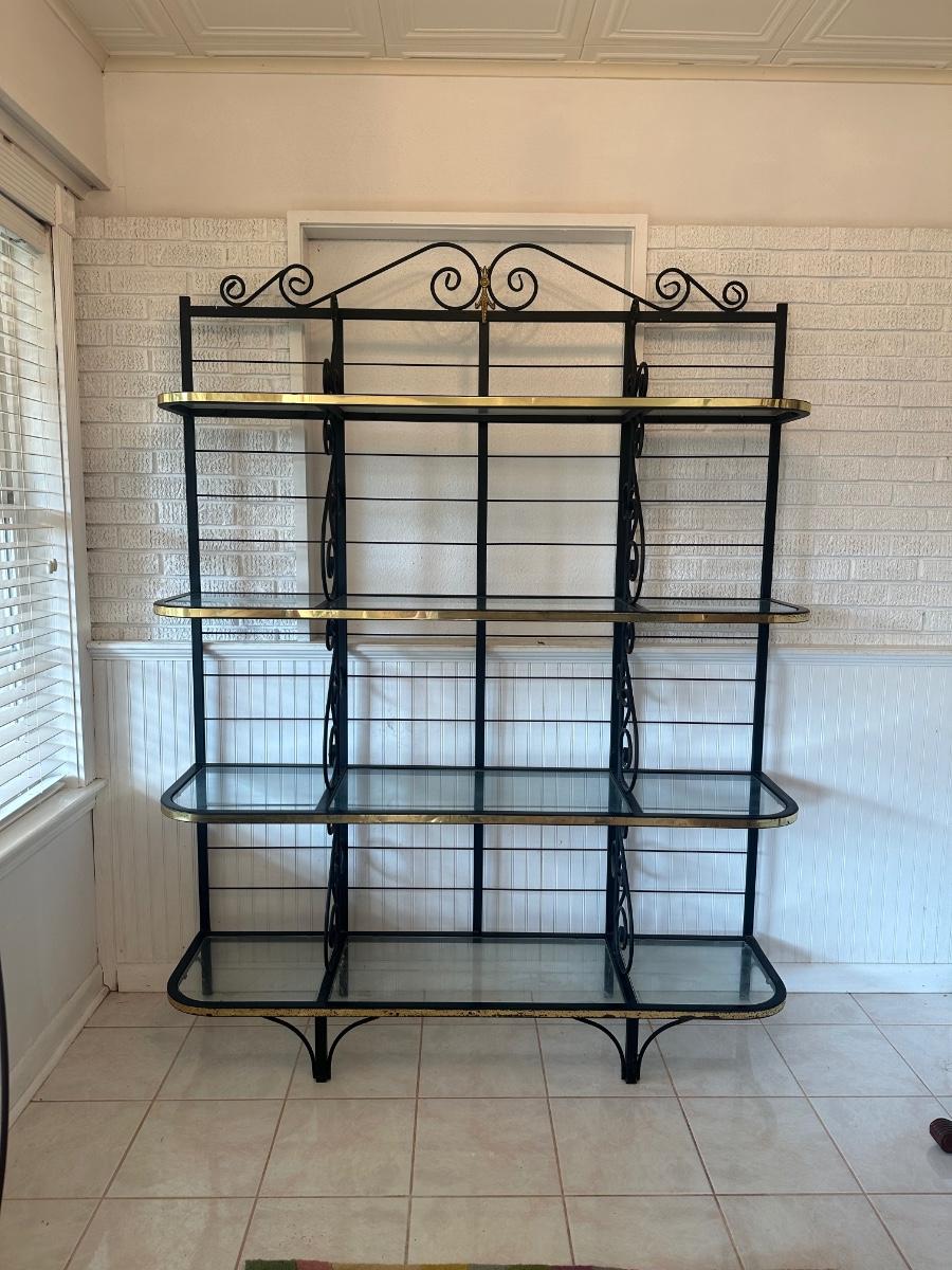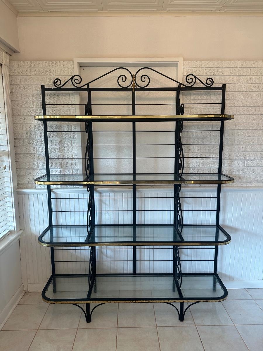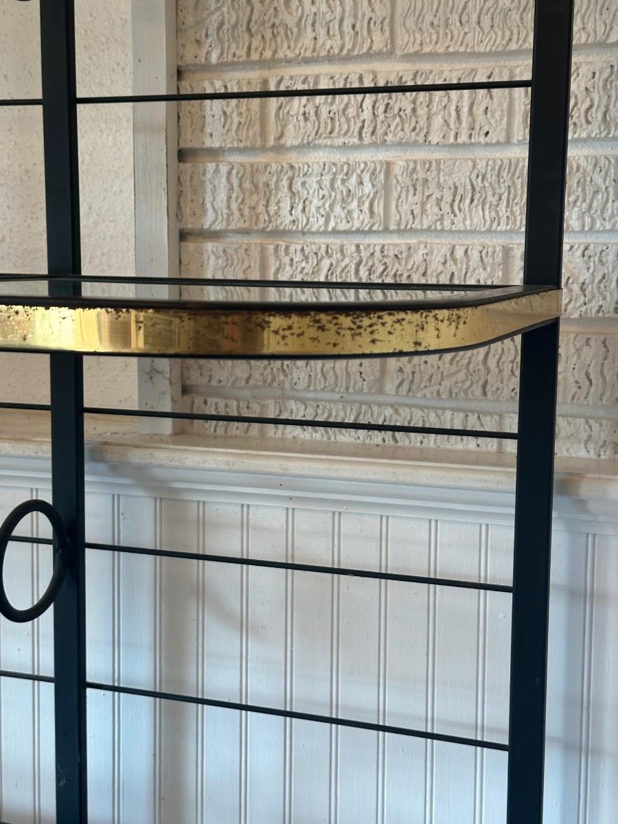 Fitted with multiple glass shelves framed in gold-tone metal trim. Open design works well for display, books, barware, or decorative objects.