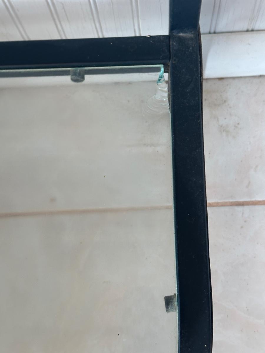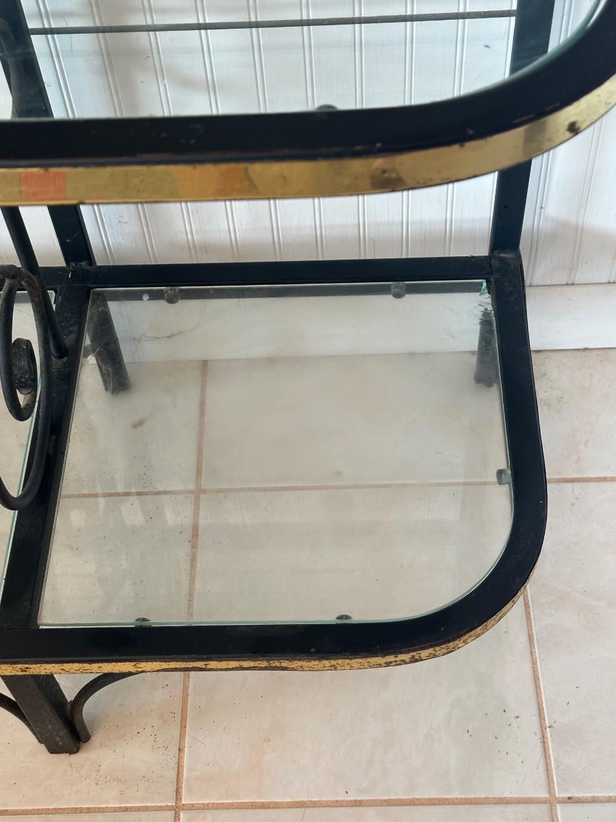 One glass shelf shows a chipped corner (see photos). Gold-tone trim exhibits oxidation and finish wear consistent with age and use. Metal frame remains sturdy with normal surface wear. No maker marks observed.