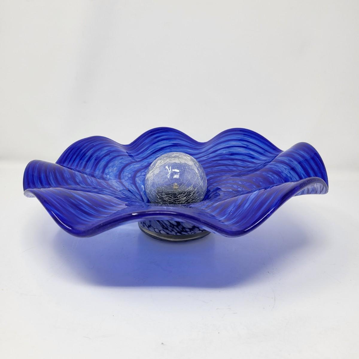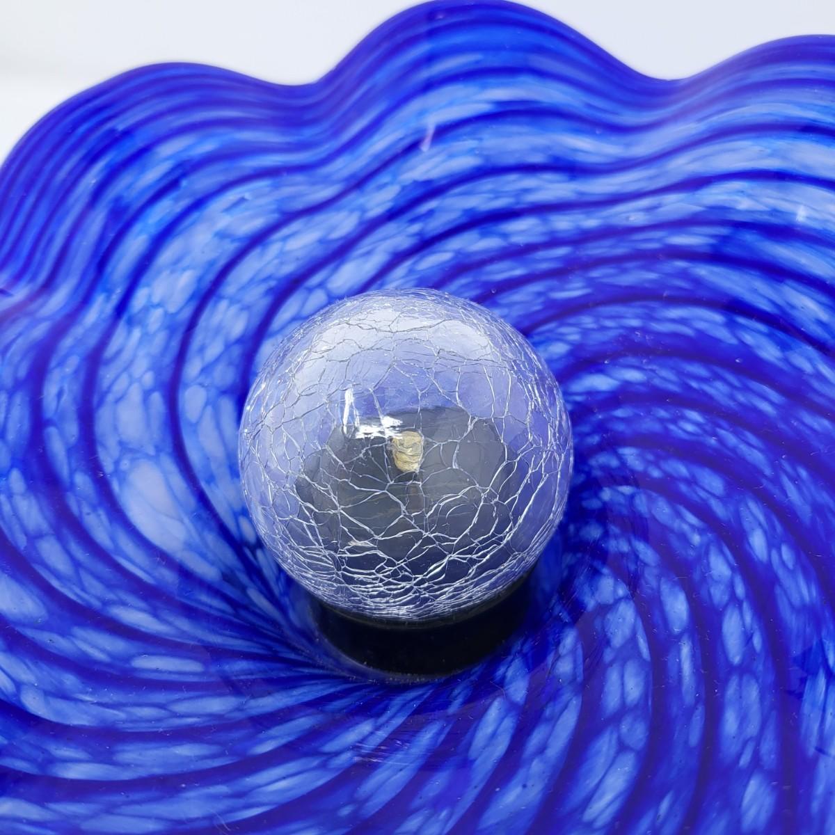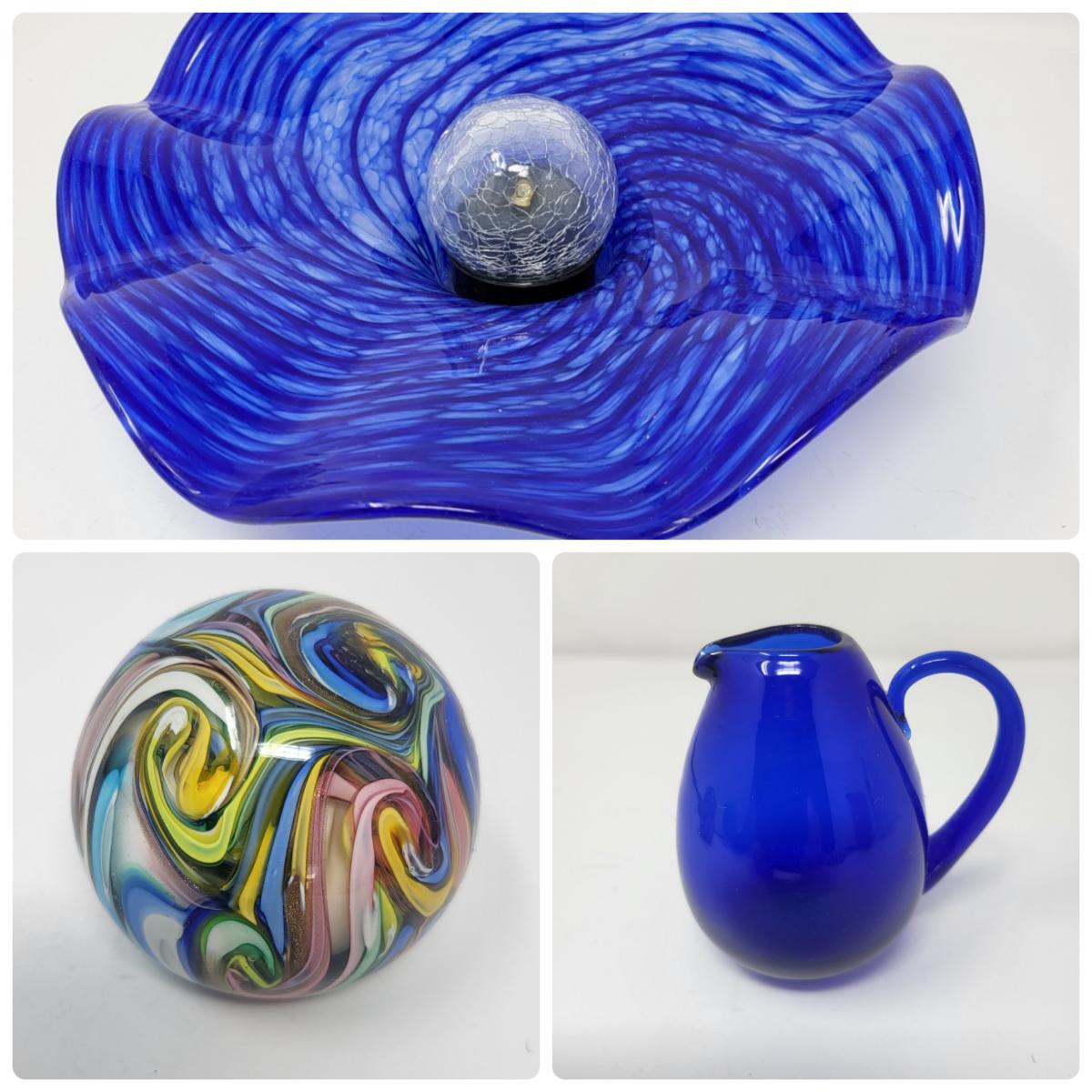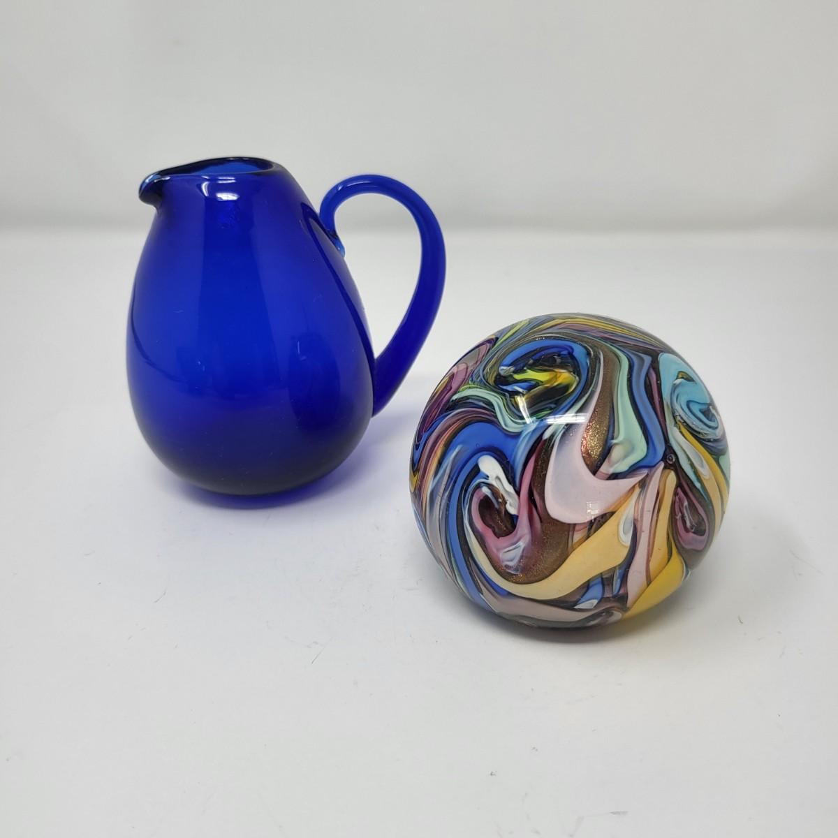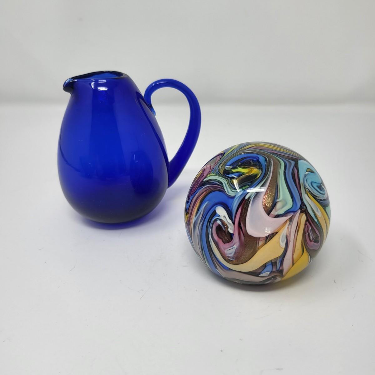 Mini cobalt pitcher is 4" tall. The rainbow swirled orb paperweight with flat bottom is 3" diameter. 10.5" wavy edge blue swirl glass decorative piece with crackle glass center orb. Center needs new bulb to light up. Two 8.25" cobalt & clear plates.