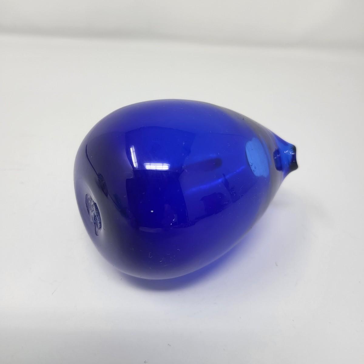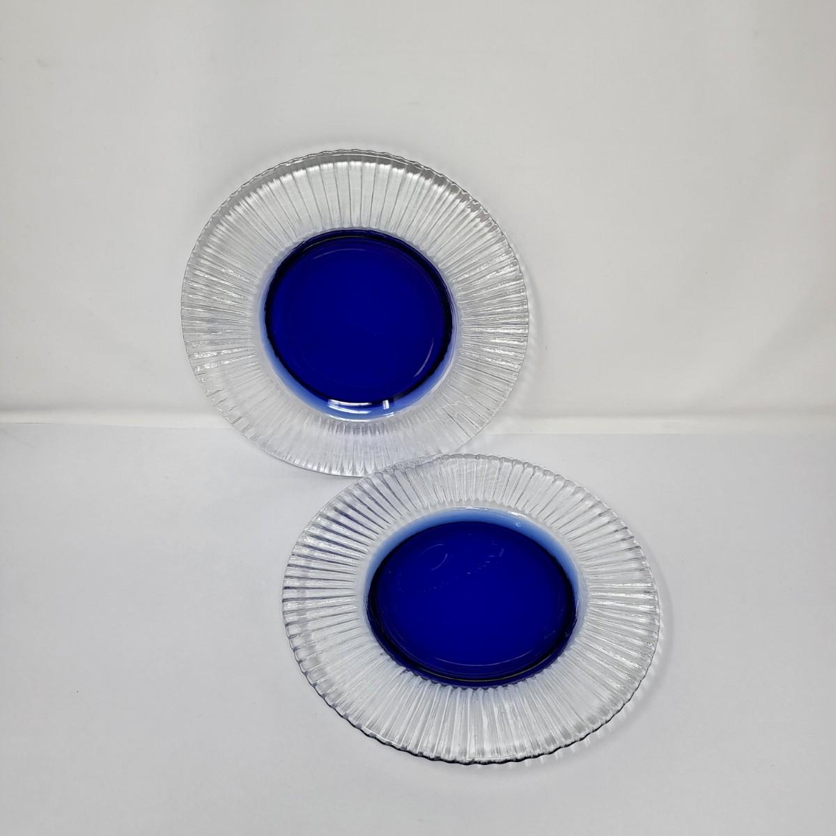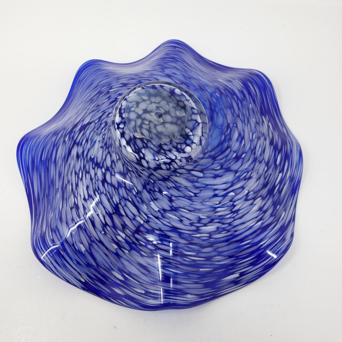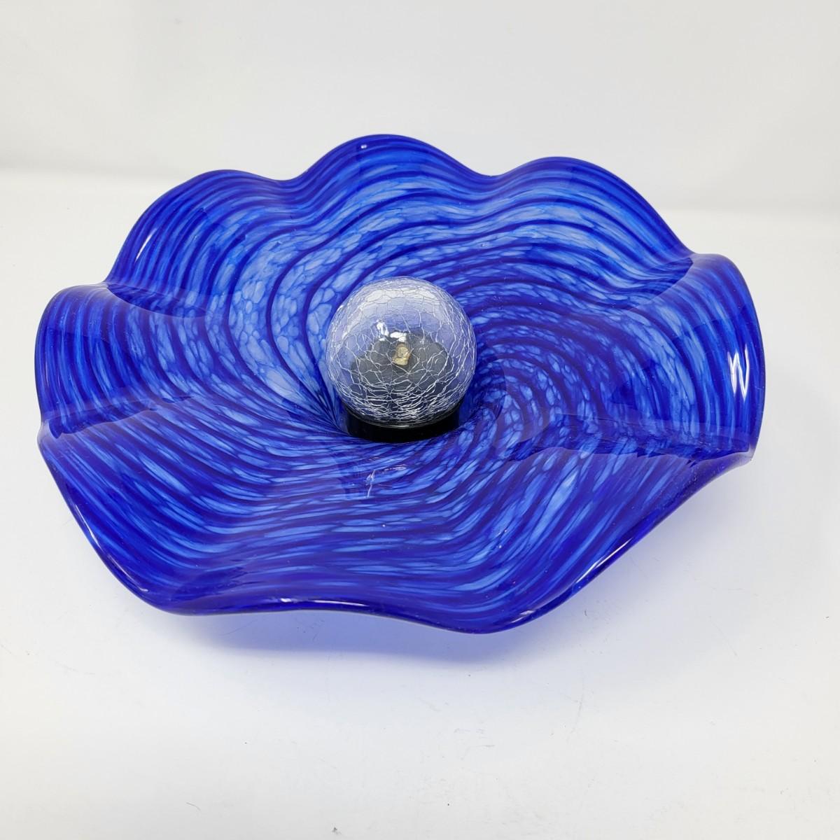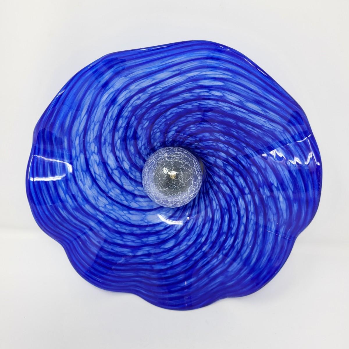 Mini cobalt pitcher is 4" tall. The rainbow swirled orb paperweight with flat bottom is 3" diameter. 10.5" wavy edge blue swirl glass decorative piece with crackle glass center orb. Center needs new bulb to light up. Two 8.25" cobalt & clear plates.