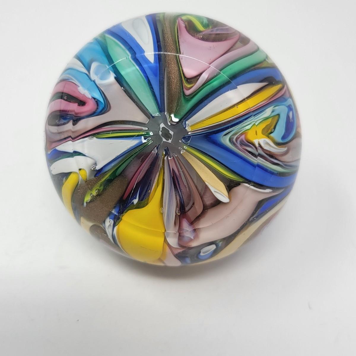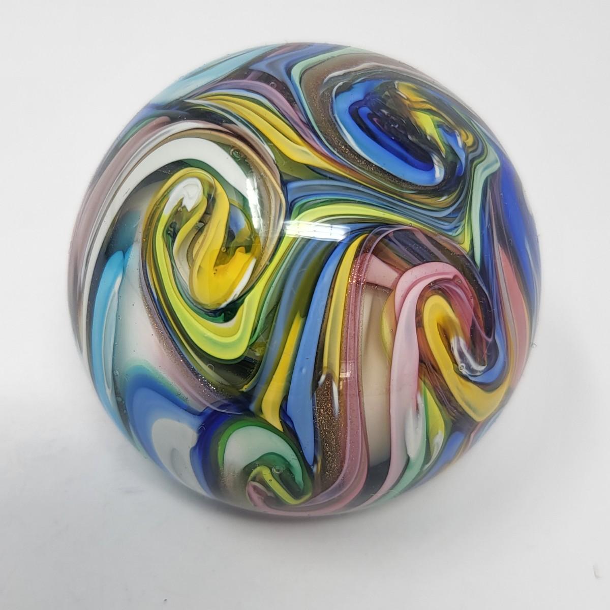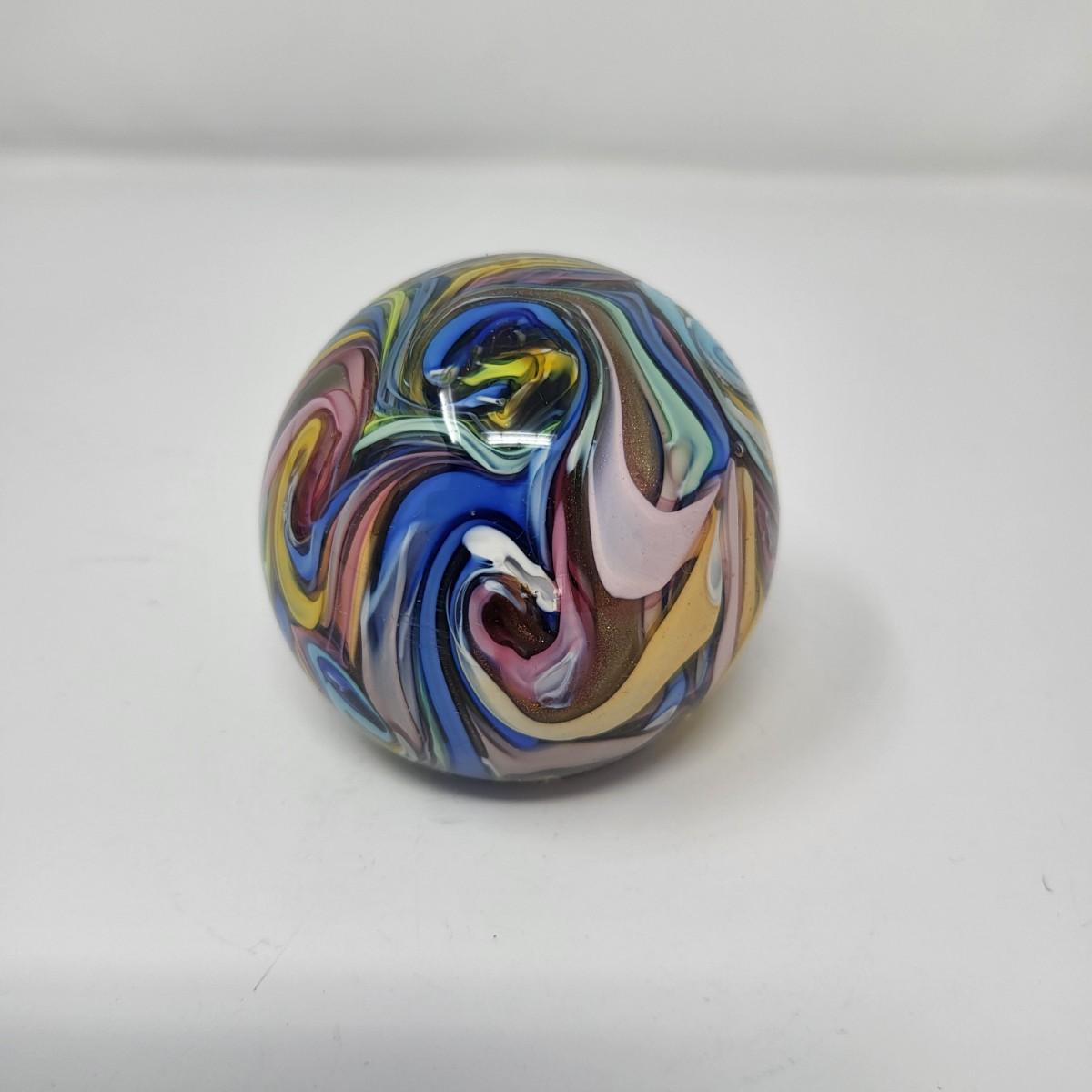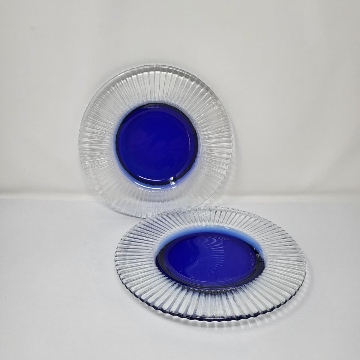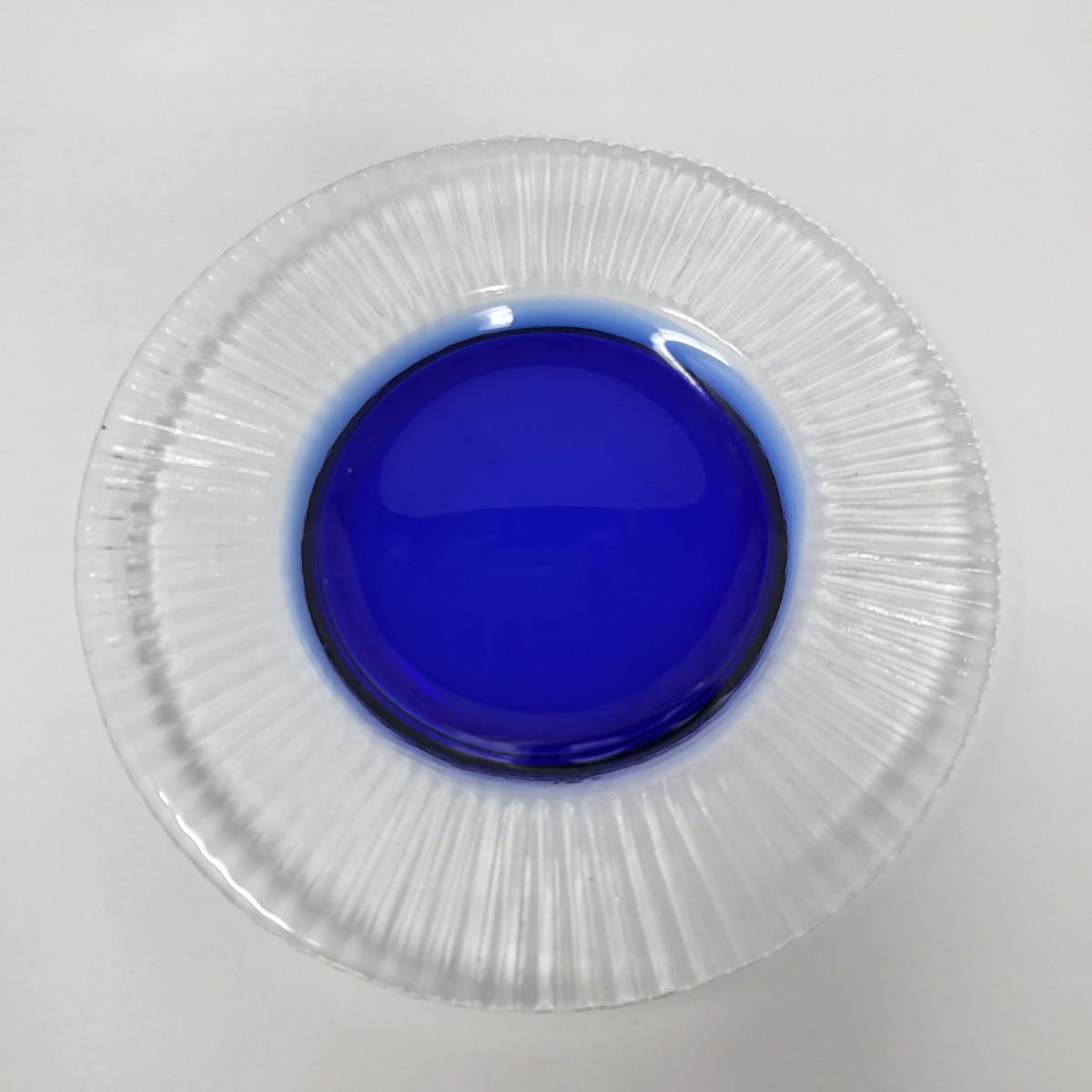 Mini cobalt pitcher is 4" tall. The rainbow swirled orb paperweight with flat bottom is 3" diameter. 10.5" wavy edge blue swirl glass decorative piece with crackle glass center orb. Center needs new bulb to light up. Two 8.25" cobalt & clear plates.