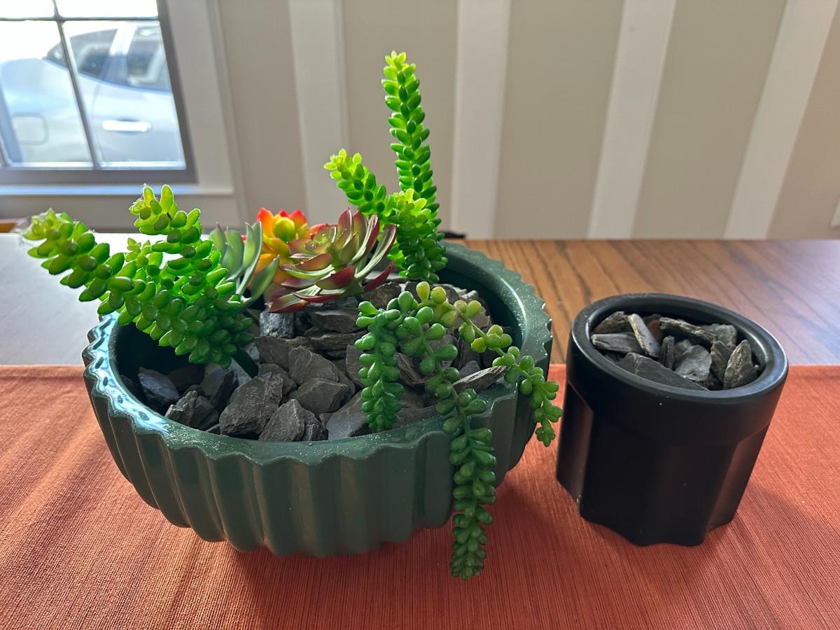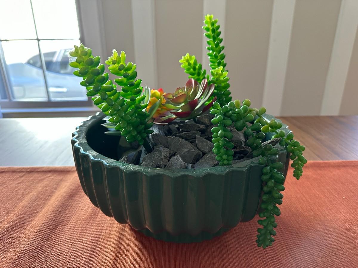 Green Arrangement Bowl w/Artificial Succulents is 12"w. Black Pot is 5"h