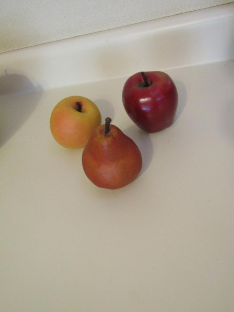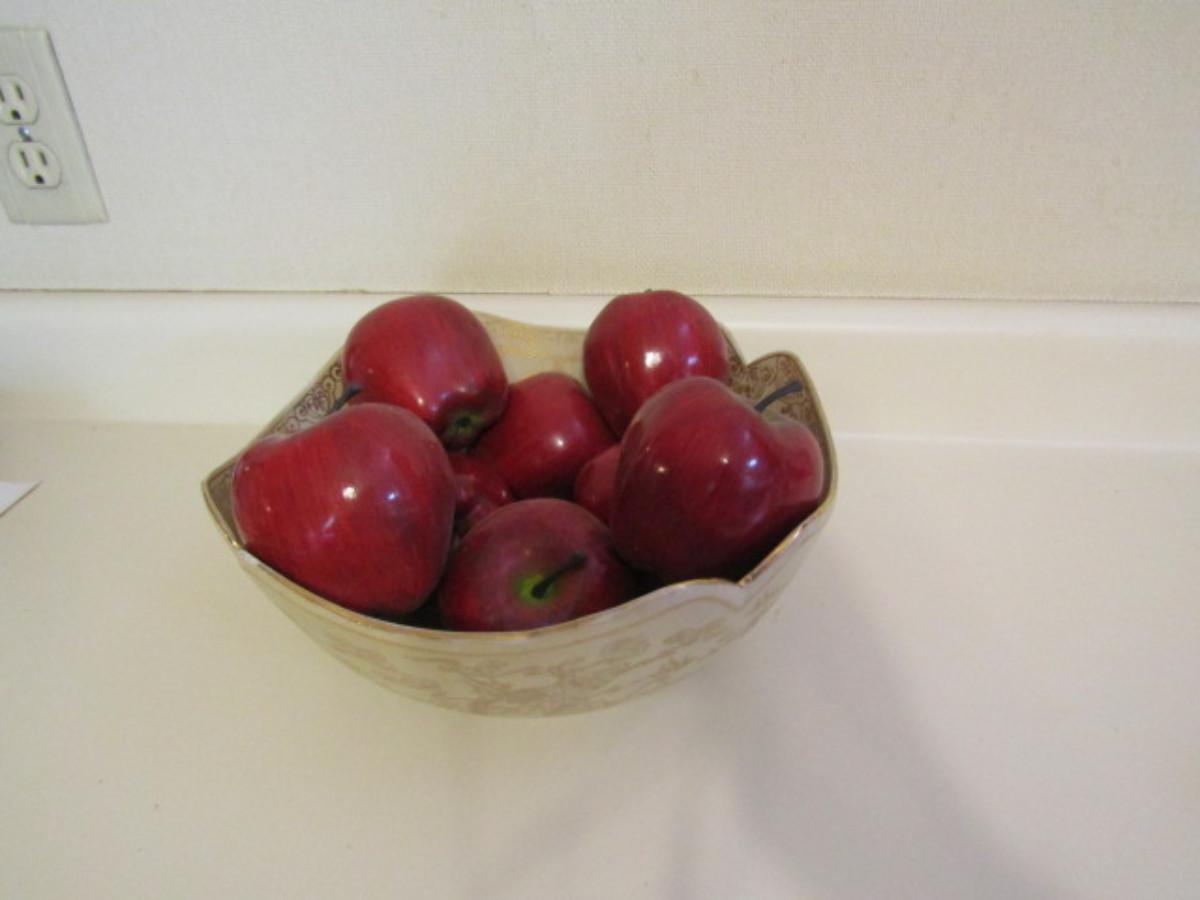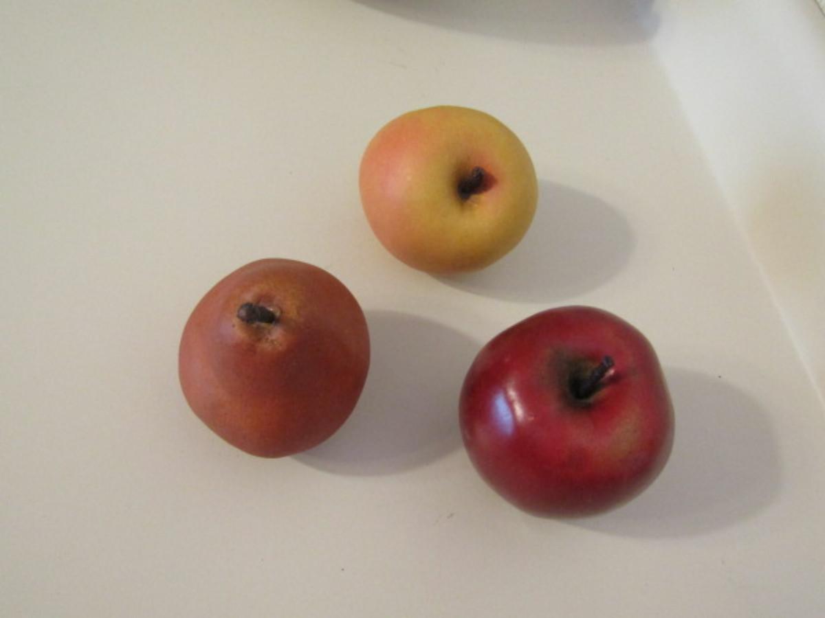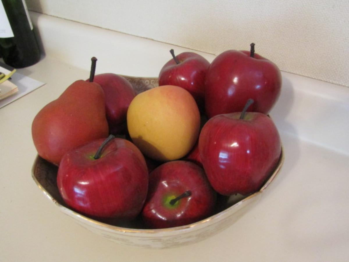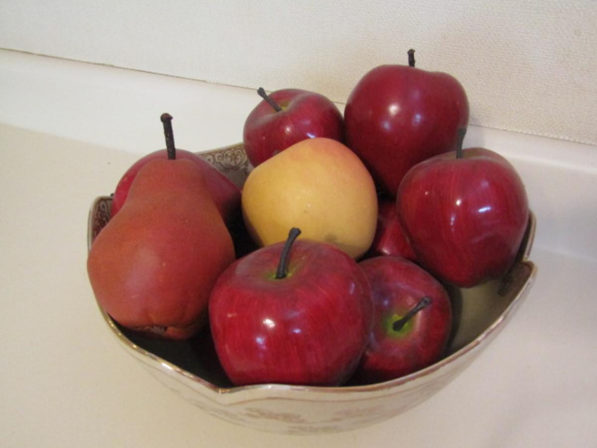 Decorative Bowl with Fruit. Three pieces of 'fruit' are wooden, the rest are plastic.