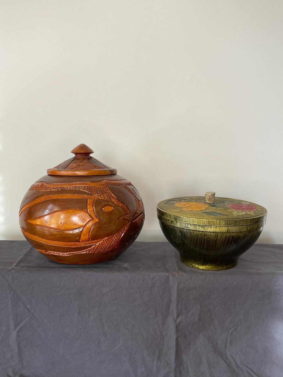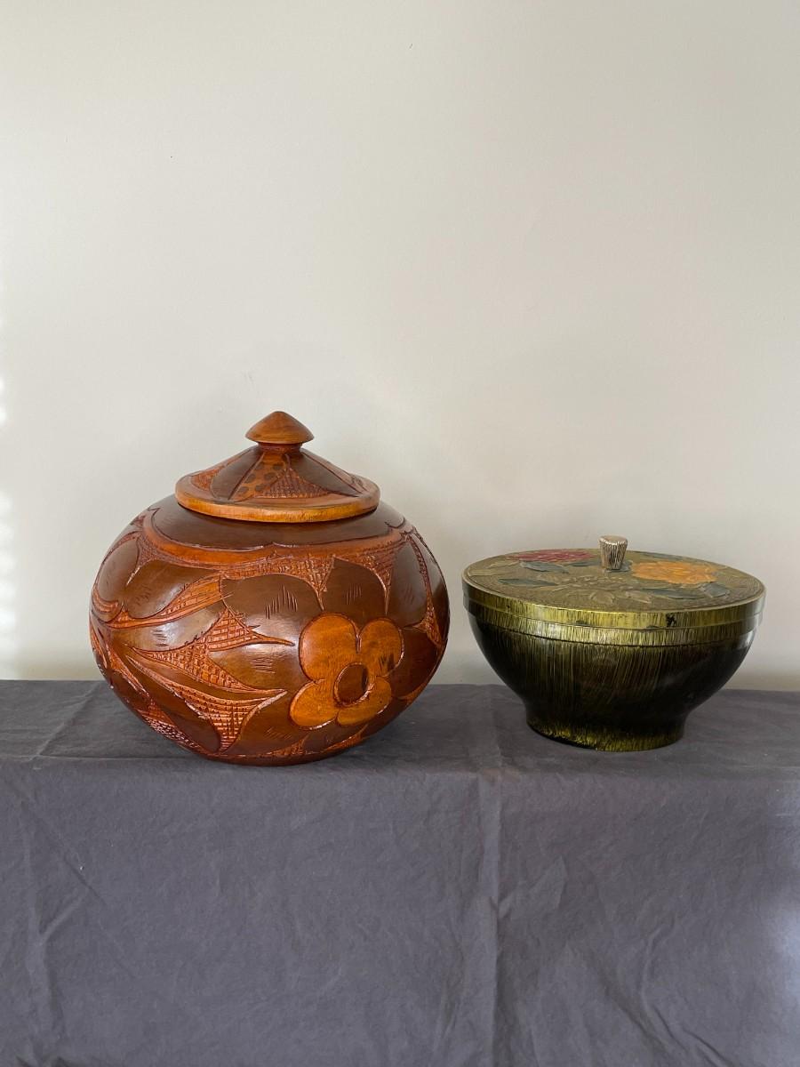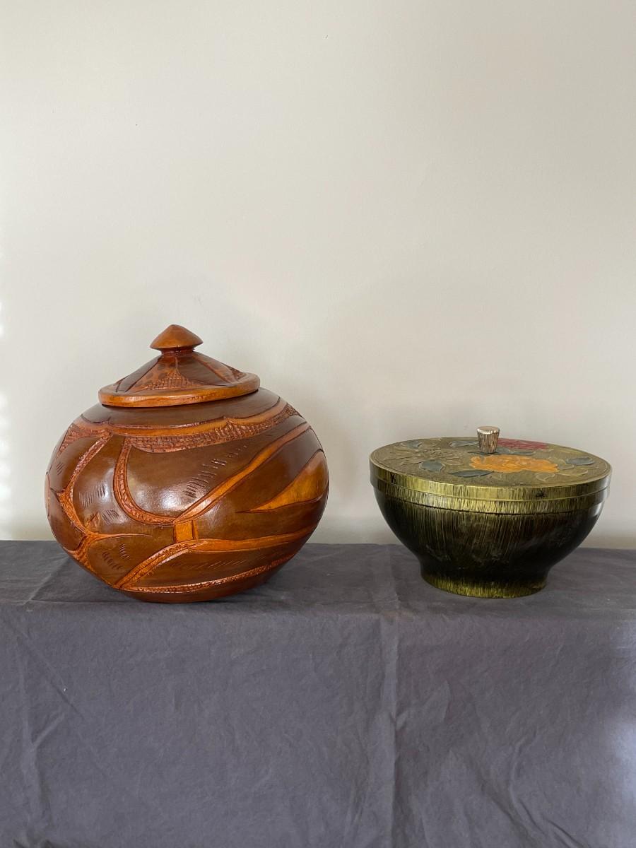 Wooden carved bowl and golden floral print bowl. The largest measures 7 1/2"H x 8"W