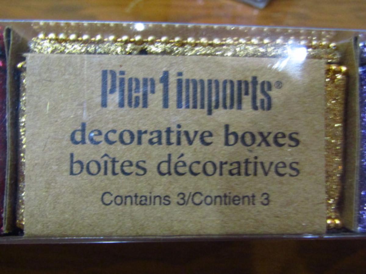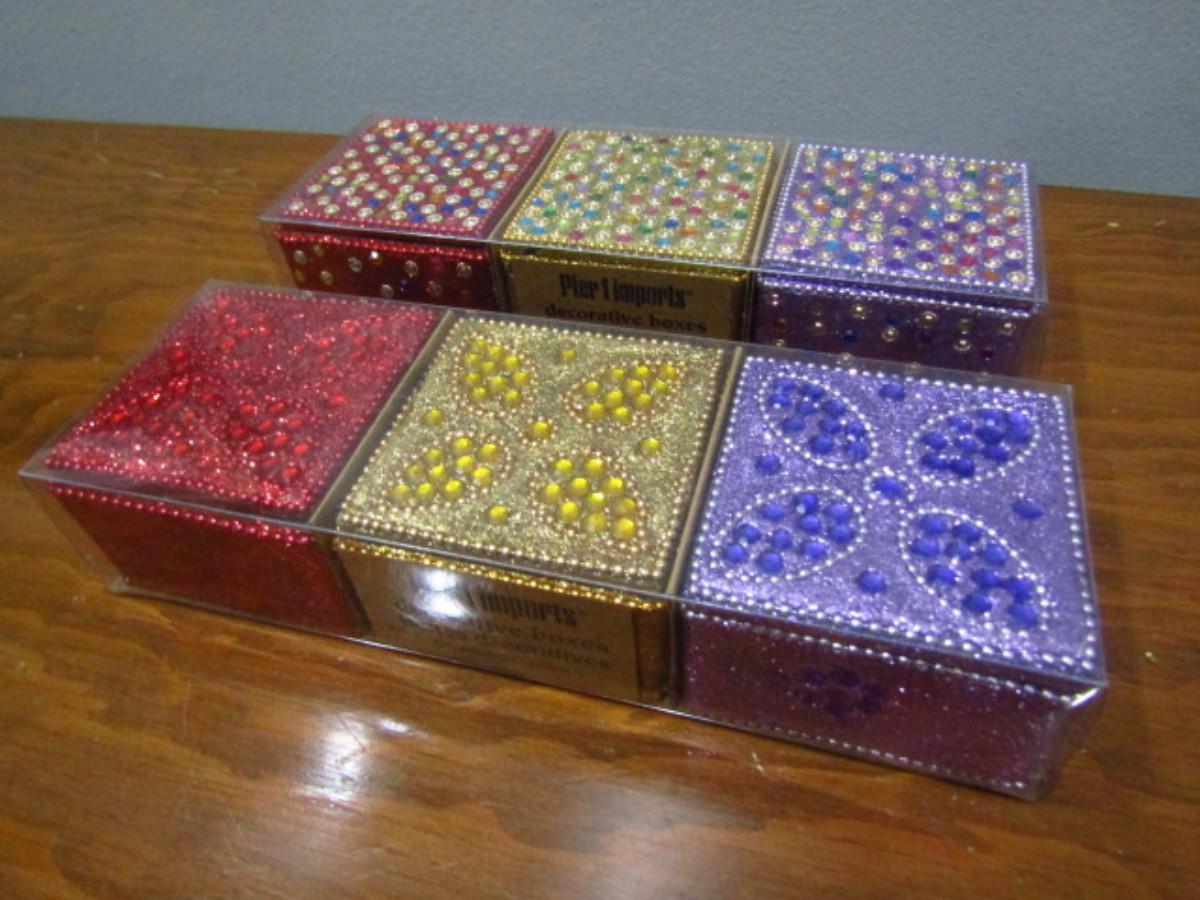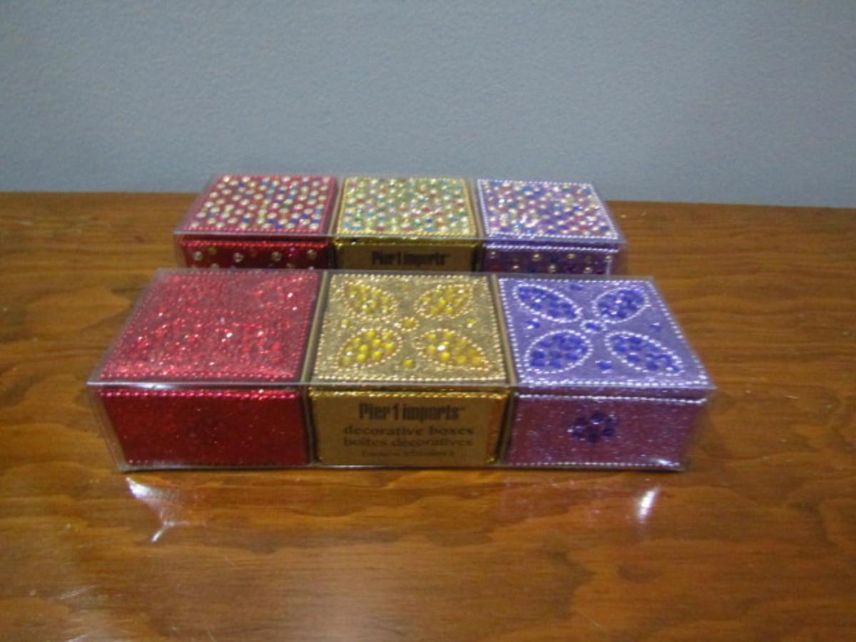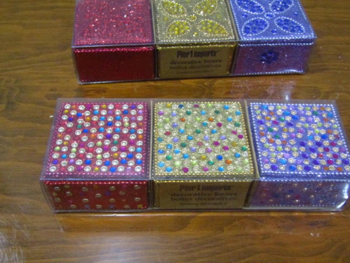 Decorative Boxes from Pier 1 Imports (LR). Two sets of three= six pieces. Measures approx 2 3/4" square x 1 3/4" tall.