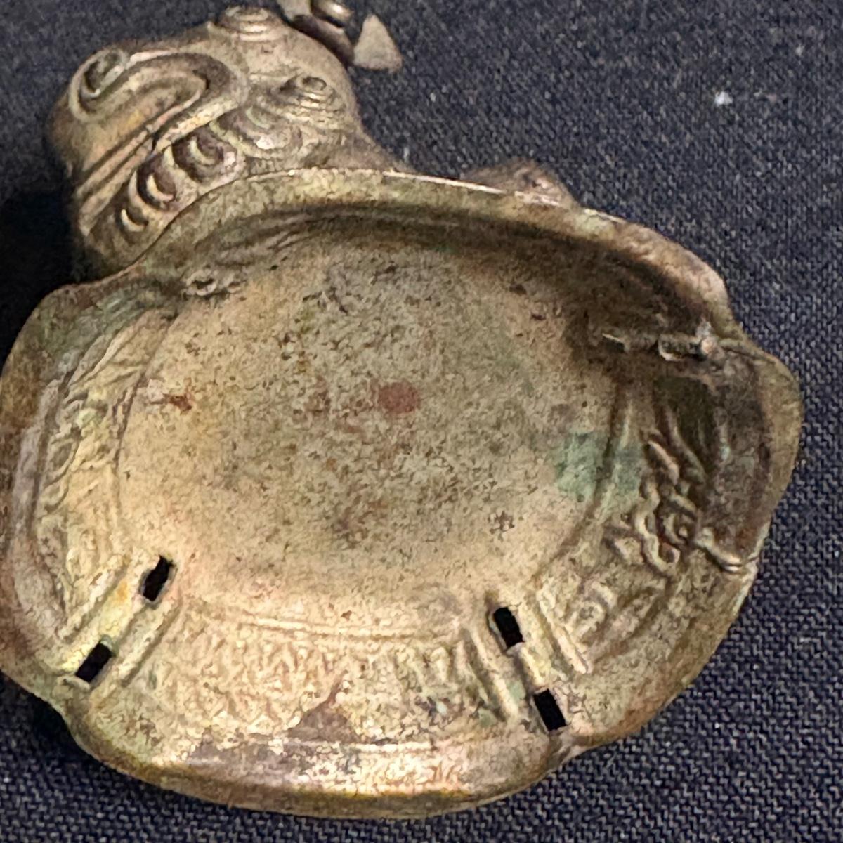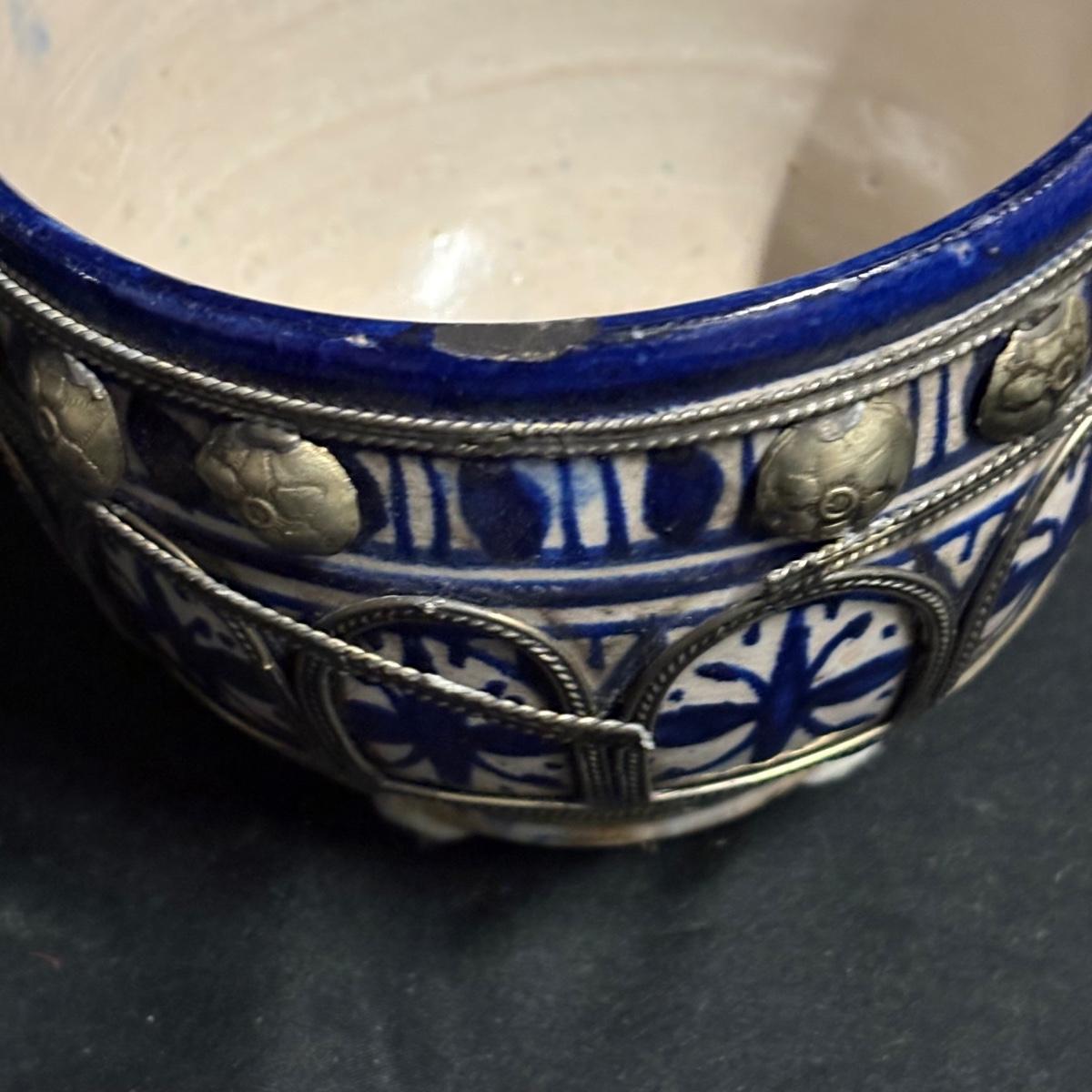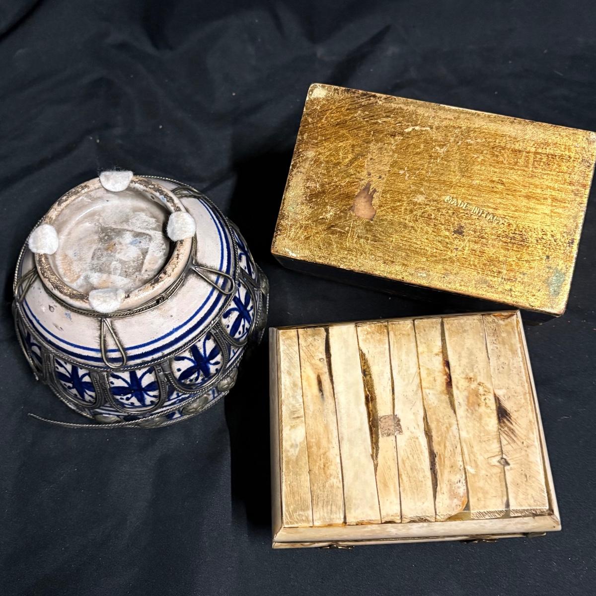 Ceramic jar has 5” diameter and is 9”H and has metal accents, one metal rope needs to be reattached -see picture. The cream-colored box is 5” x 4” x 2.5”H, actual material unknown. Blue box is wood with distressed finish. 5.75” x 3.5” x 3.75”H. Charming metal Foo dog figurine has movable ears.