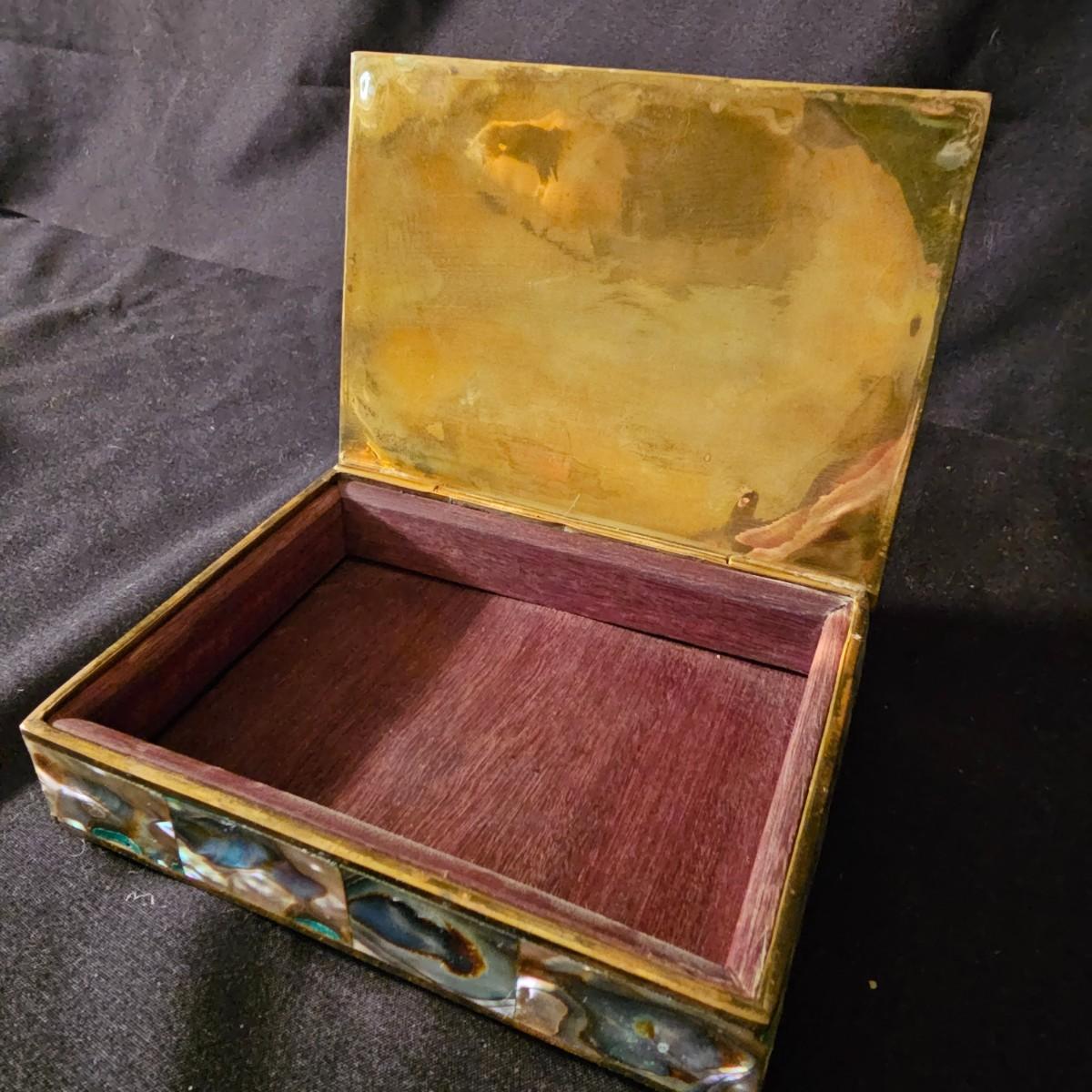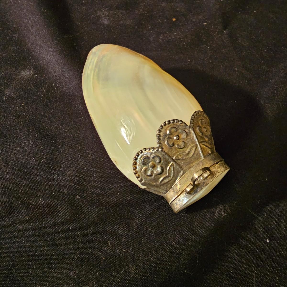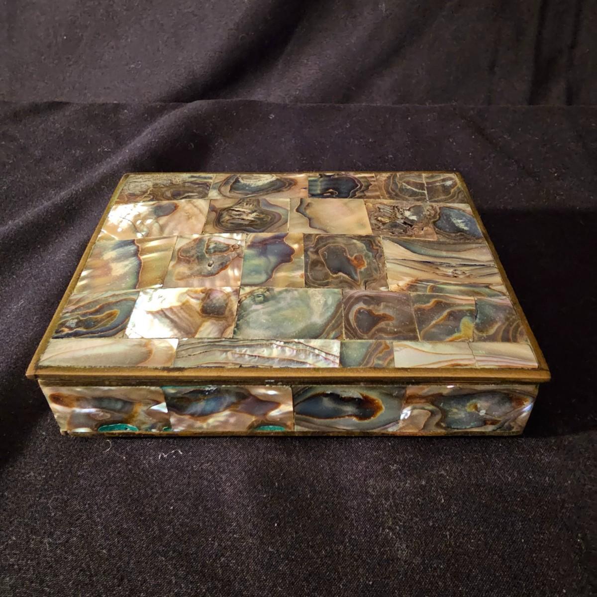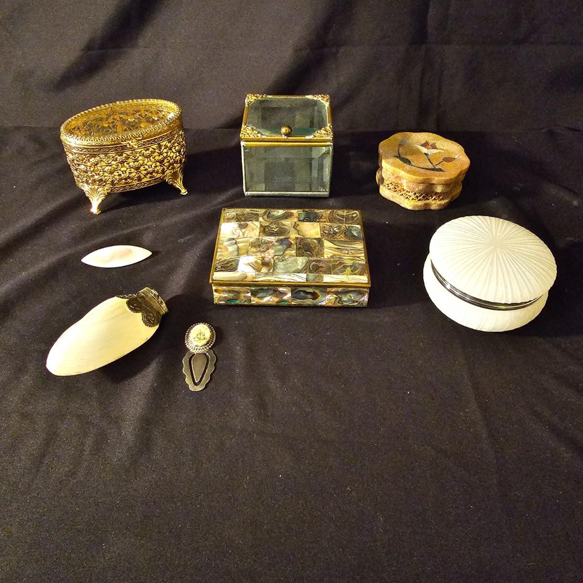 Several unique boxes of various materials. Rectangular item appears to be abalone shell and brass, made in Mexico. 4.5" x 3.5" x 1" h. Opaque white round box is 3.5" dia x 2" h. Beveled glass box is 3" sq x 2.5" h. Carved box with inlay lid is 3" dia x 1.5" h. One oval pin and one bookmark with a sailing ship on front. The last item appears to be two shells put together with a metal top. See photos for details. Shipping available.