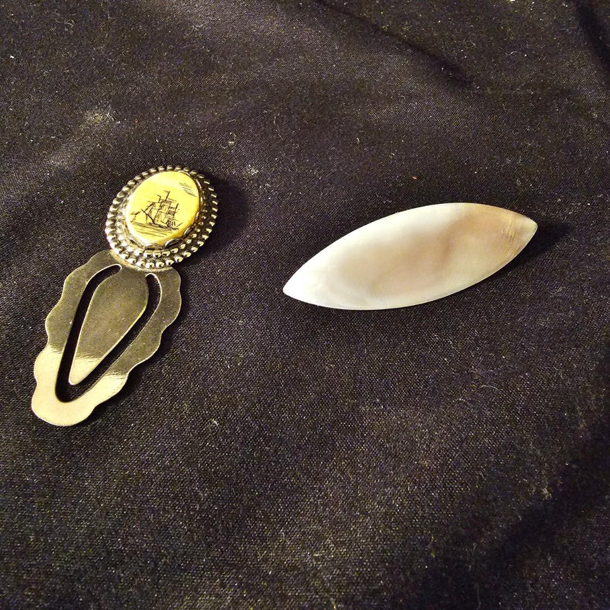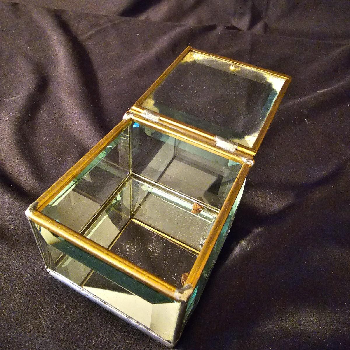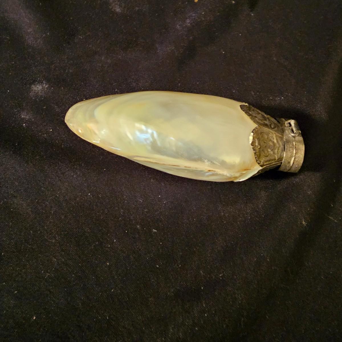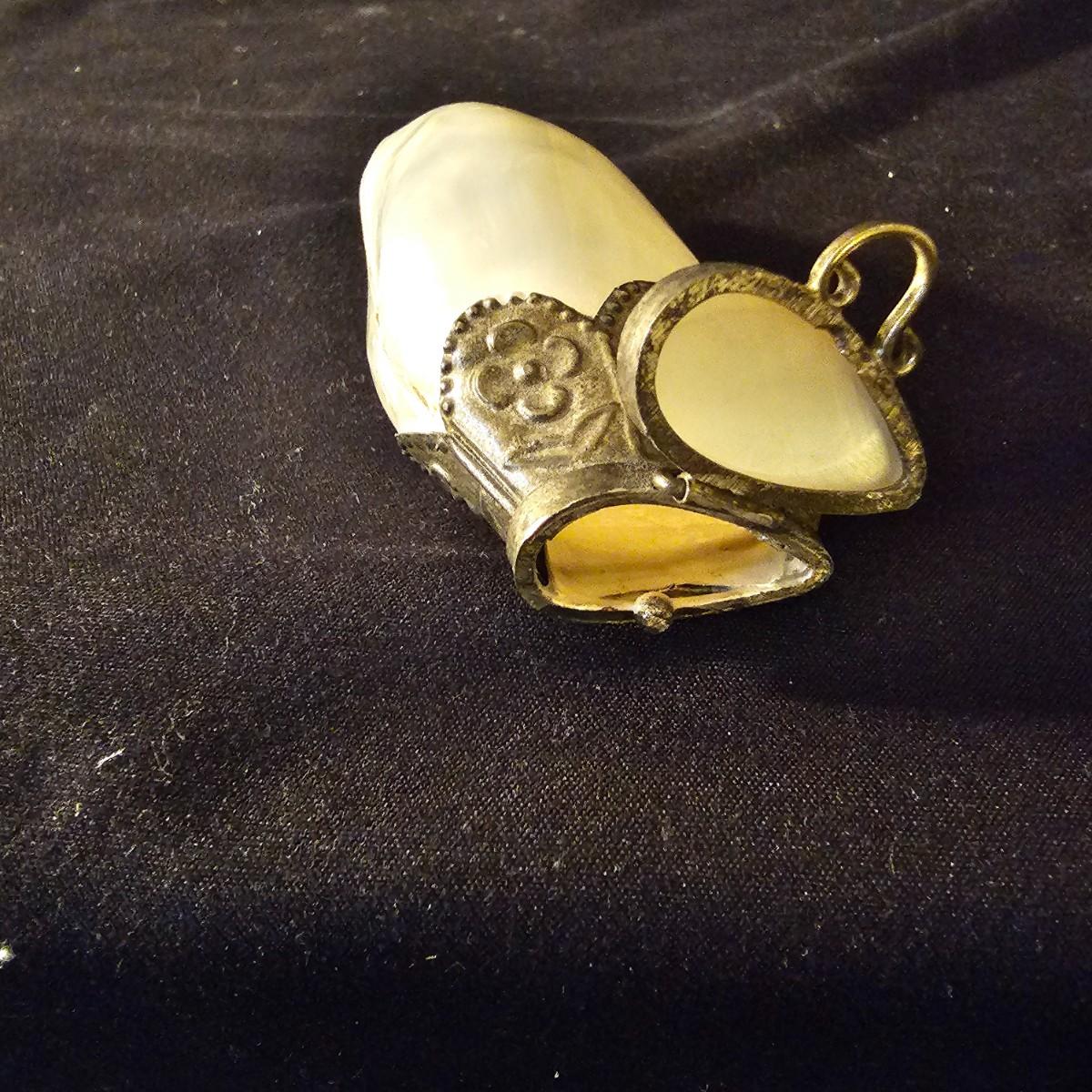 Several unique boxes of various materials. Rectangular item appears to be abalone shell and brass, made in Mexico. 4.5" x 3.5" x 1" h. Opaque white round box is 3.5" dia x 2" h. Beveled glass box is 3" sq x 2.5" h. Carved box with inlay lid is 3" dia x 1.5" h. One oval pin and one bookmark with a sailing ship on front. The last item appears to be two shells put together with a metal top. See photos for details. Shipping available.