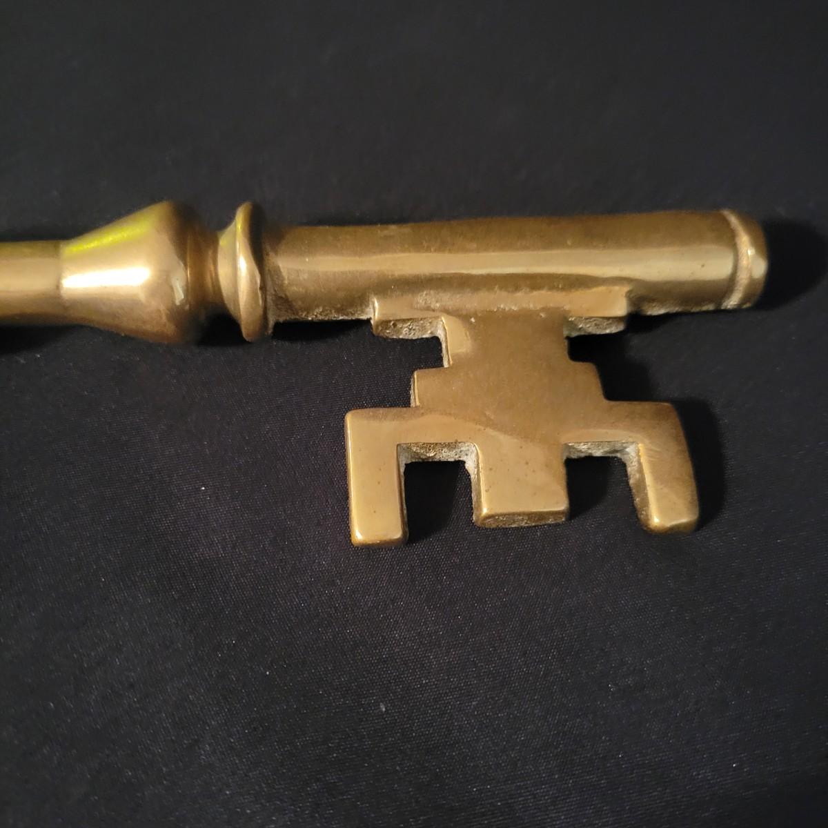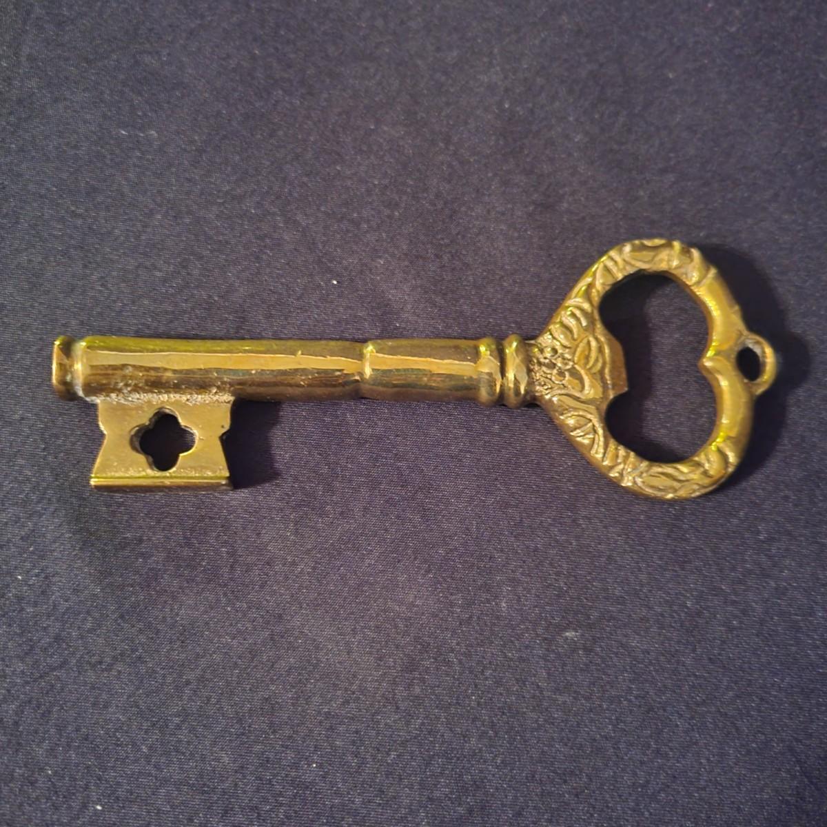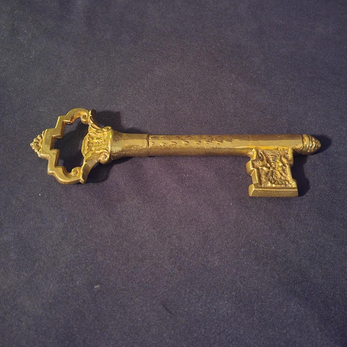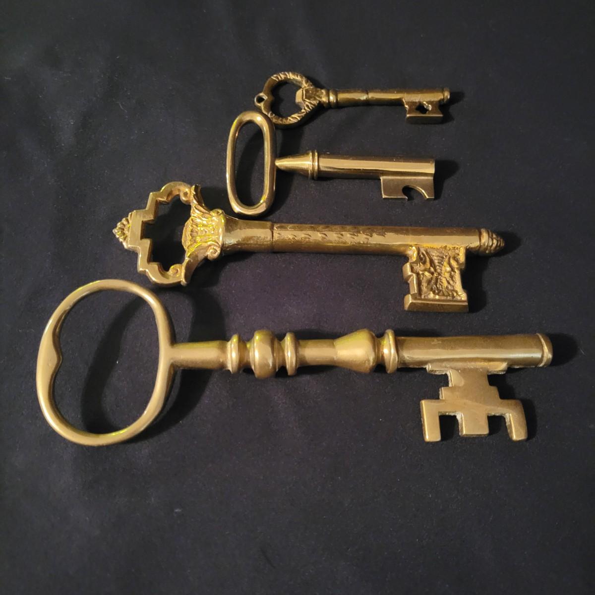 A collection of four decorative brass keys, the largest key measures approximately 9.5" x 3"H. Shipping available