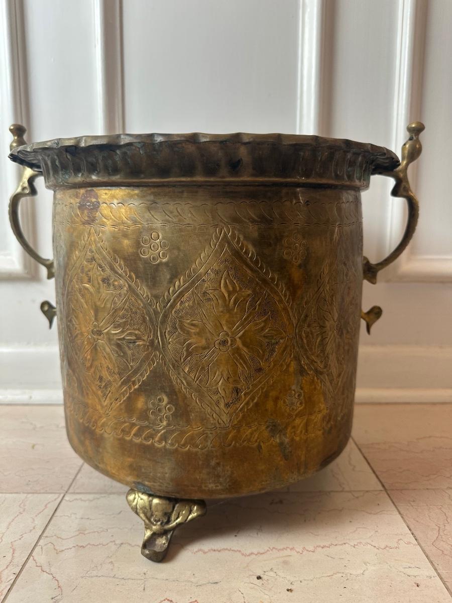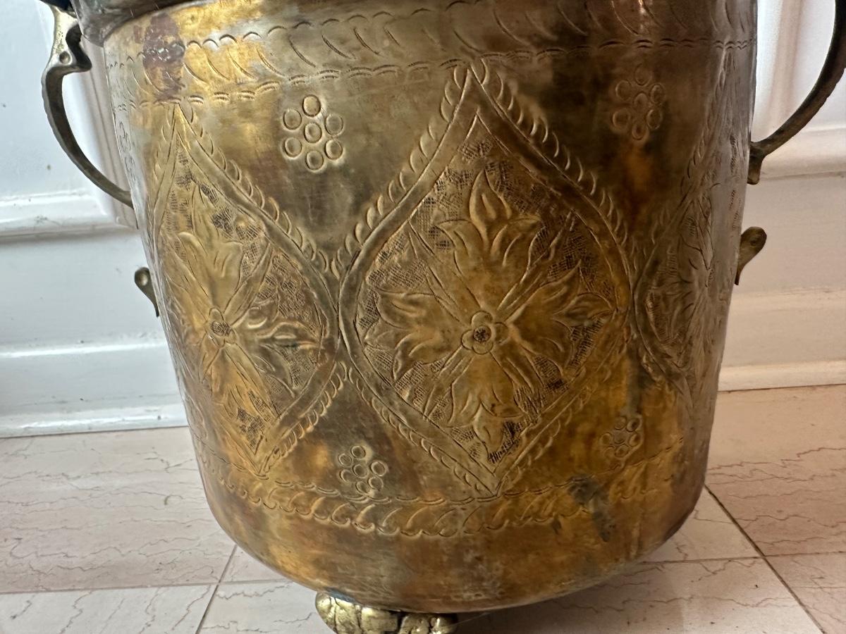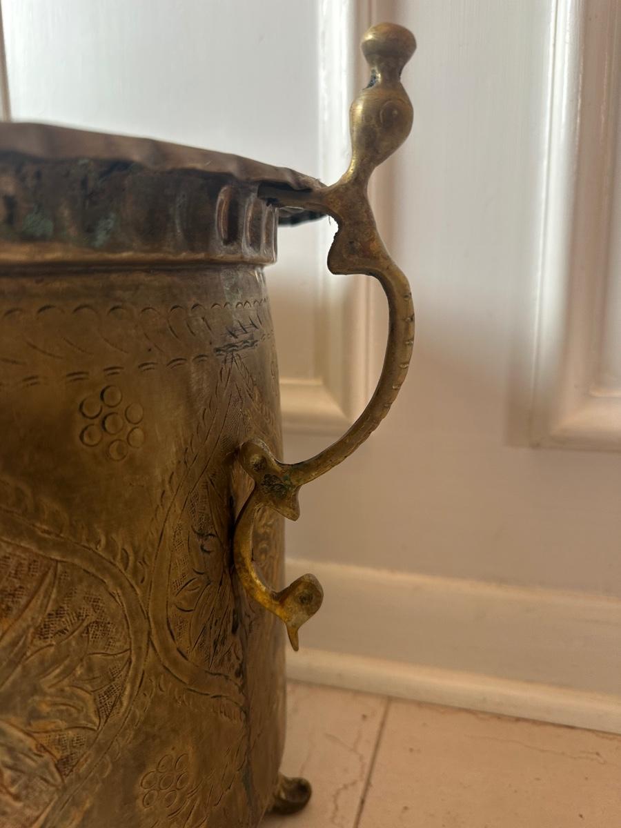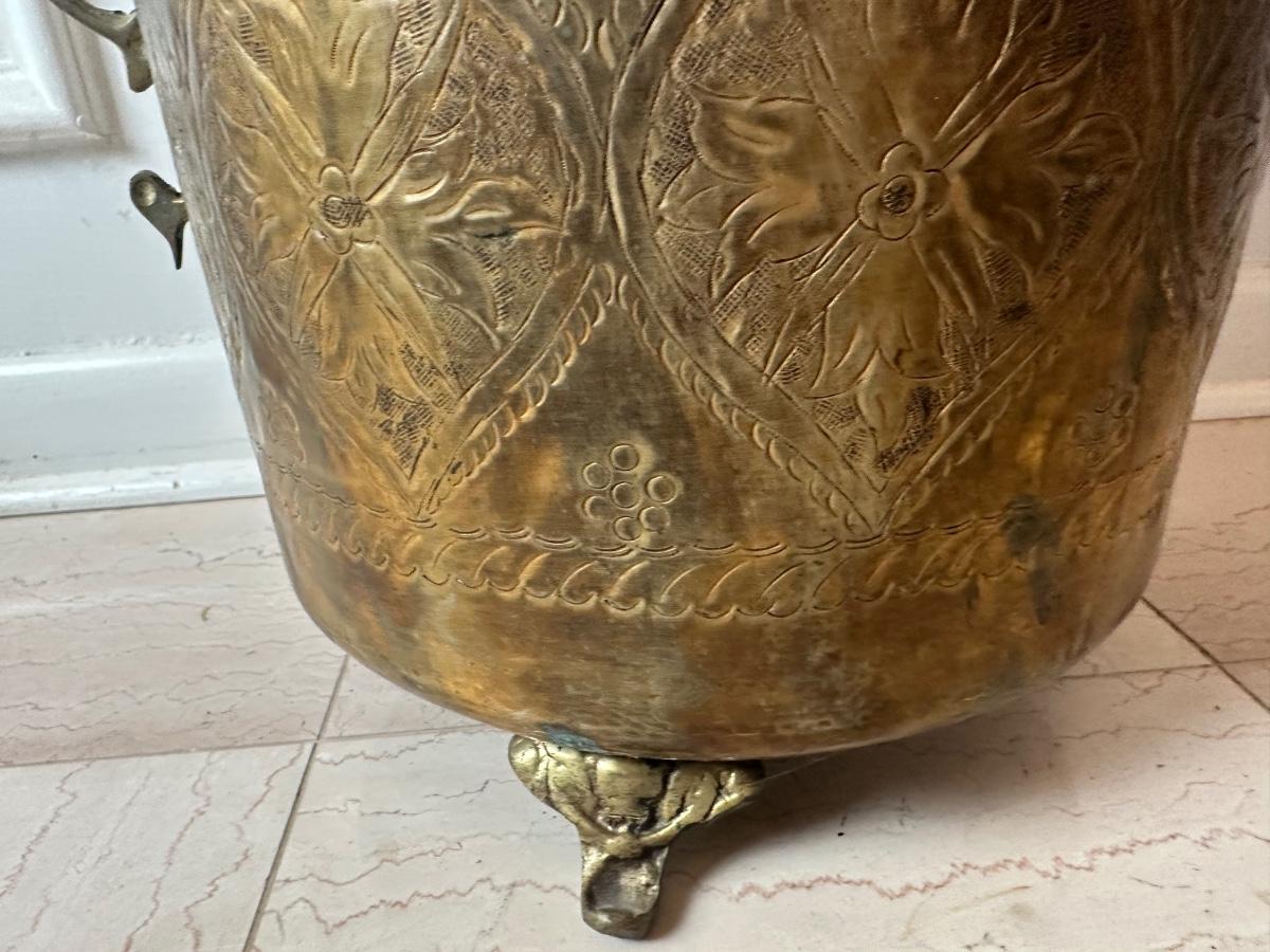 Decorative brass planter with embossed floral panels, scalloped rim, side handles, and three feet. Shows patina and interior oxidation from age and use. One handle is missing a screw and is loose. Suitable for decorative use or with a liner for plants.