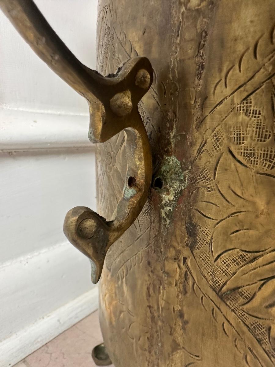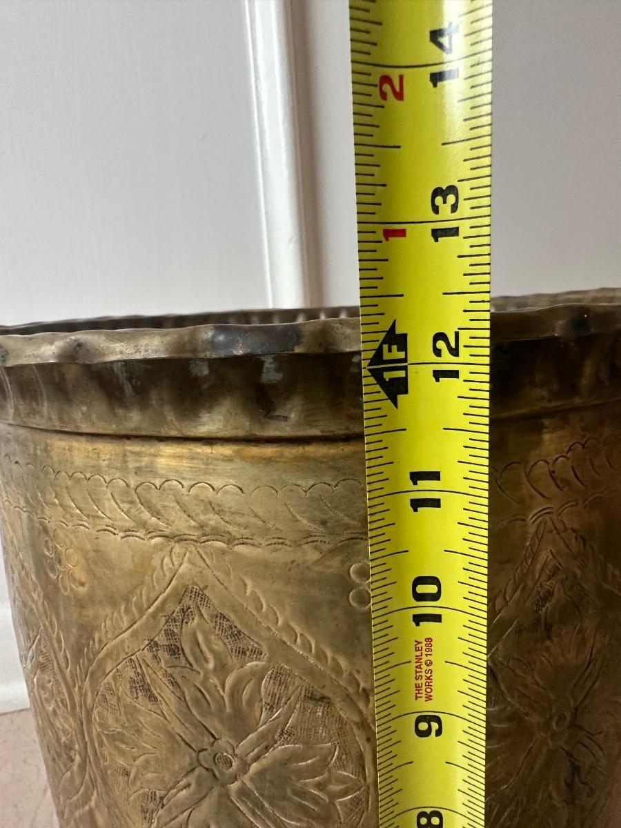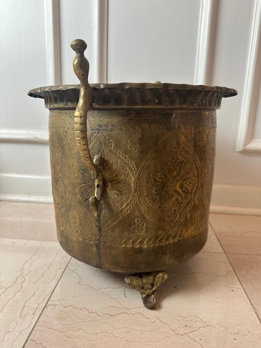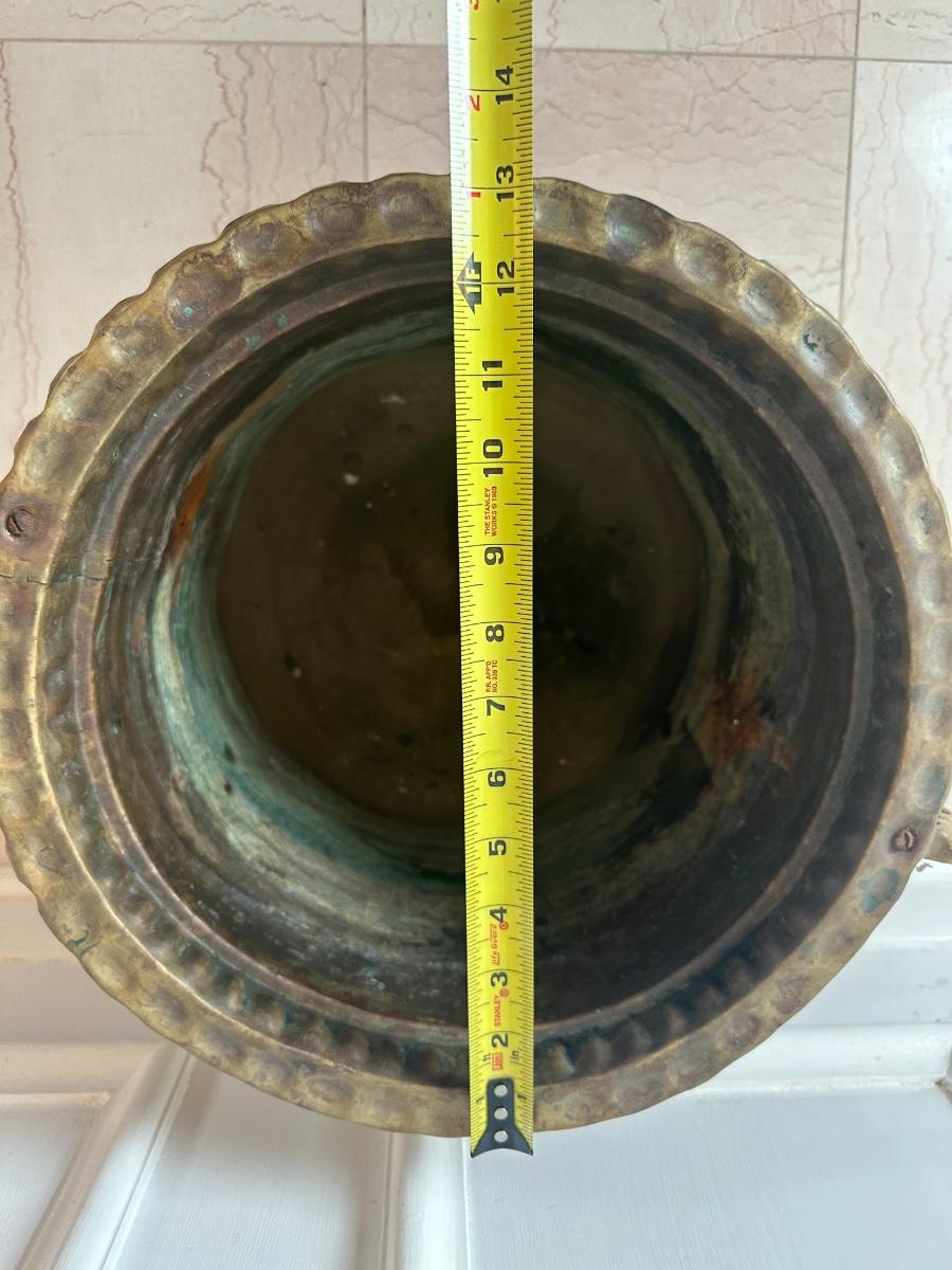 Decorative brass planter with embossed floral panels, scalloped rim, side handles, and three feet. Shows patina and interior oxidation from age and use. One handle is missing a screw and is loose. Suitable for decorative use or with a liner for plants.