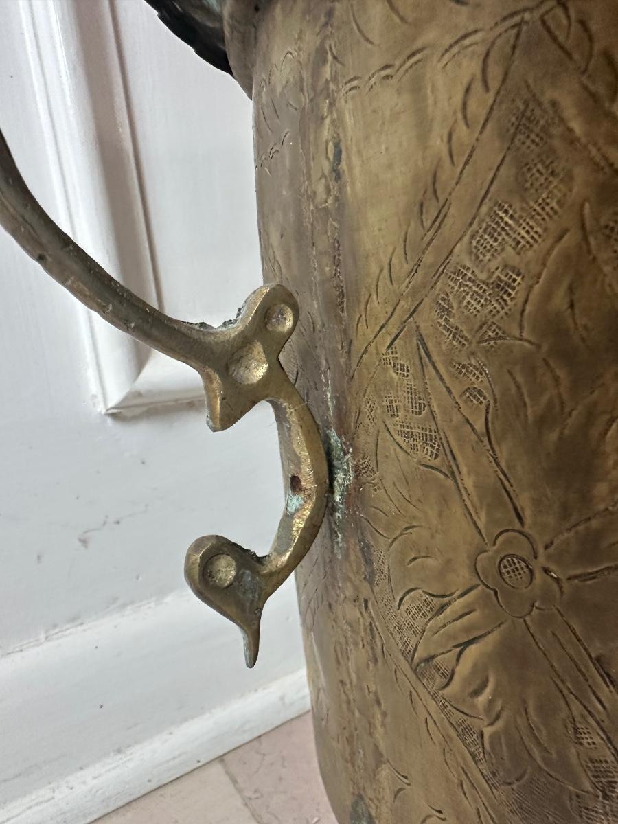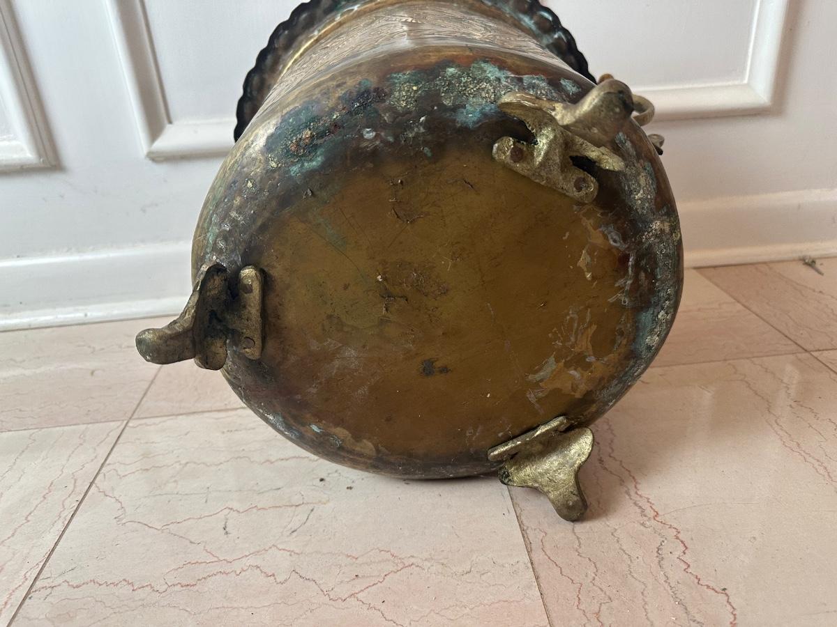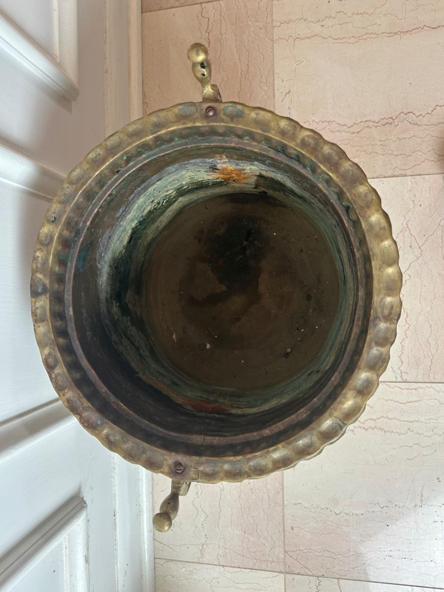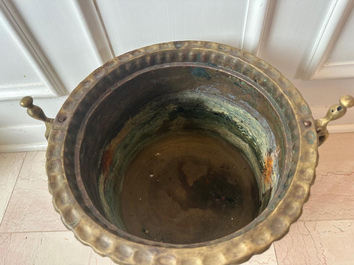 Decorative brass planter with embossed floral panels, scalloped rim, side handles, and three feet. Shows patina and interior oxidation from age and use. One handle is missing a screw and is loose. Suitable for decorative use or with a liner for plants.