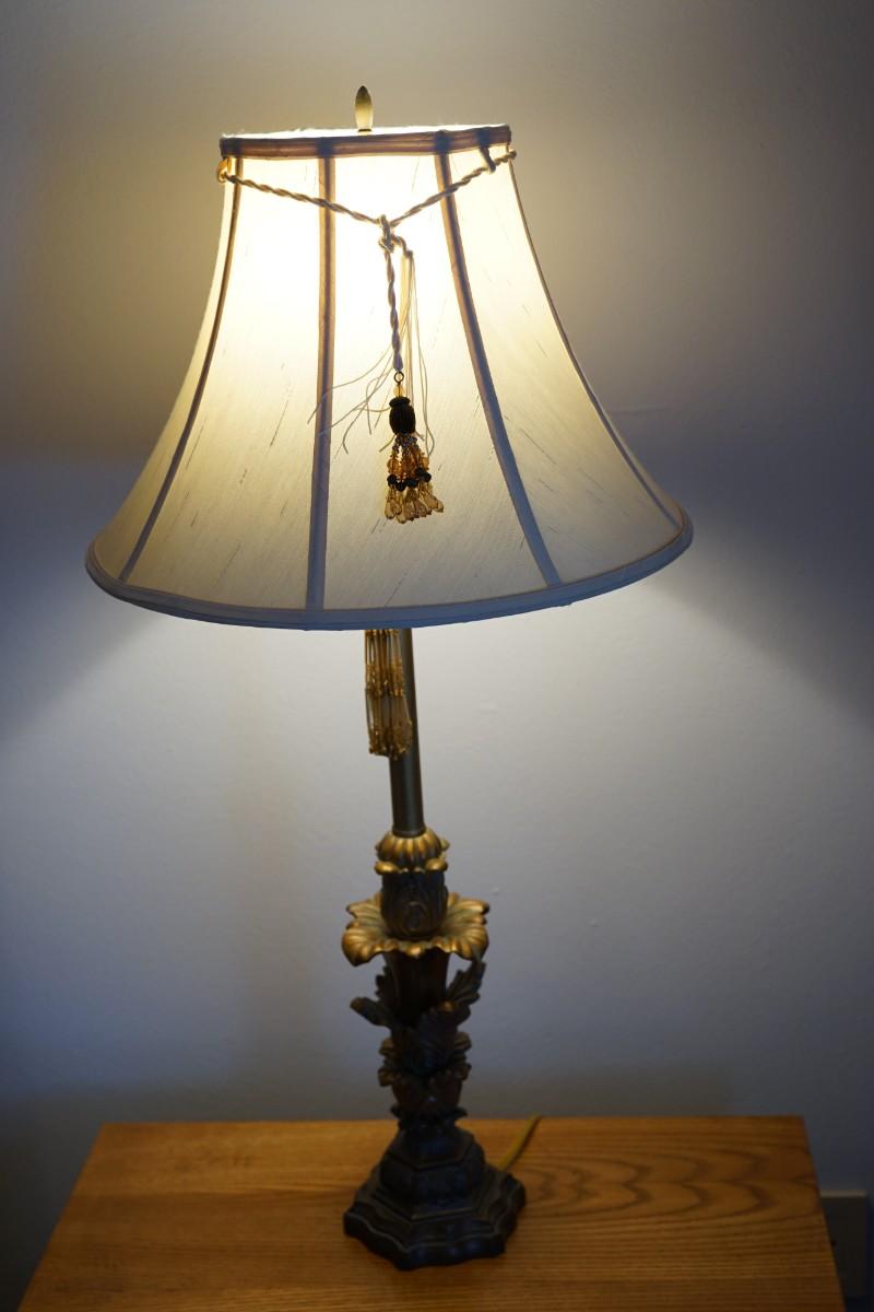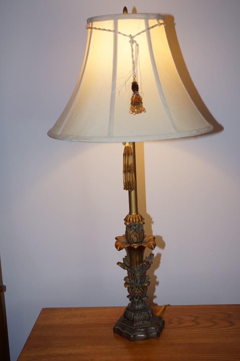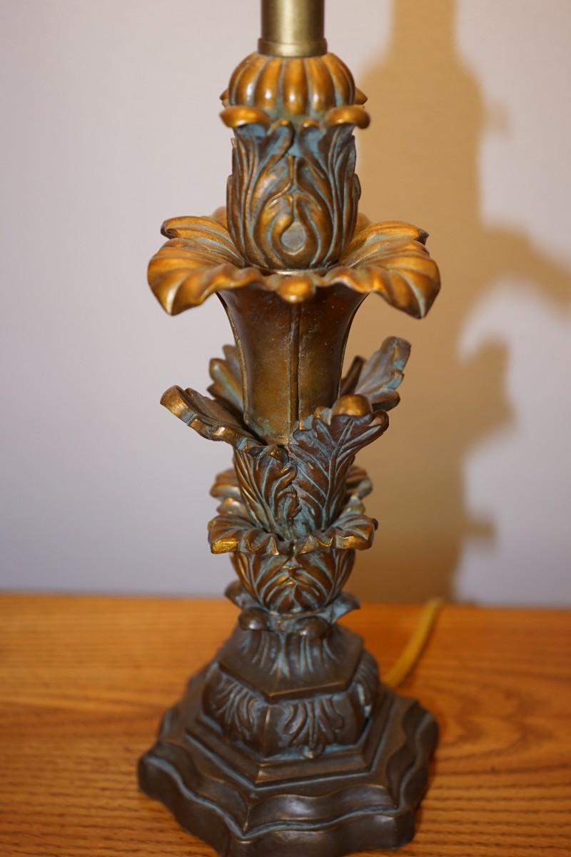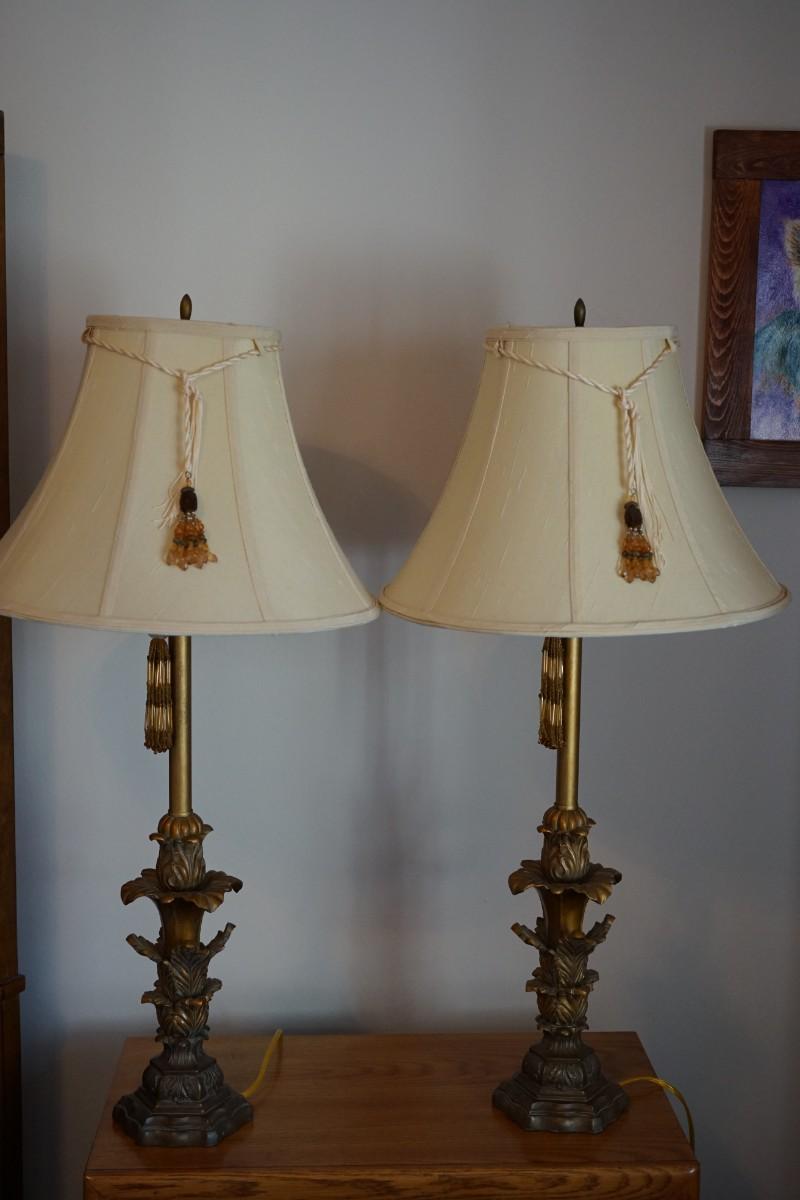 DECORATIVE BRONZE TONE TABLE LAMPS WITH ACANTHUS LEAVES /SILK SHADES W/ BEADED TASSLES