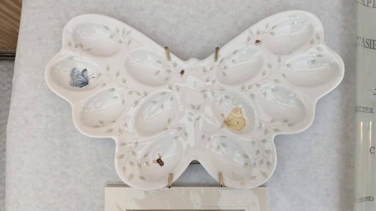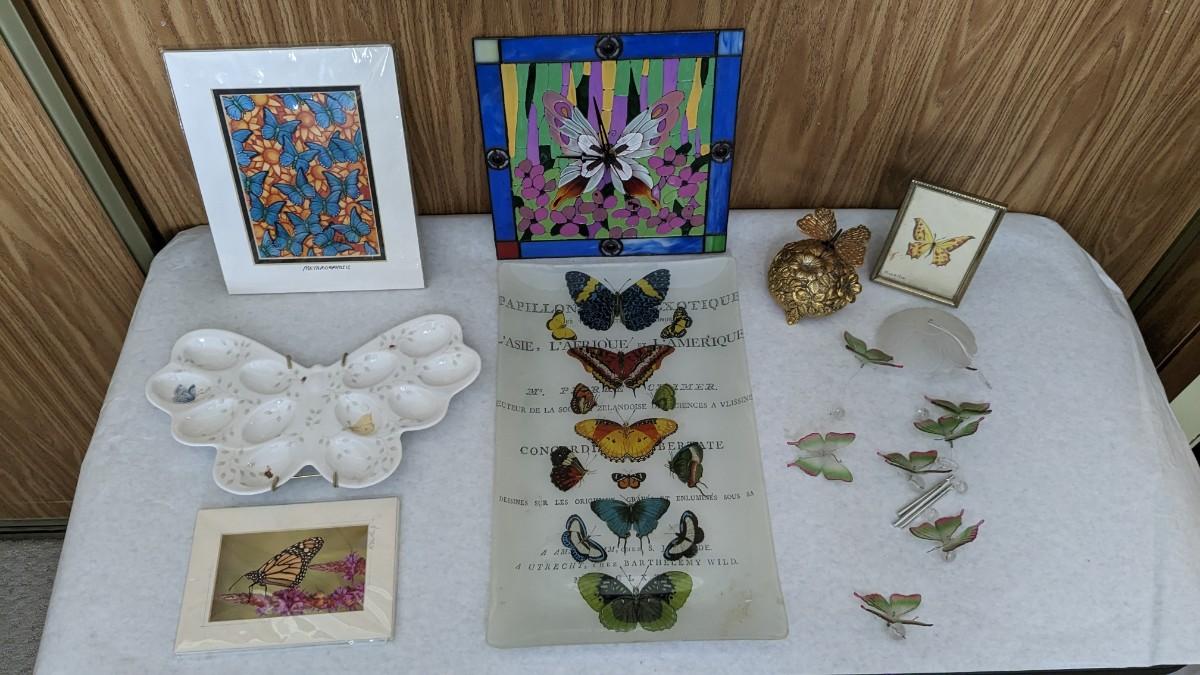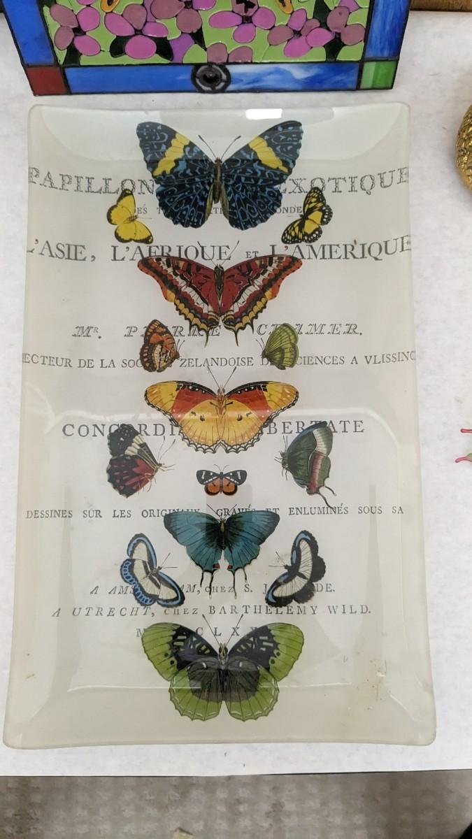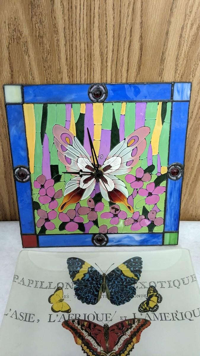 lots of butterfly specific home items in this one. Includes Lenox butterfly deviled egg plate, prints, wind chime, a stunning articulating Westland music box that is fully operational, and a gorgeous stained glass tile turned clock. Beautiful items in this one. Specialty handling will apply, please inquire for more details. bdrm2