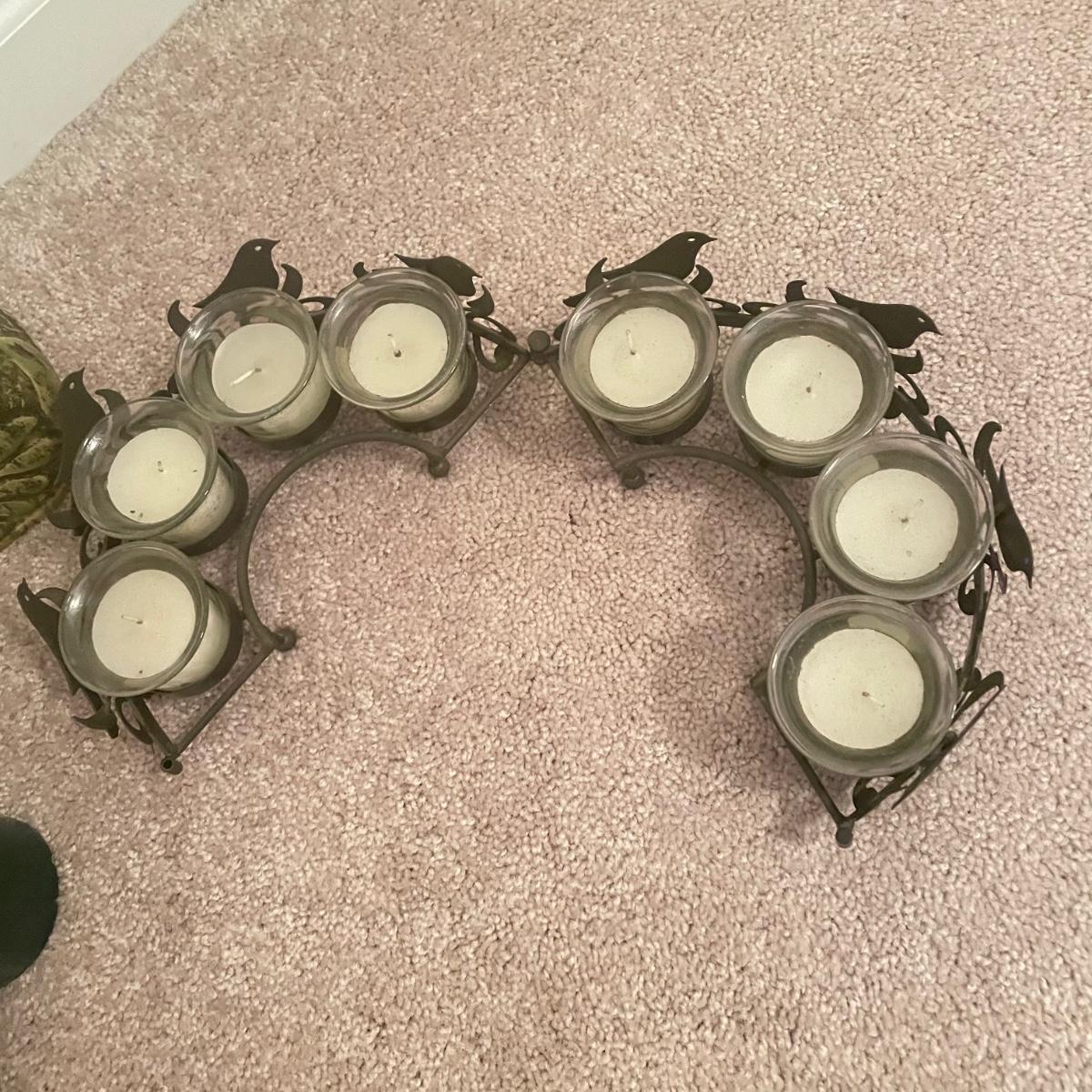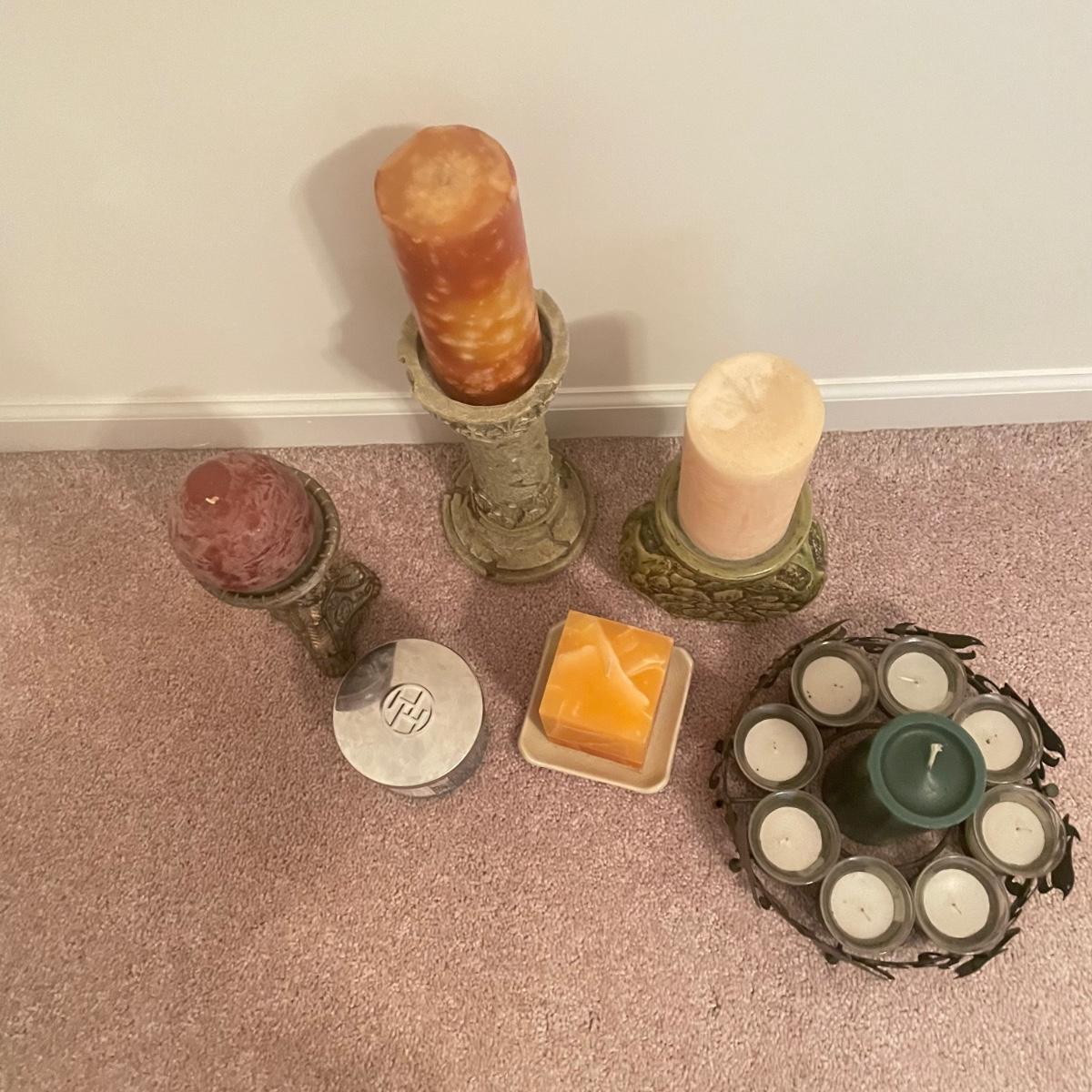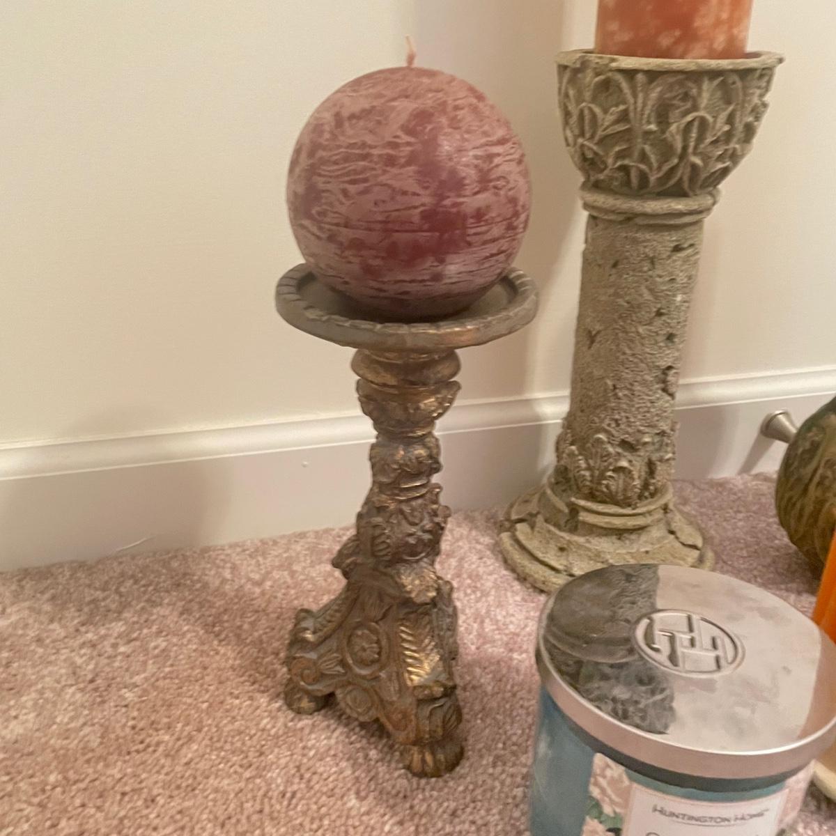 Decorative candle holders with scented wax candles. The rounded vase style holder is ceramic, the other two appear to be resin. Lot includes four pillar candles, a rounded candle, and a three wick 4”d Huntington Home Gardenia candle. Lot also offers a metal bird centerpiece with eight votives. The tallest candle stand is the 11” Grecian pedestal style. See images. Shipping available.