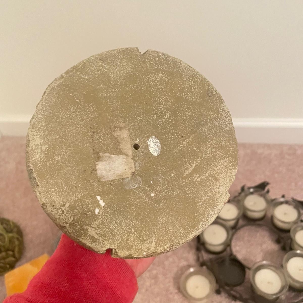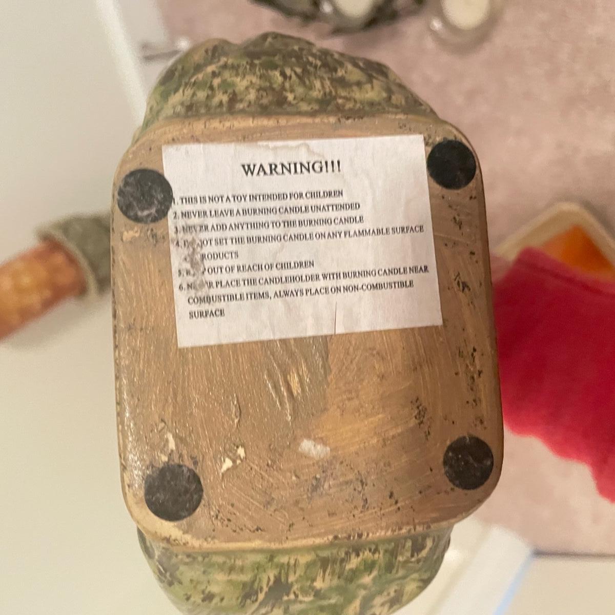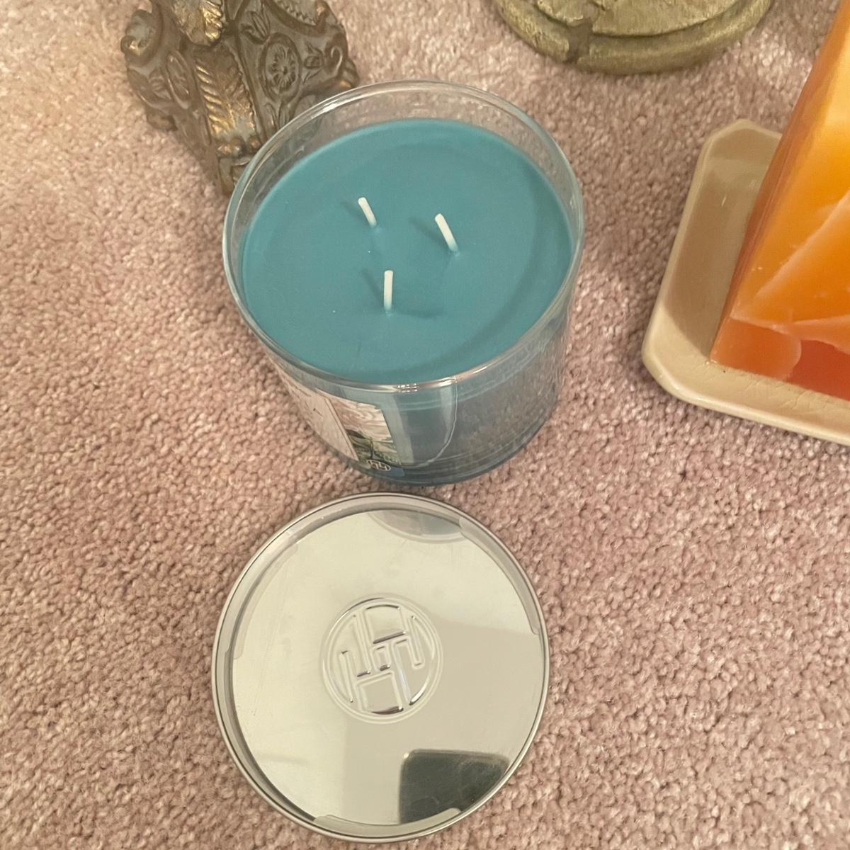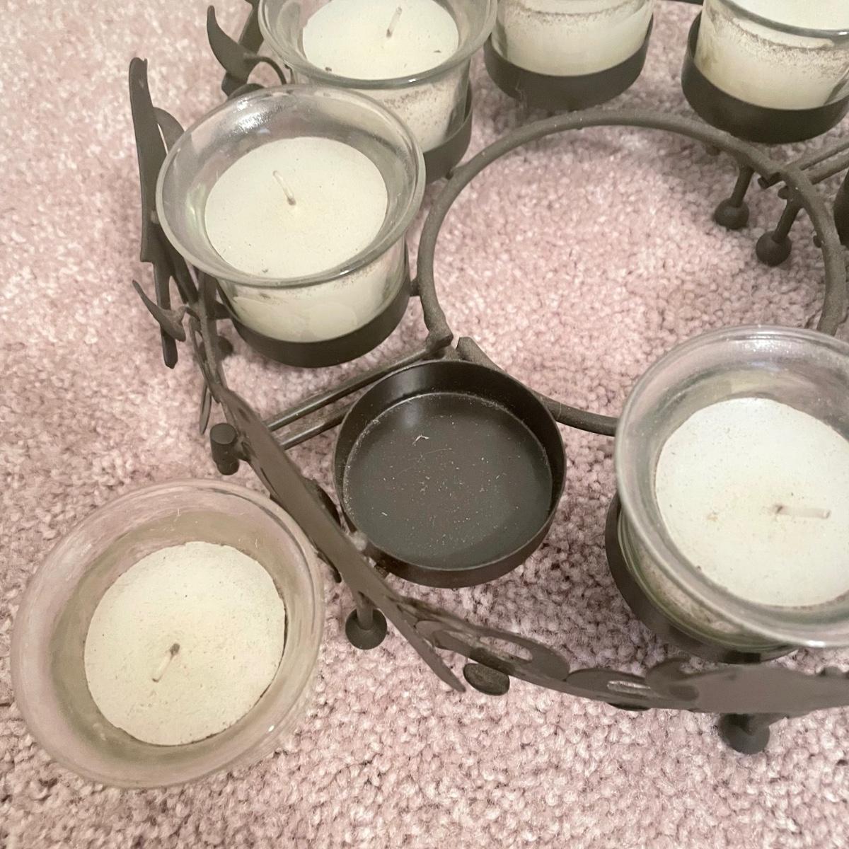 Decorative candle holders with scented wax candles. The rounded vase style holder is ceramic, the other two appear to be resin. Lot includes four pillar candles, a rounded candle, and a three wick 4”d Huntington Home Gardenia candle. Lot also offers a metal bird centerpiece with eight votives. The tallest candle stand is the 11” Grecian pedestal style. See images. Shipping available.
