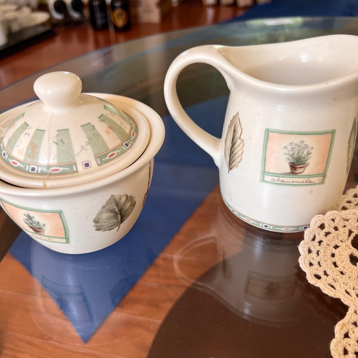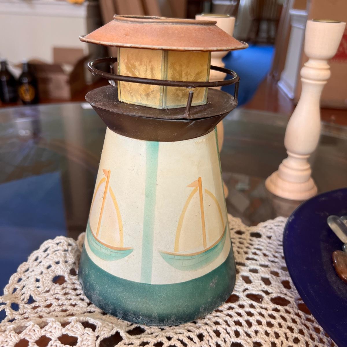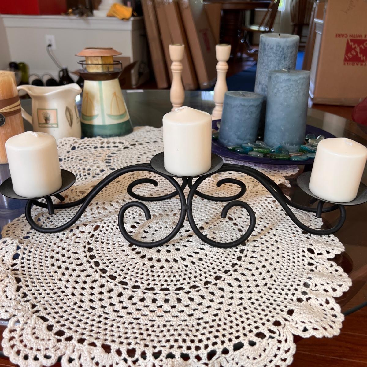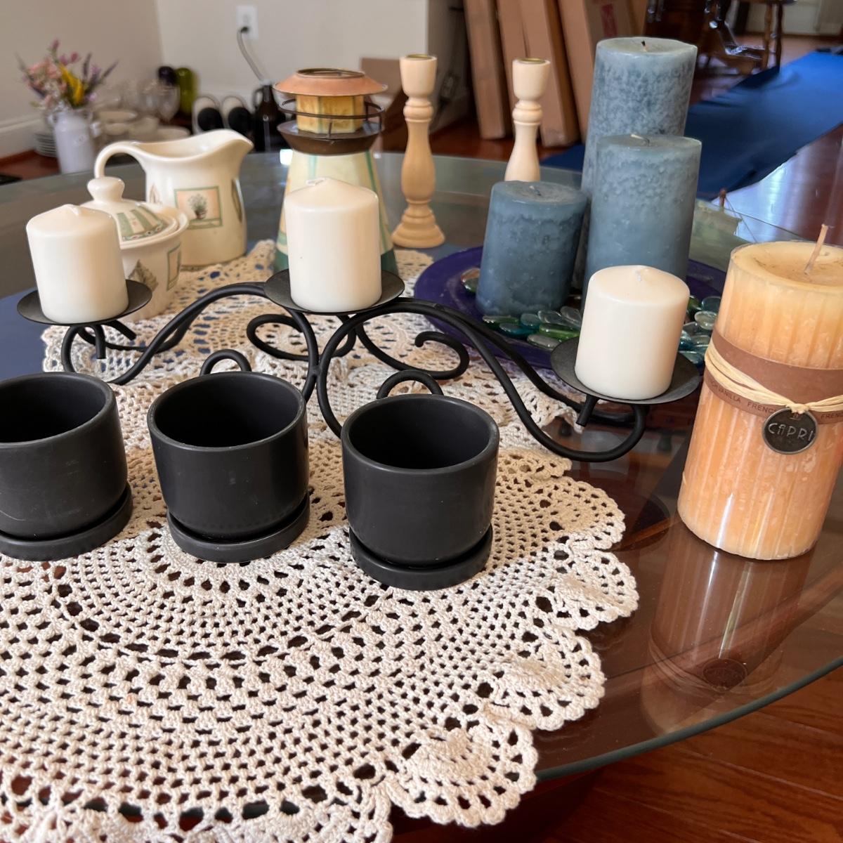 3 pillar iron table candle holder, frosted blue plate with glass beads and 3 candles, wooden candle sticks, lighthouse tealight candle holder, Capri french vanilla candle, 2 vintage crochet doilies, ceramic cream and sugar holders (sugar lid cracked).