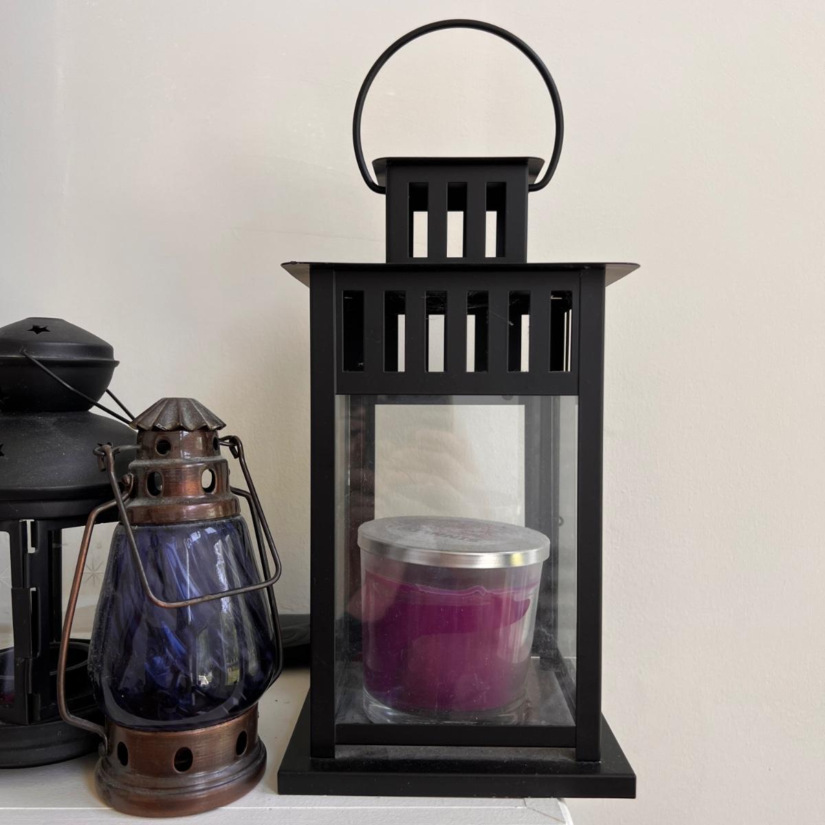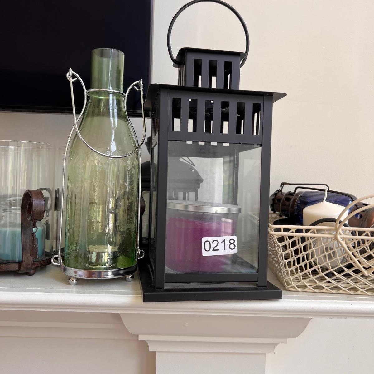 Big lot of decorative homewares including metal and glass hurricane holders, 2 wall sconces, lanterns. Also includes various candles.