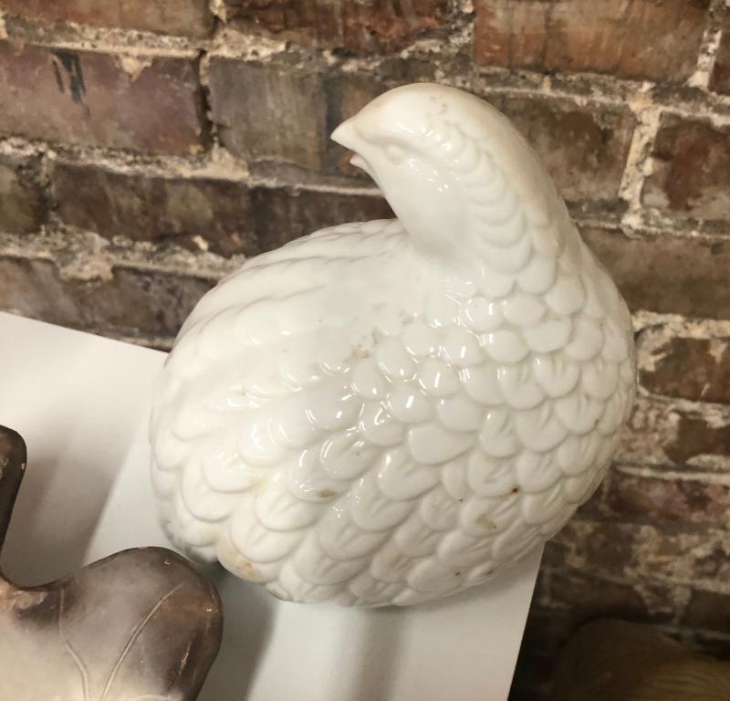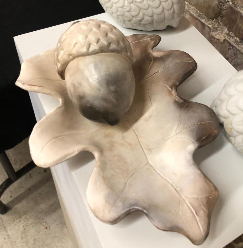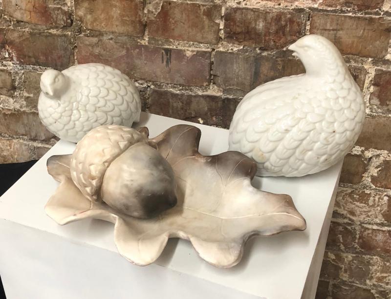 Modernist quails and an acorn on a leaf...Nice condition on these ceramic decorative items...