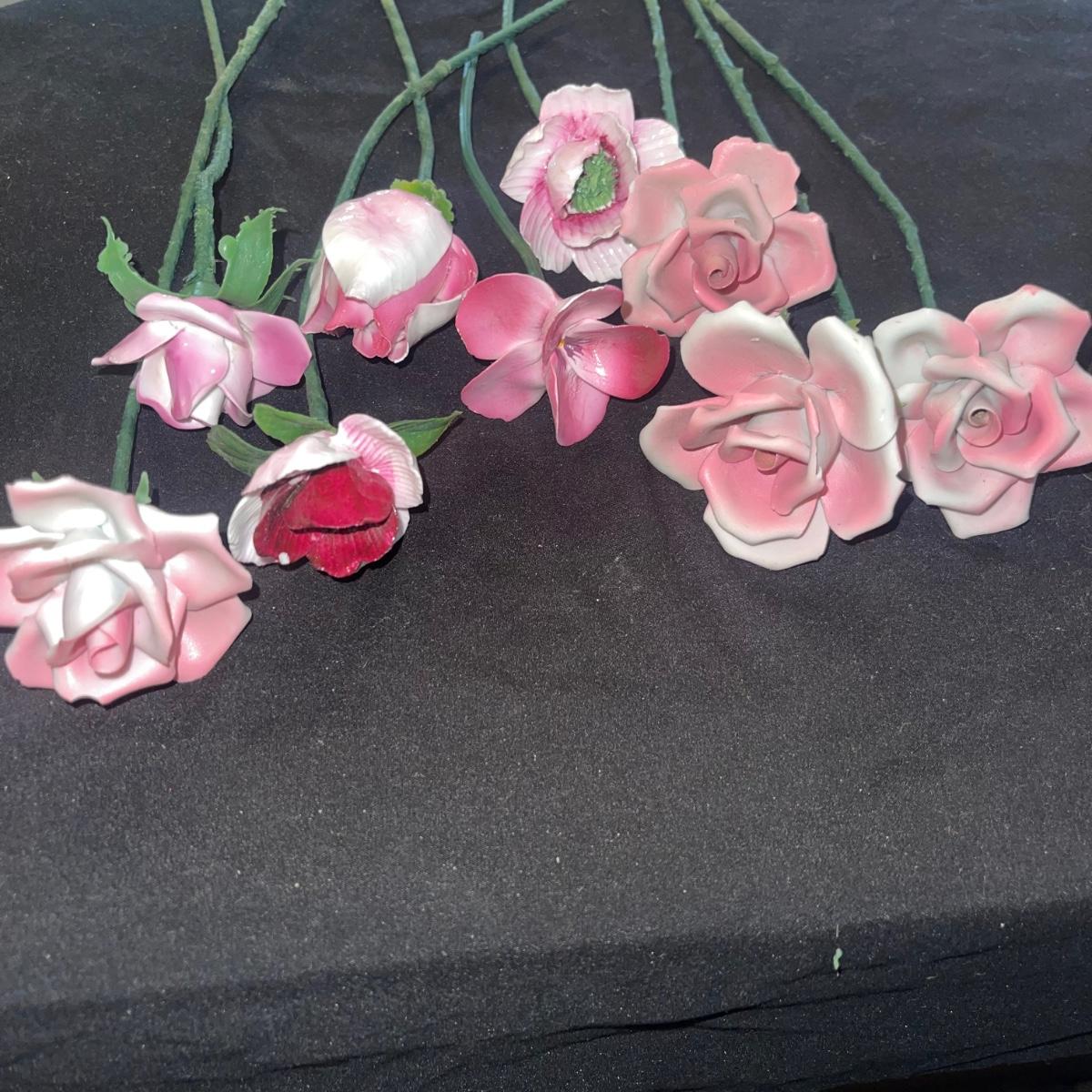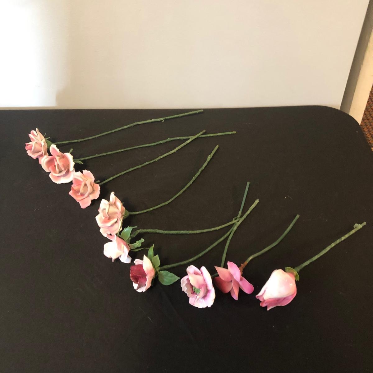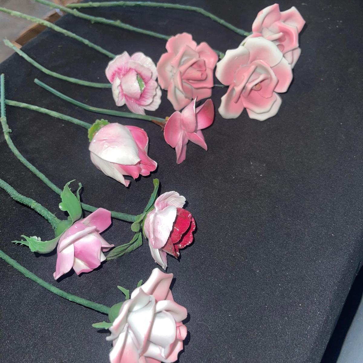 This lot has a variety of delicate ceramic flowers: 13 in all. There are 9 flowers on green stems. There is one Capodimonte, one Queen’s floral, and two Lenox flowers.