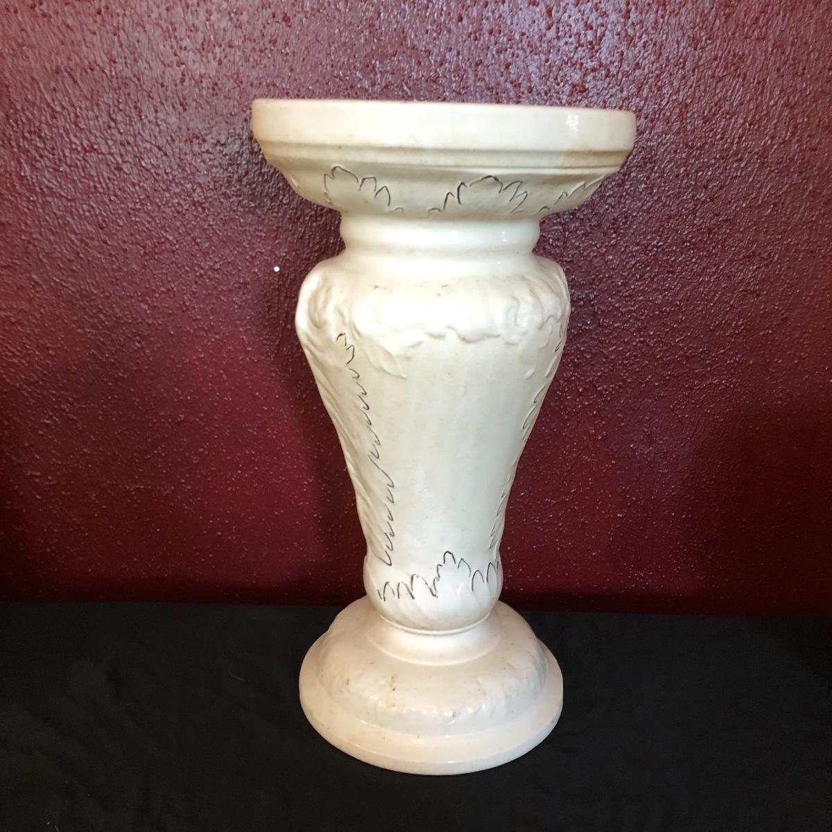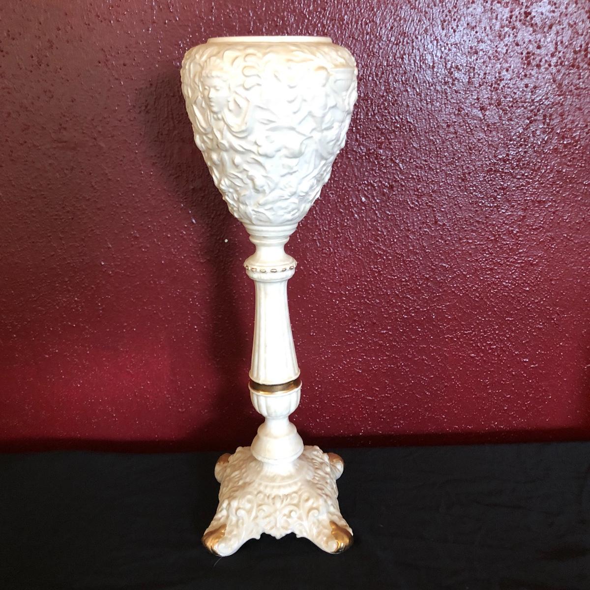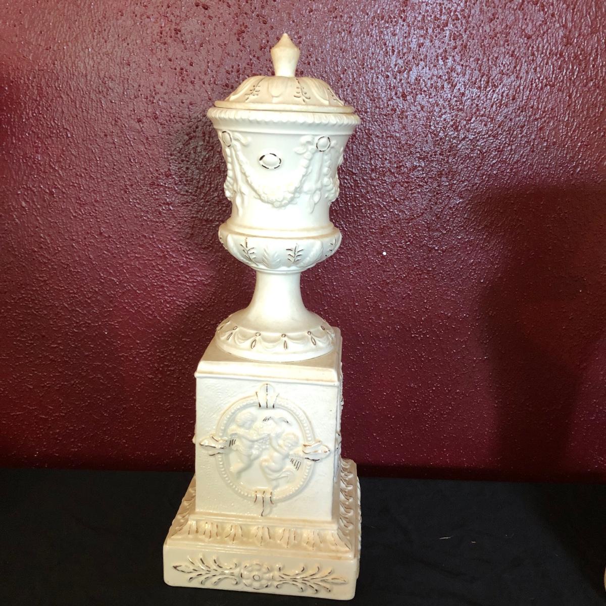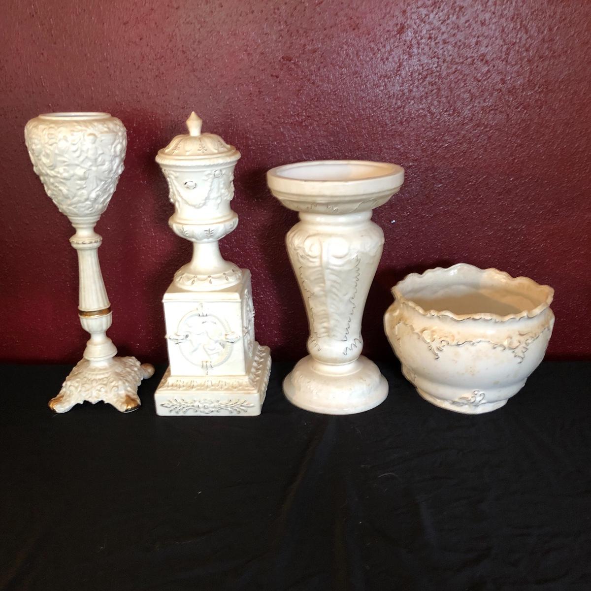 Lot includes pedestal urn, large vase, urn on base with cover and a large pot. All pieces have gold colored accents. Large pot has floral foam stuck inside. Tallest piece measures 6” x 6” x 19.75” tall.