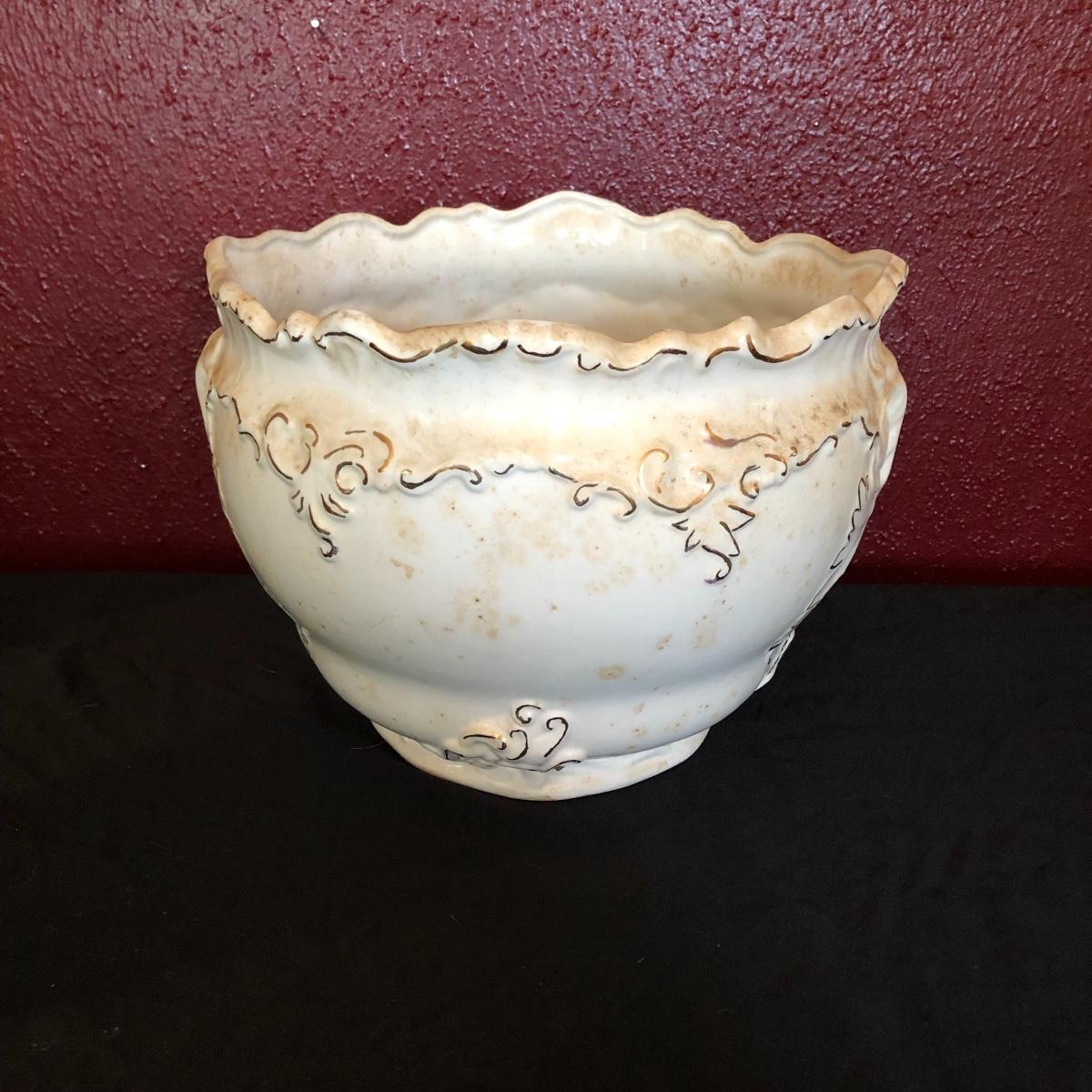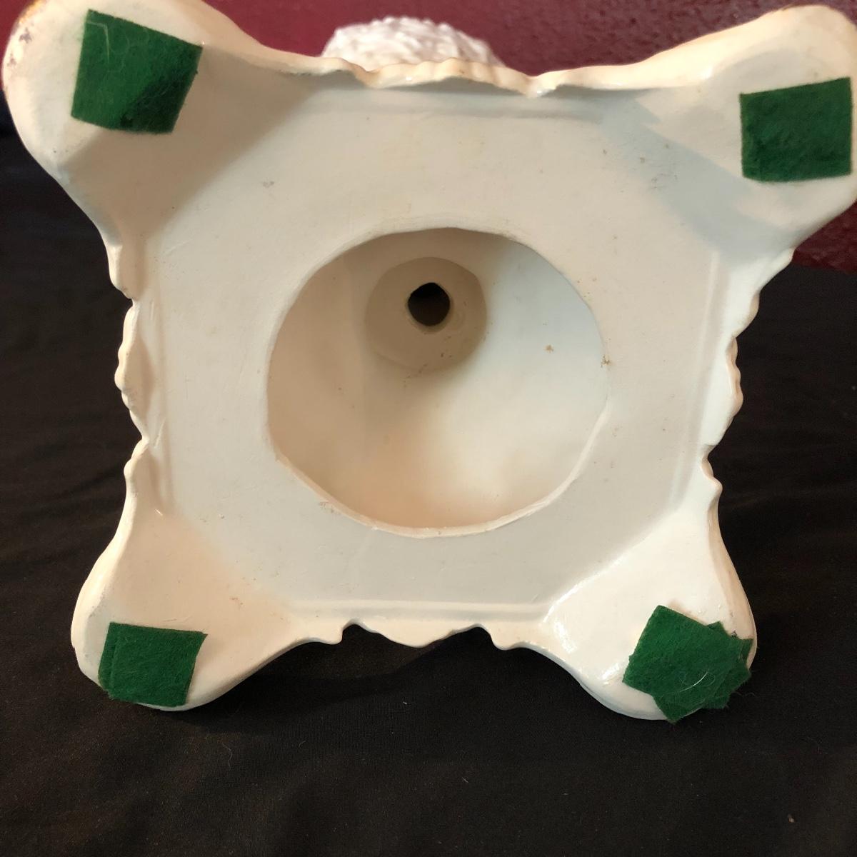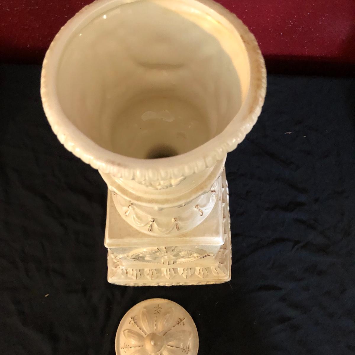 Lot includes pedestal urn, large vase, urn on base with cover and a large pot. All pieces have gold colored accents. Large pot has floral foam stuck inside. Tallest piece measures 6” x 6” x 19.75” tall.