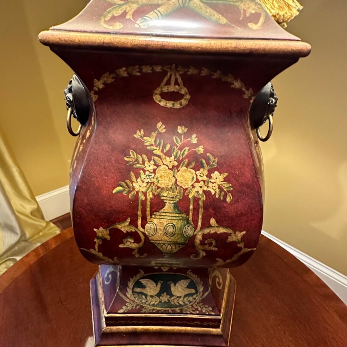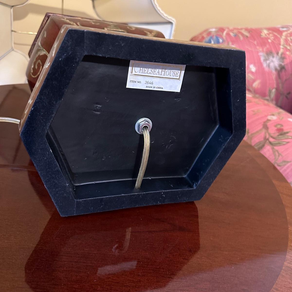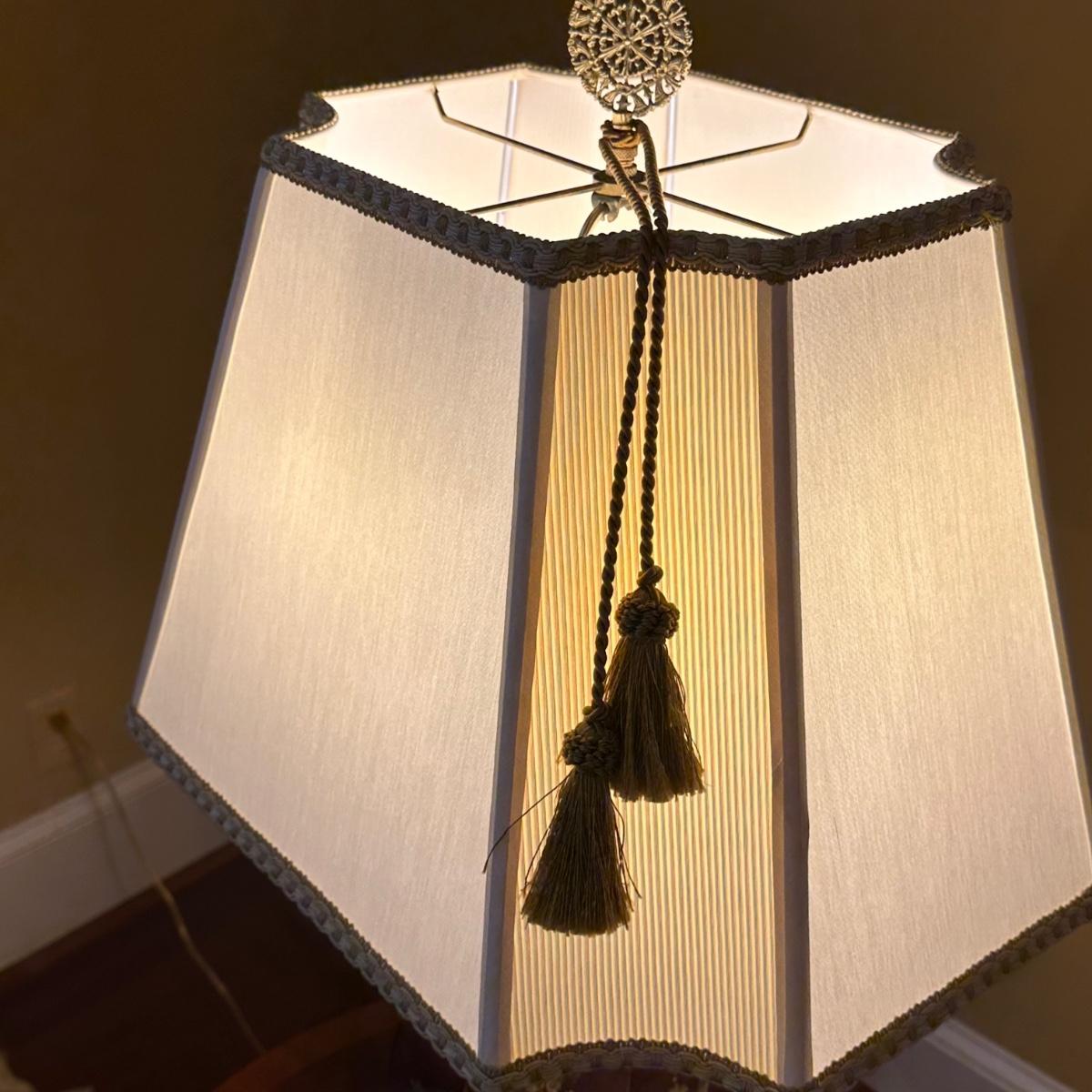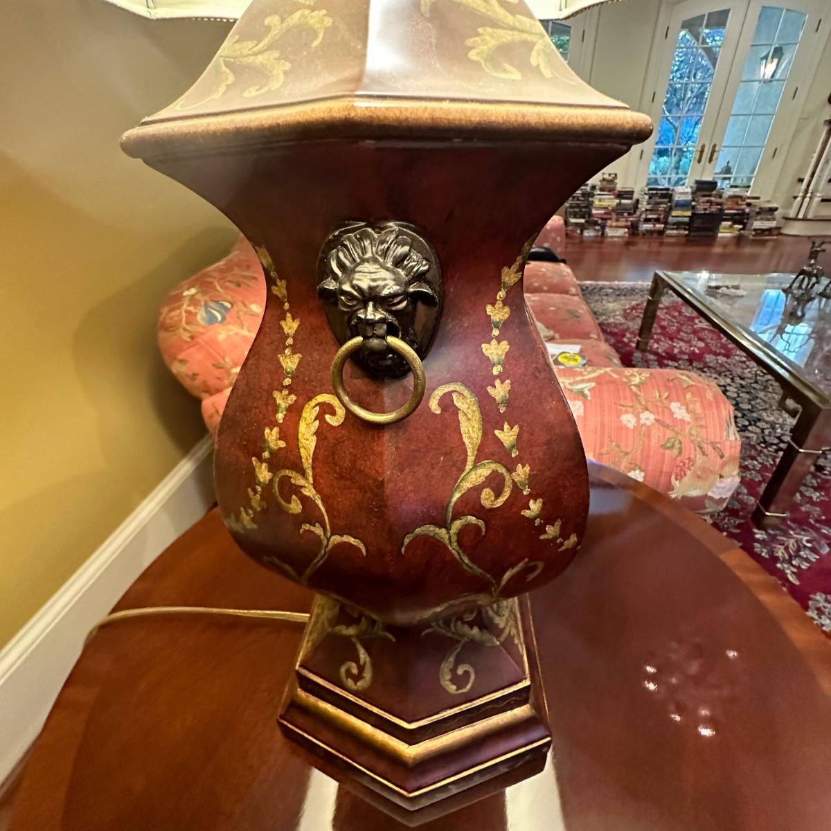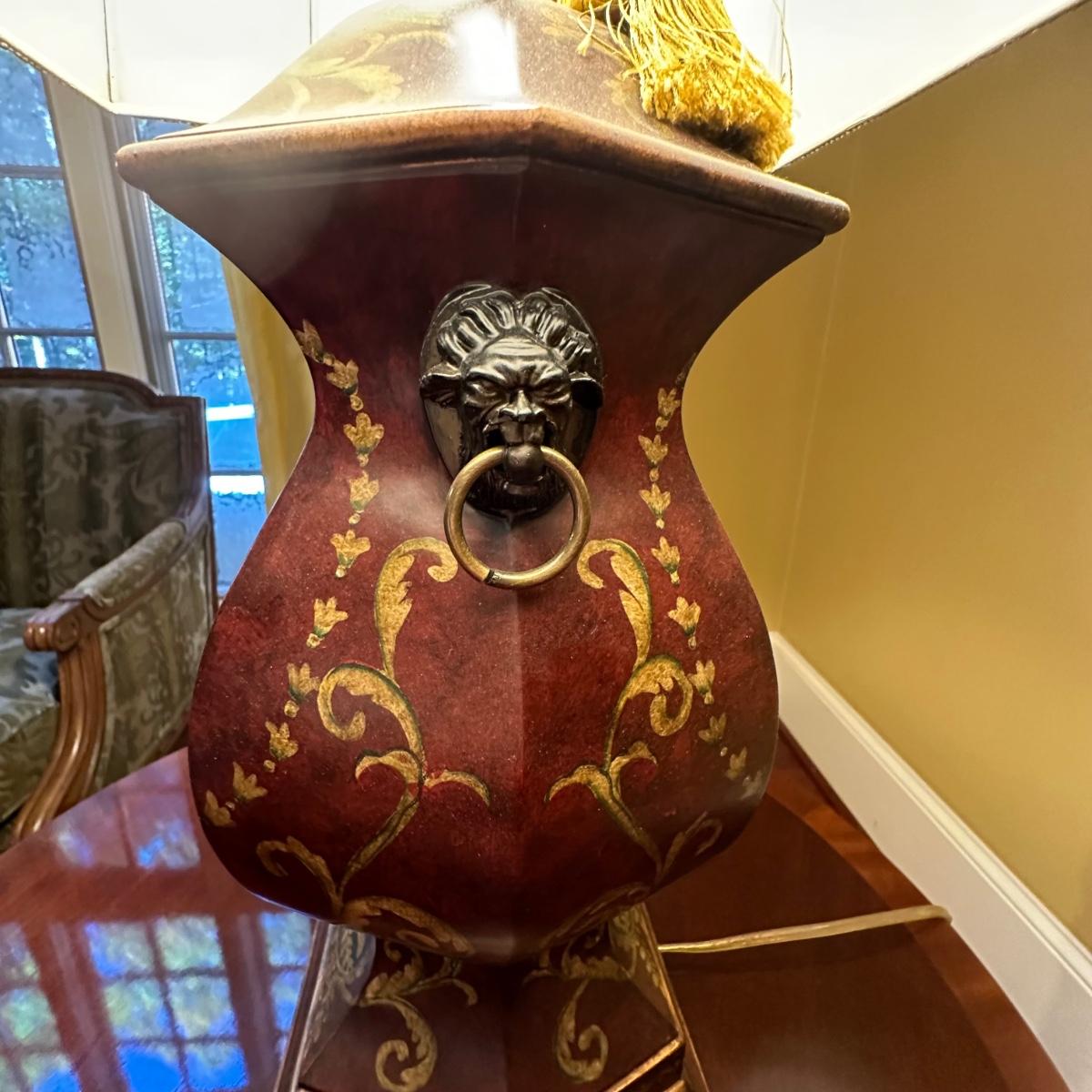 Chelsea House decorative lamp with French inspired design. Appears to be cast resin. Measures 10” x 8” x 33”H. Shade measures 19” x 15” x 13”H and has a 2 way switch. Shipping available. (SR-KL).