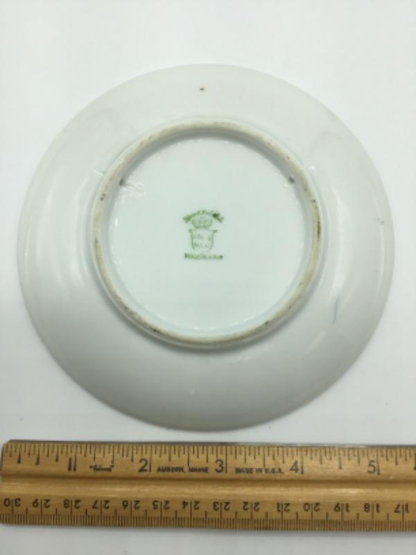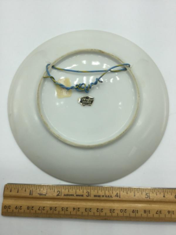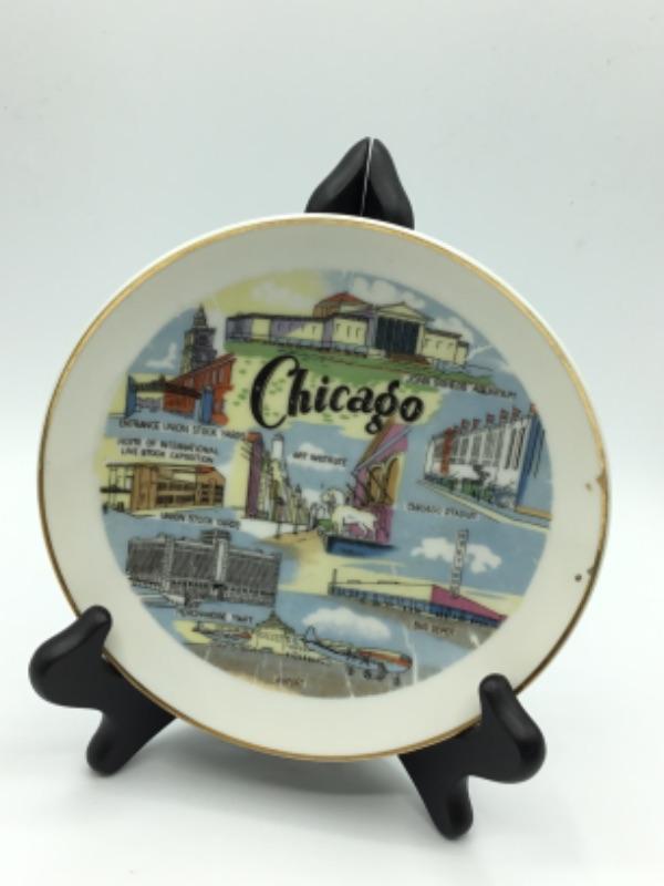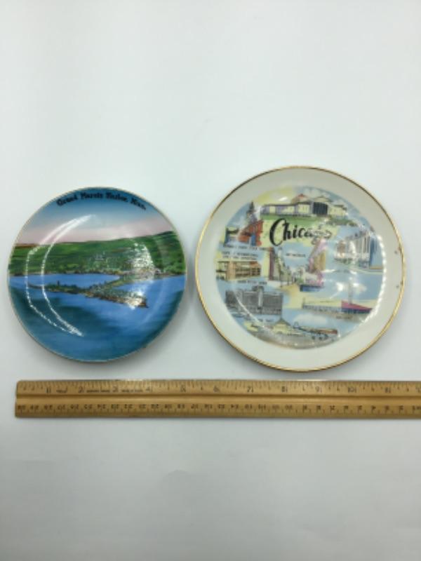 The “Chicago“ plate depicts Chicago landmarks on the front and contains a coated wire hanger for mounting on the wall. Plate is marked “Thrifco Ceramics: made in Japan“, And measures 6 1/8“ in diameter. “The Grand Marais Harbor“ plate measures 5 1/4“ in diameter, and is marked FMCO on the bottom.