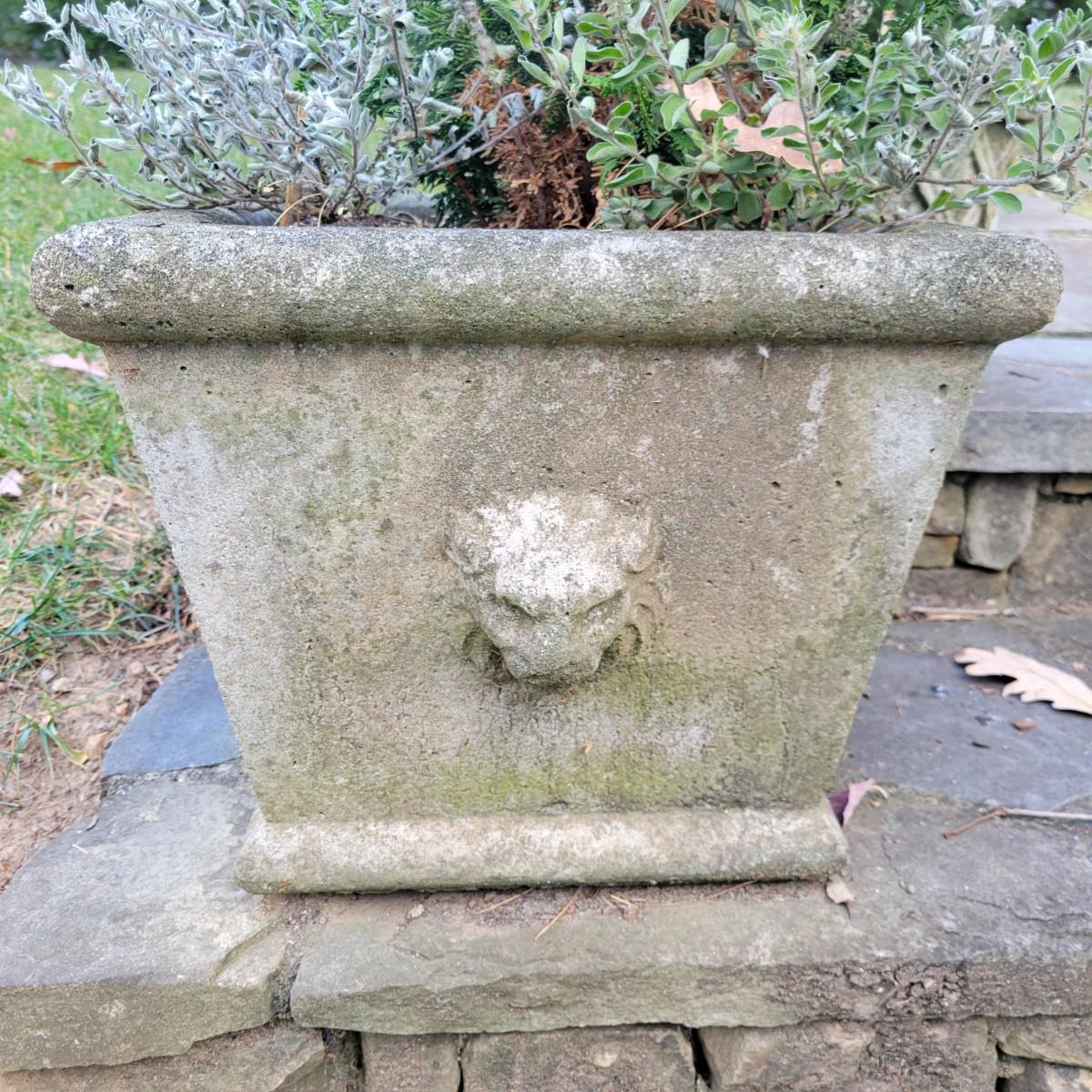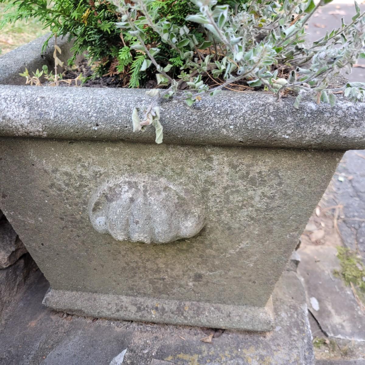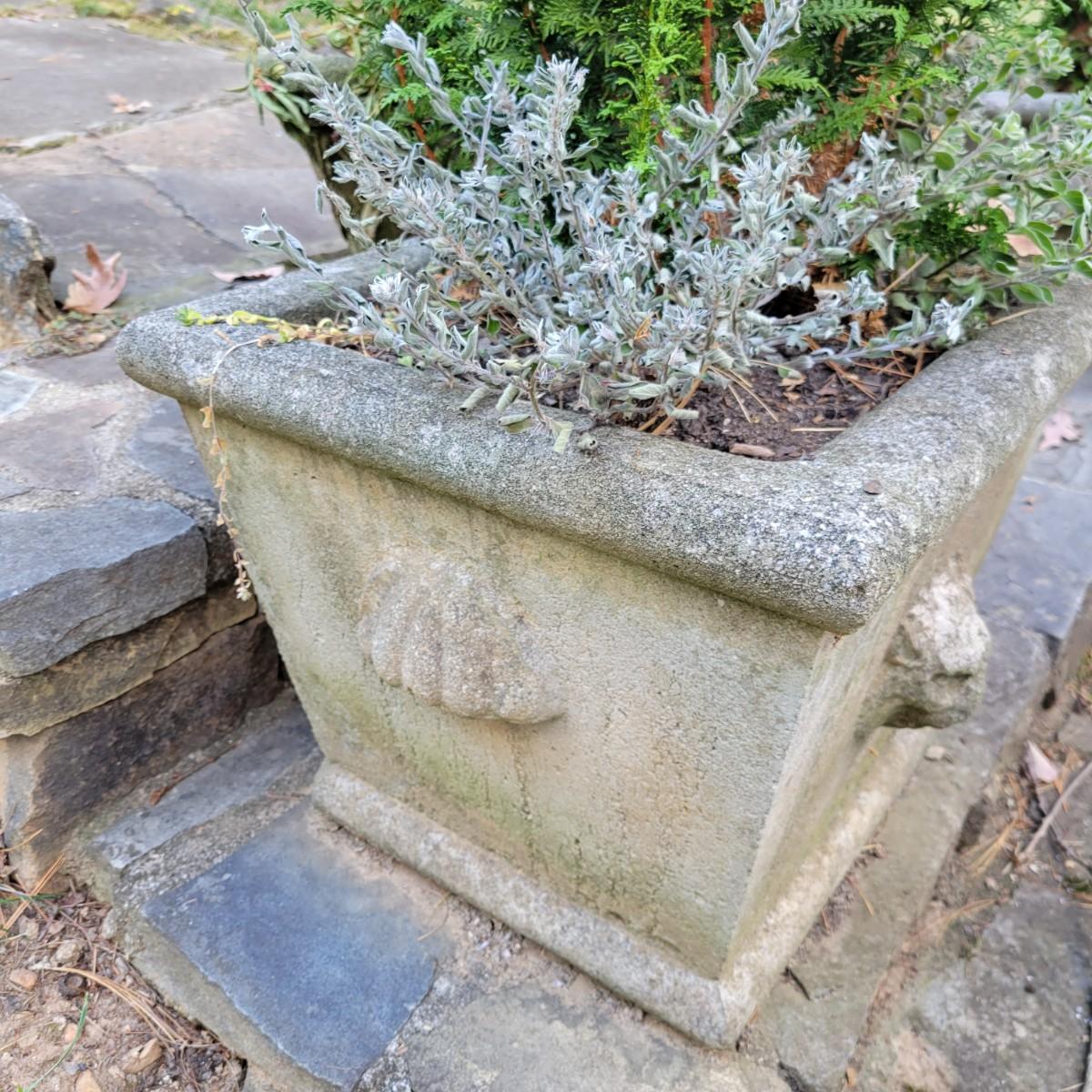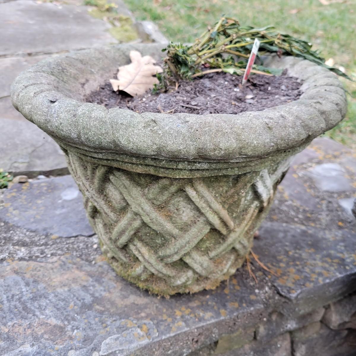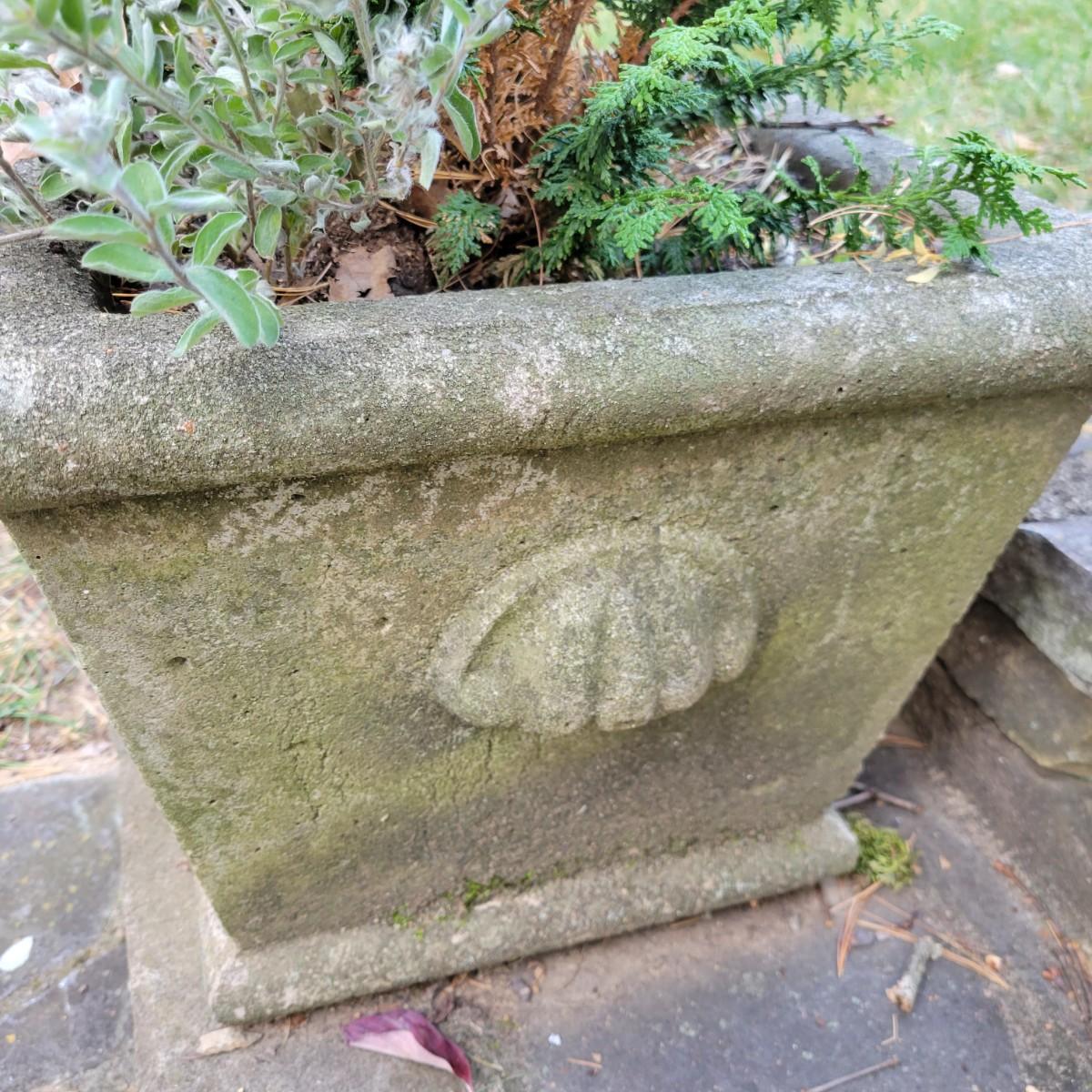 Four decorative concrete planters in two styles. Two are square that have a lions head and seashell on their sides and include the cedar trees planted in them. They measure approximately 16" x 16" x 13.5"H. The other two planters are round and have a basket weave pattern on them. One has some chipping on its base. Local pickup only. Winning bidder must bring assistance to help move and load this item due to its weight and/or size.