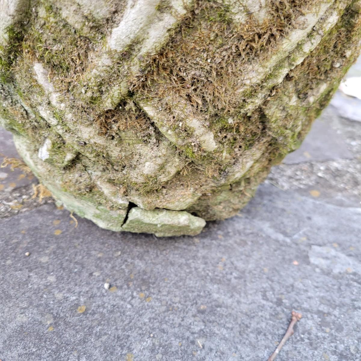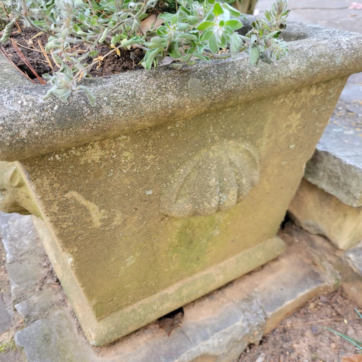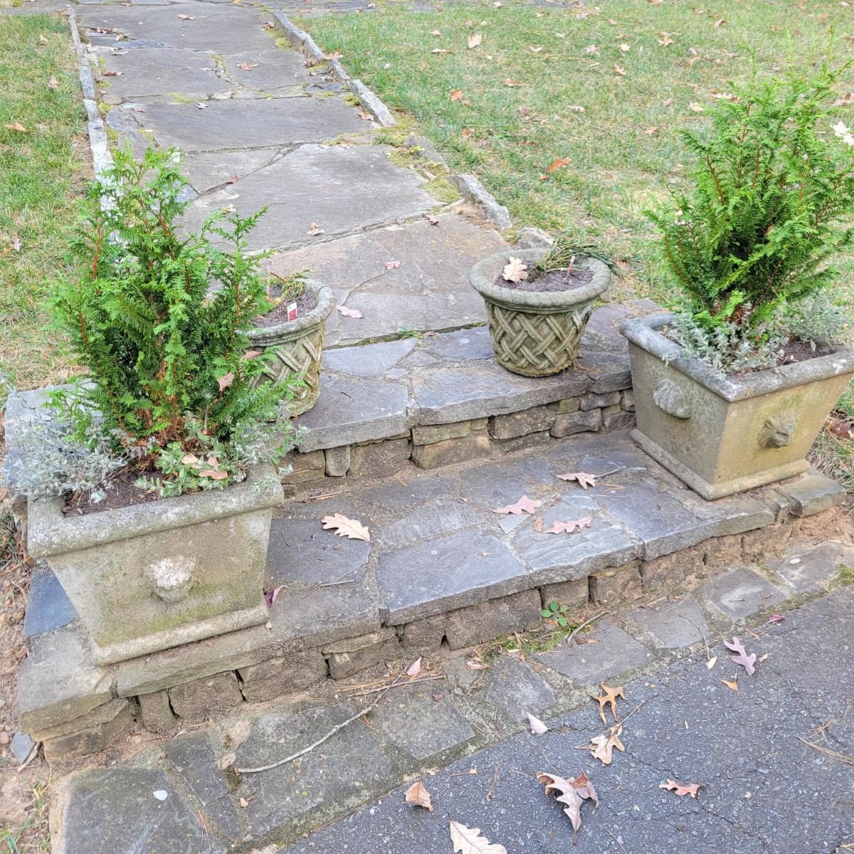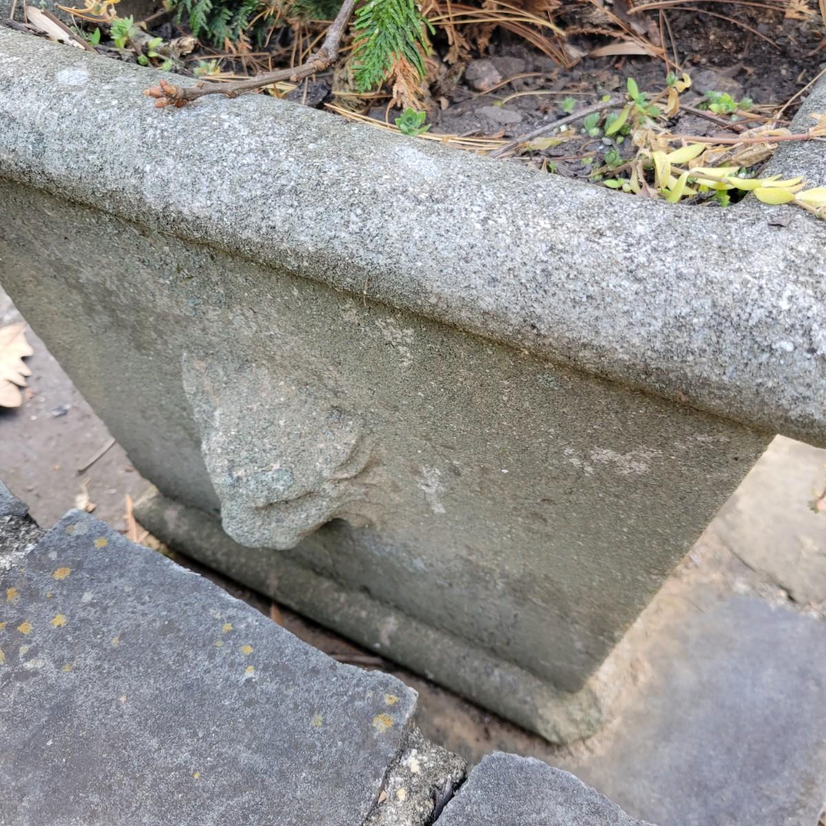 Four decorative concrete planters in two styles. Two are square that have a lions head and seashell on their sides and include the cedar trees planted in them. They measure approximately 16" x 16" x 13.5"H. The other two planters are round and have a basket weave pattern on them. One has some chipping on its base. Local pickup only. Winning bidder must bring assistance to help move and load this item due to its weight and/or size.