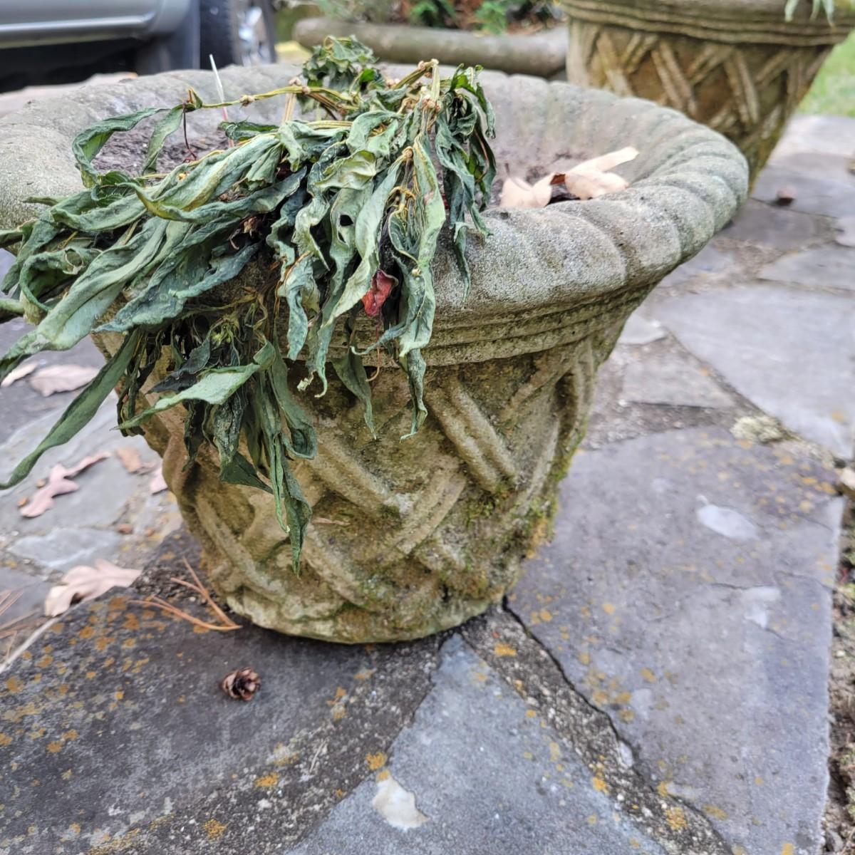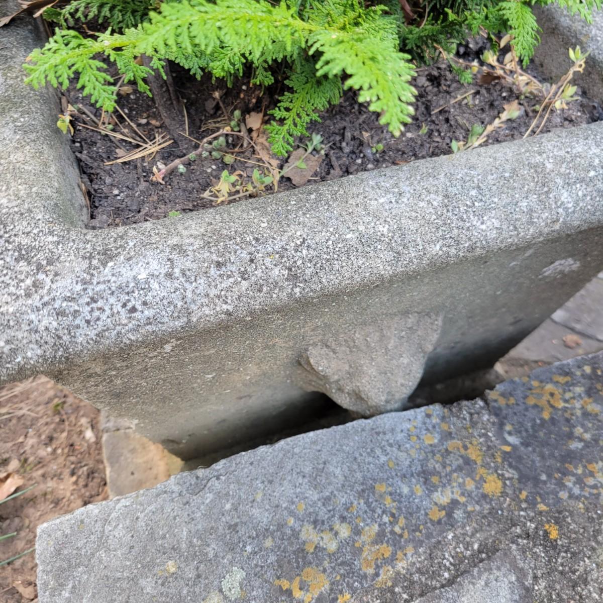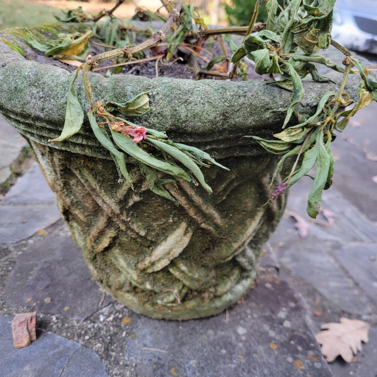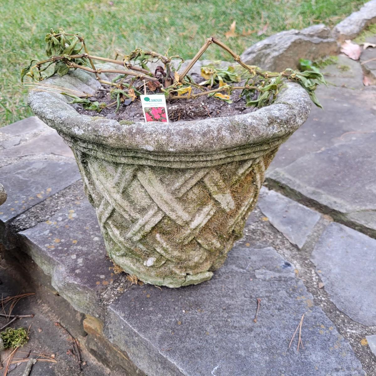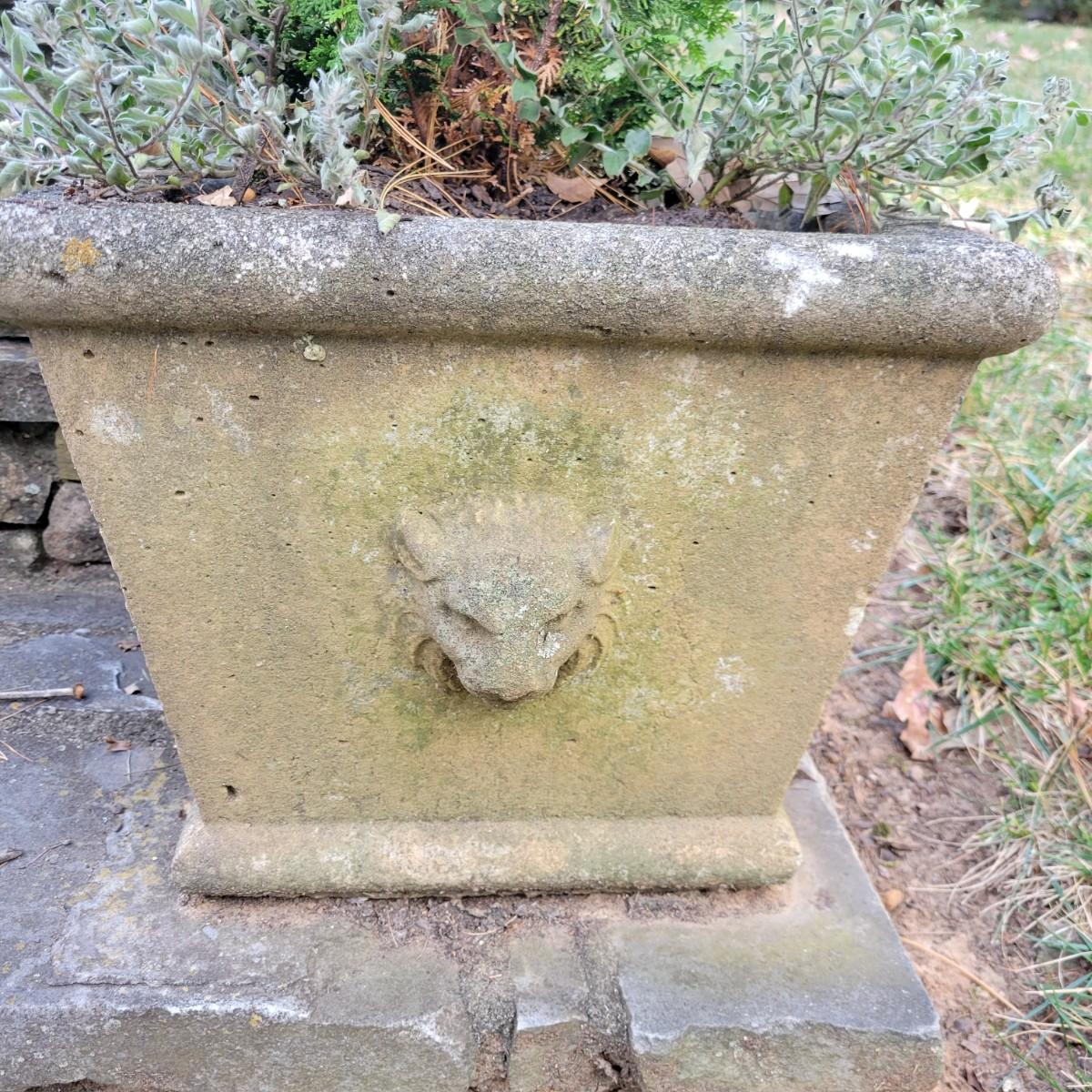 Four decorative concrete planters in two styles. Two are square that have a lions head and seashell on their sides and include the cedar trees planted in them. They measure approximately 16" x 16" x 13.5"H. The other two planters are round and have a basket weave pattern on them. One has some chipping on its base. Local pickup only. Winning bidder must bring assistance to help move and load this item due to its weight and/or size.