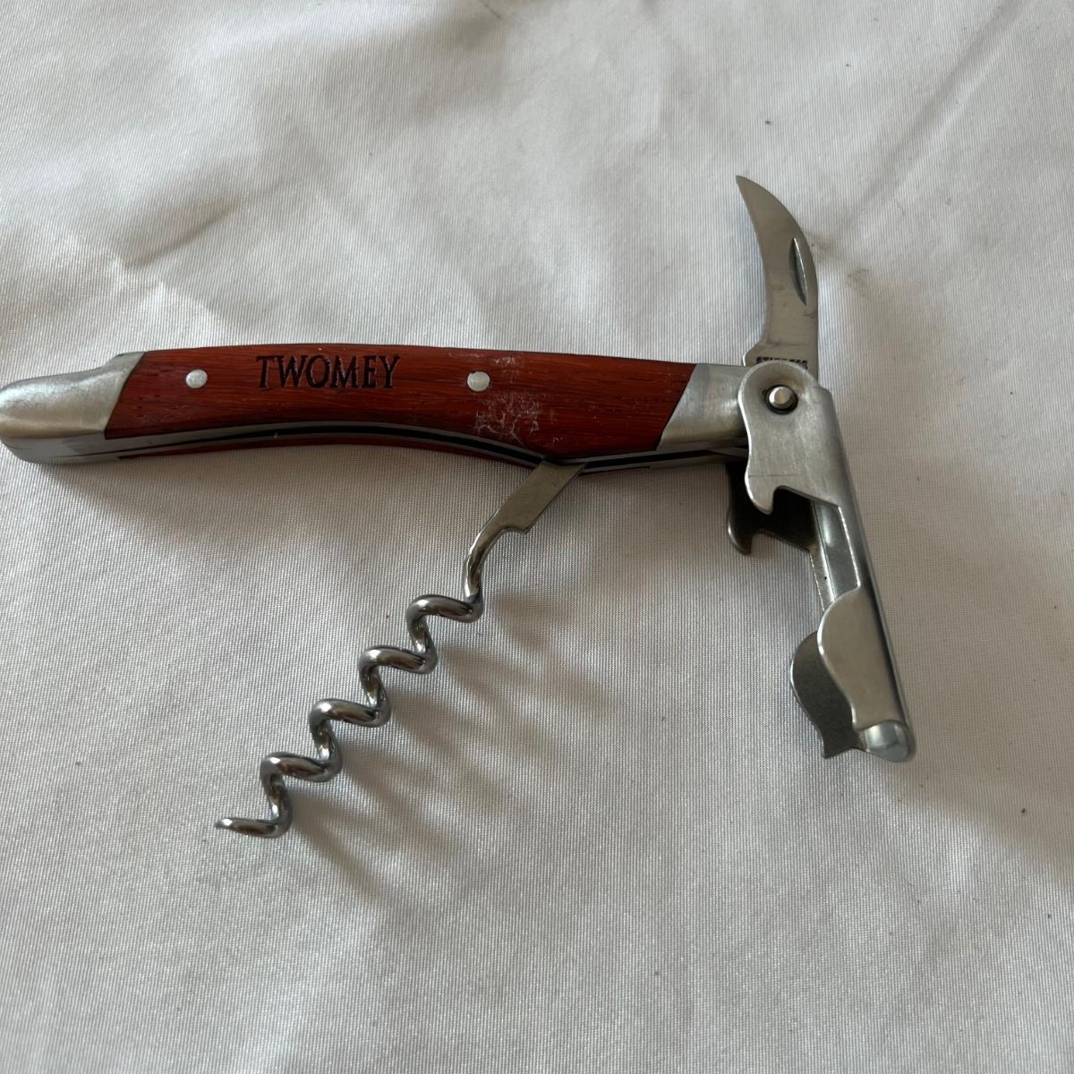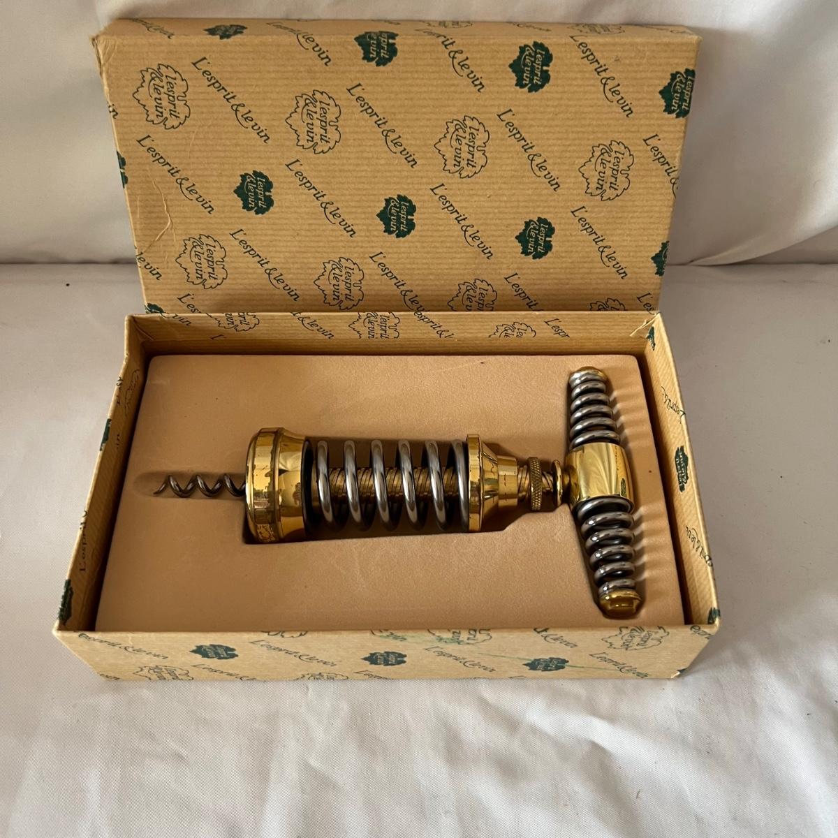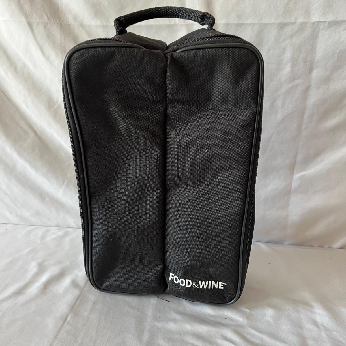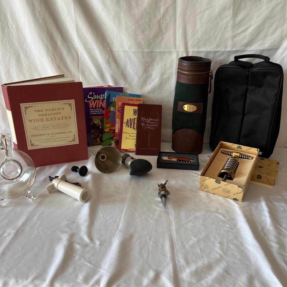 L’esprit & Le vin corkscrew in original box. Two pocket corkscrews, one wood and metal with “Silver Oak” and “Twomey” engraved measures 4.5” long and one plastic and metal Puigpull corkscrew measures 5.5” long. An Oxo wine opener with a built-in foil cutter and a plastic Vacu Vin wine saver. Also a metal filter/aerator and a Dewar's 12 wine stopper, that appears to be brass. An Orvis and Company bottle carrier made of forest green canvas and leather measures. 4.5” D x 13.5”H and is fleece lined. A black canvas Food and Wine bottle carrier with two separate zippered pockets for bottles measures 8” x 13” x 4”H. A delicate glass table-top wine decanter measures approximately 9” x 6.5” x 8”H. Several books on wine, The World’s Greatest Wine Estates, Hugh Johnson’s Pocket, Encyclopedia of Wine, The Wine Avenger, Food and Wine Wine Guide 2007, The Wines of burgundy, Simply Wine, and Wine Savvy.