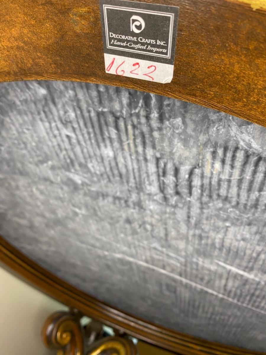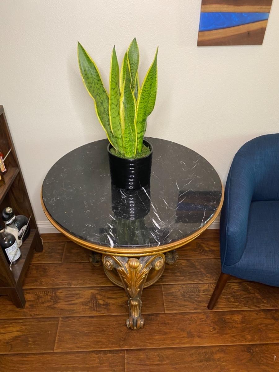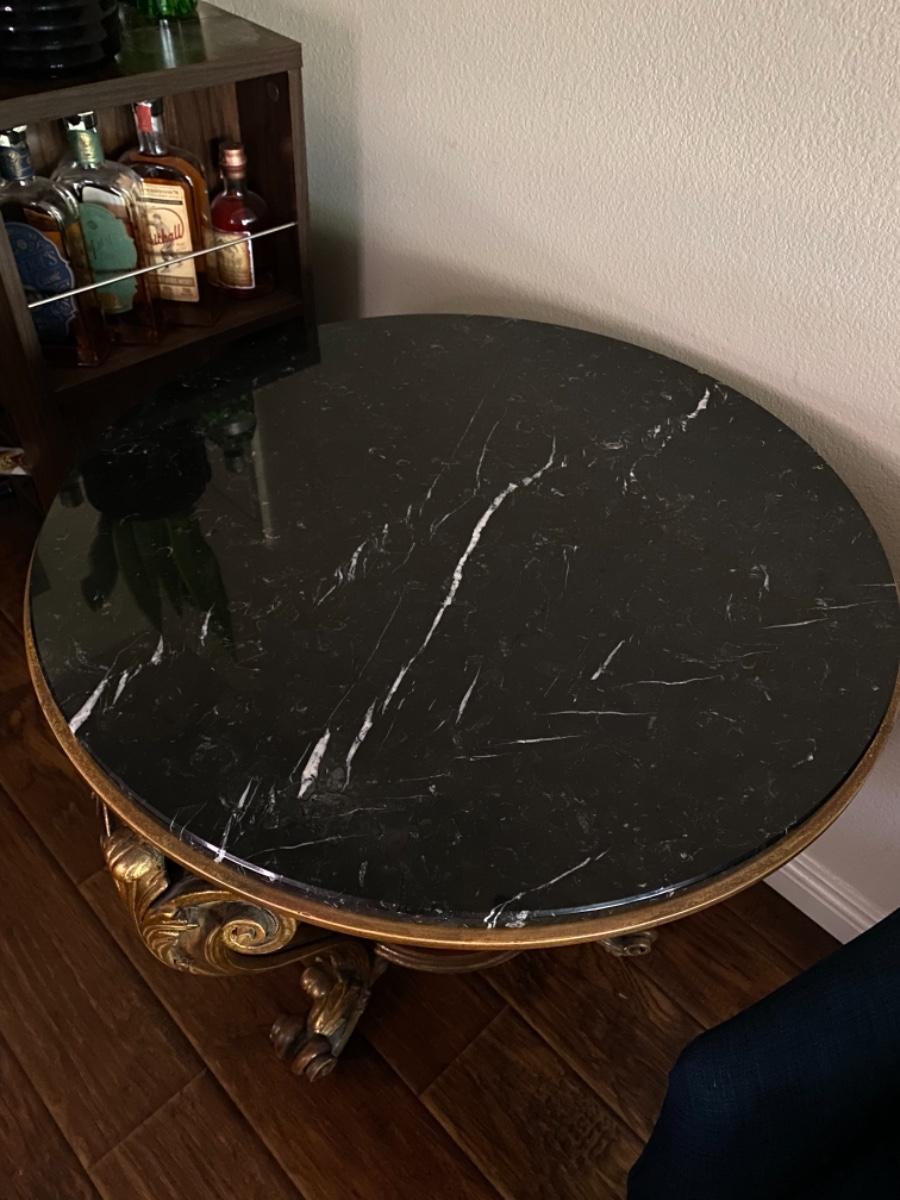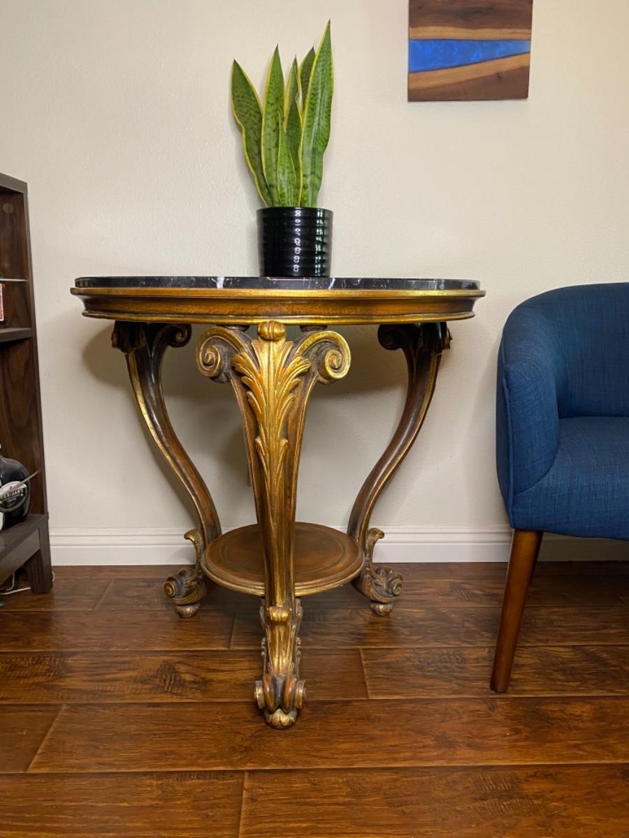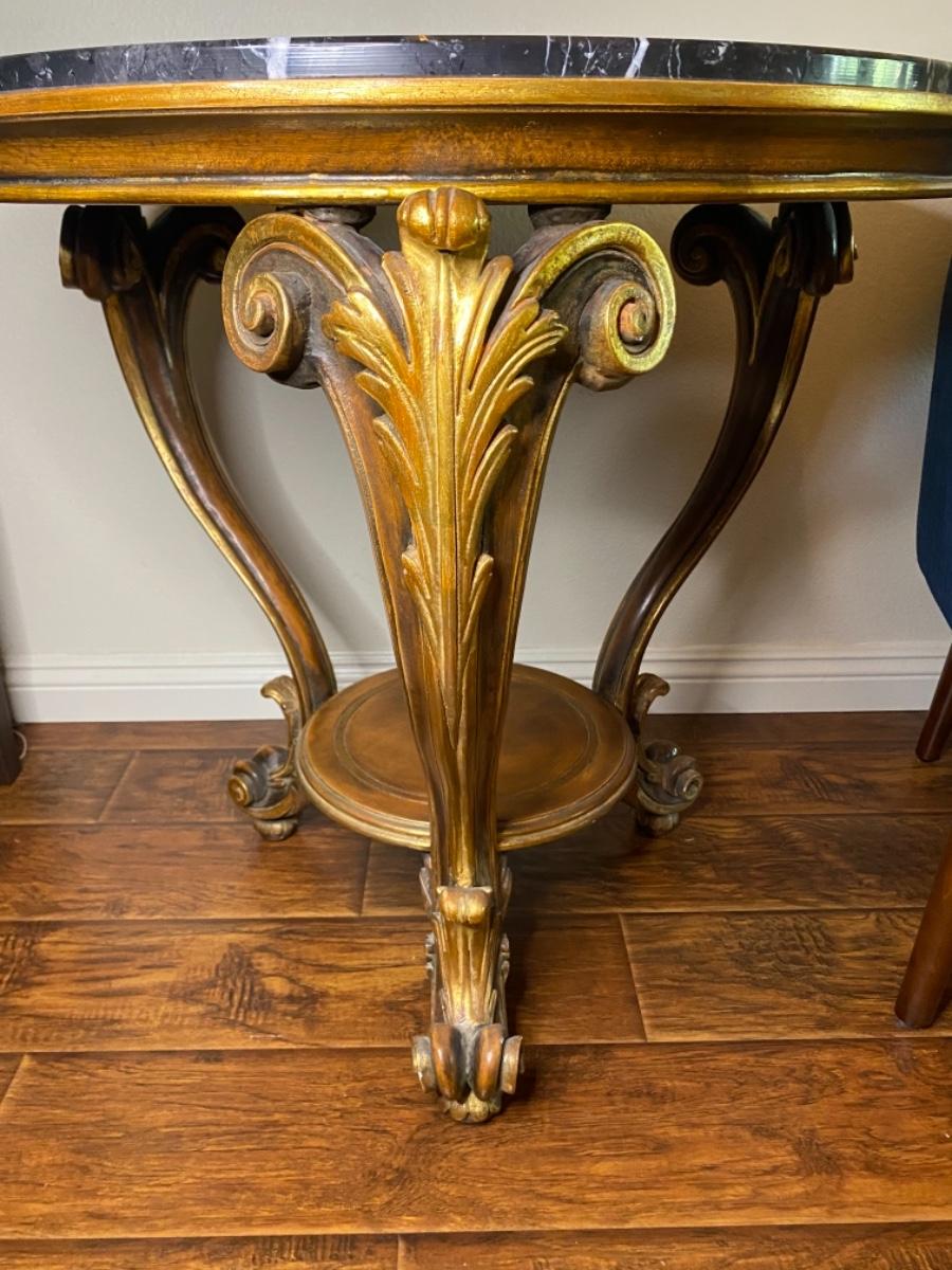Louis XV style round carved wood table with scroll and leaf design, hand-painted medium brown finish, antiqued gold-leaf trim and black Marquina marble top. Made in Italy. Good condition with some light wear and tear on the gold leaf.