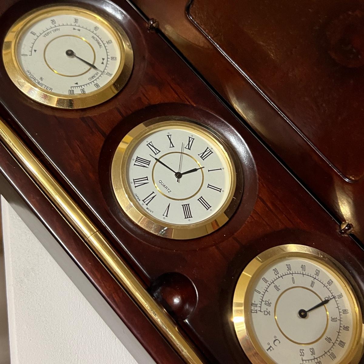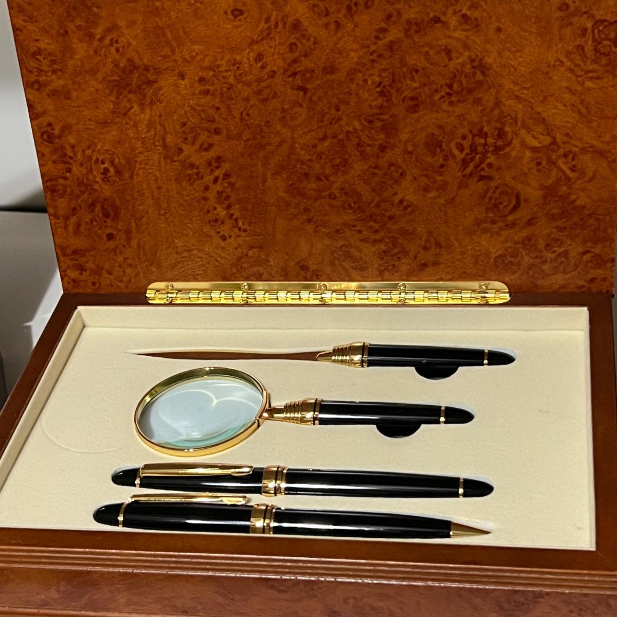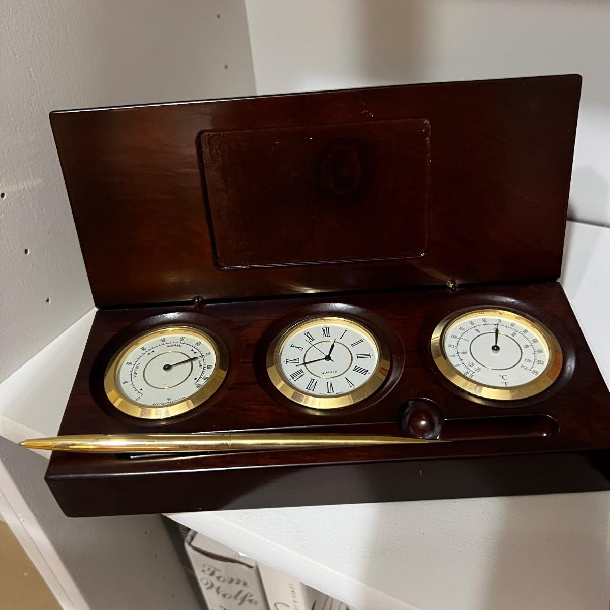 Laquered Wood Box with Pen, Clock and Barometer. Executive Brass Pen, Letter Opener and Magnifier Gift Set. SEIKO world airplane desk clock.