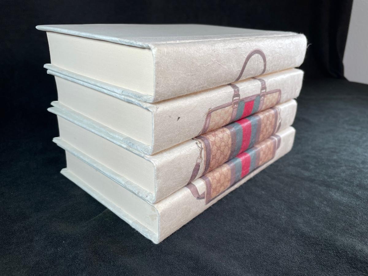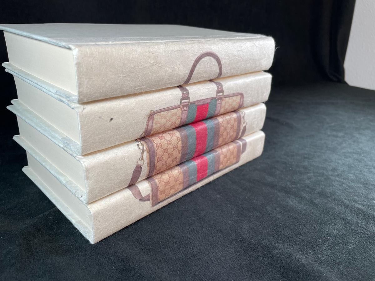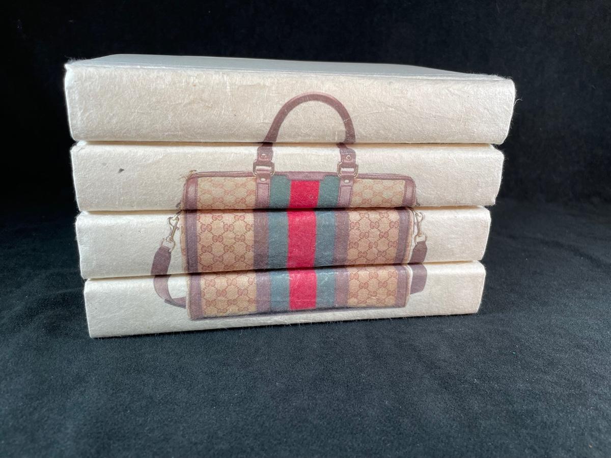 An attractive decor item--4 books, recovered, showing an image of a Gucci handbag