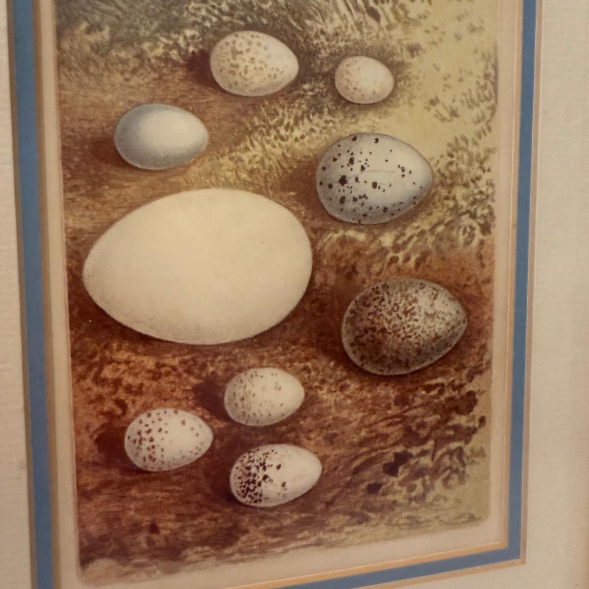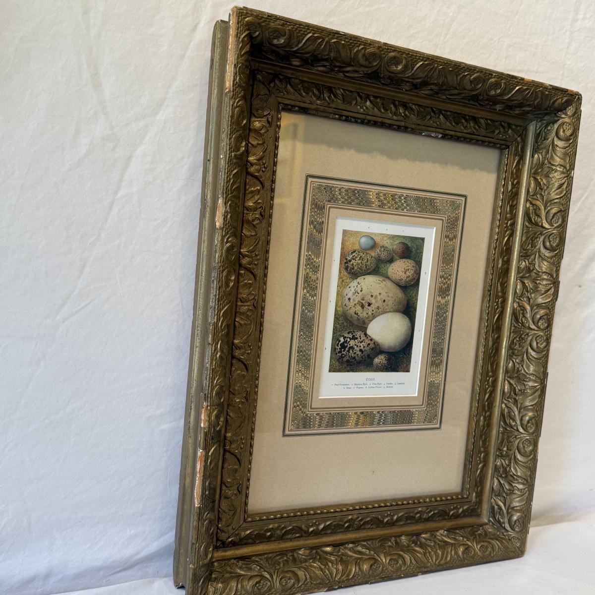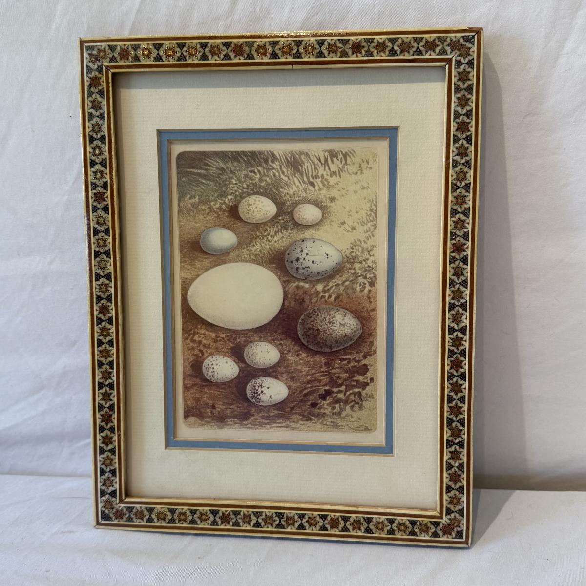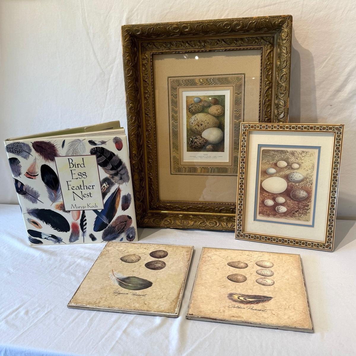 Two framed prints of artistic eggs, two tiles, and the book “Bird Egg Feather Nest”. The larger frame is ornate wood with a golden finish. It has some chips in the frame and the frame measures 14.5” x 18.5”. The smaller frame is a beautiful inlaid design in a wood border. A small chip is seen on the corner and the back is taped on. Both prints are framed behind glass. The two tiles have hardware attached to hang.