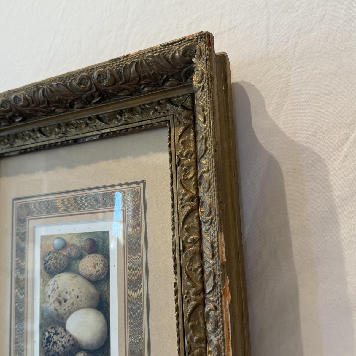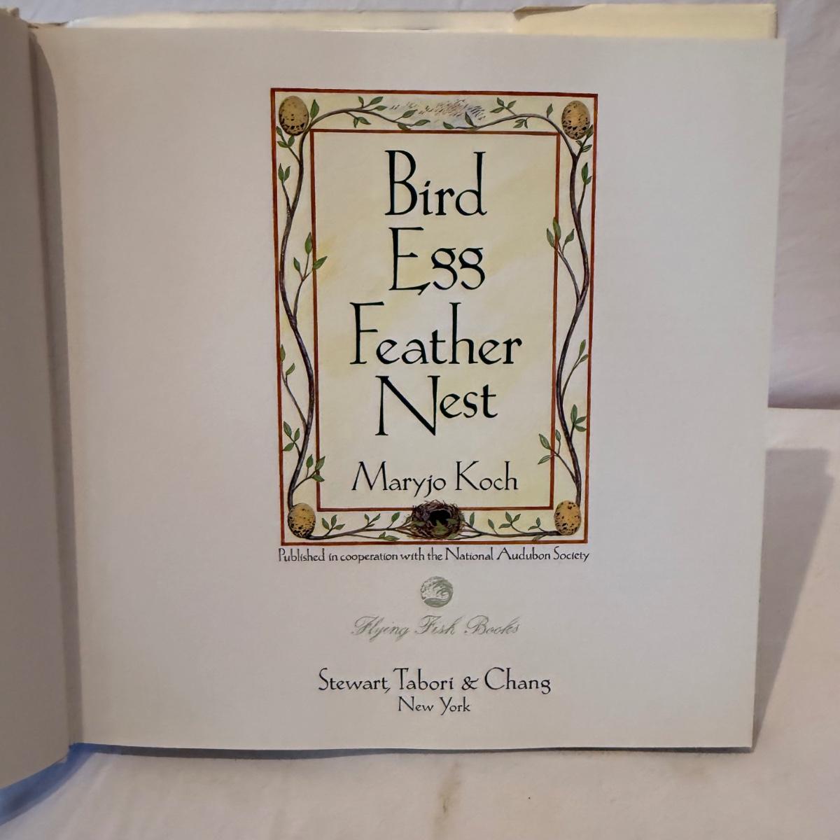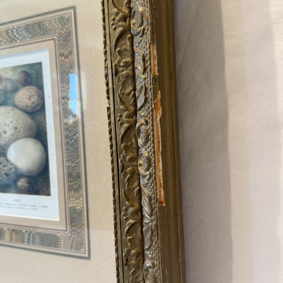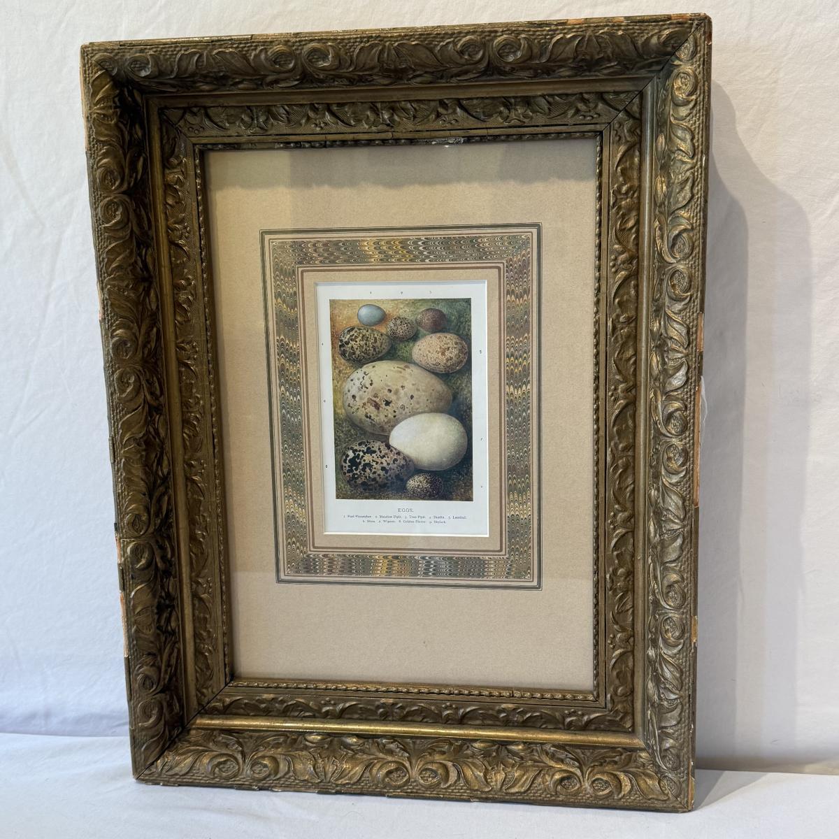 Two framed prints of artistic eggs, two tiles, and the book “Bird Egg Feather Nest”. The larger frame is ornate wood with a golden finish. It has some chips in the frame and the frame measures 14.5” x 18.5”. The smaller frame is a beautiful inlaid design in a wood border. A small chip is seen on the corner and the back is taped on. Both prints are framed behind glass. The two tiles have hardware attached to hang.